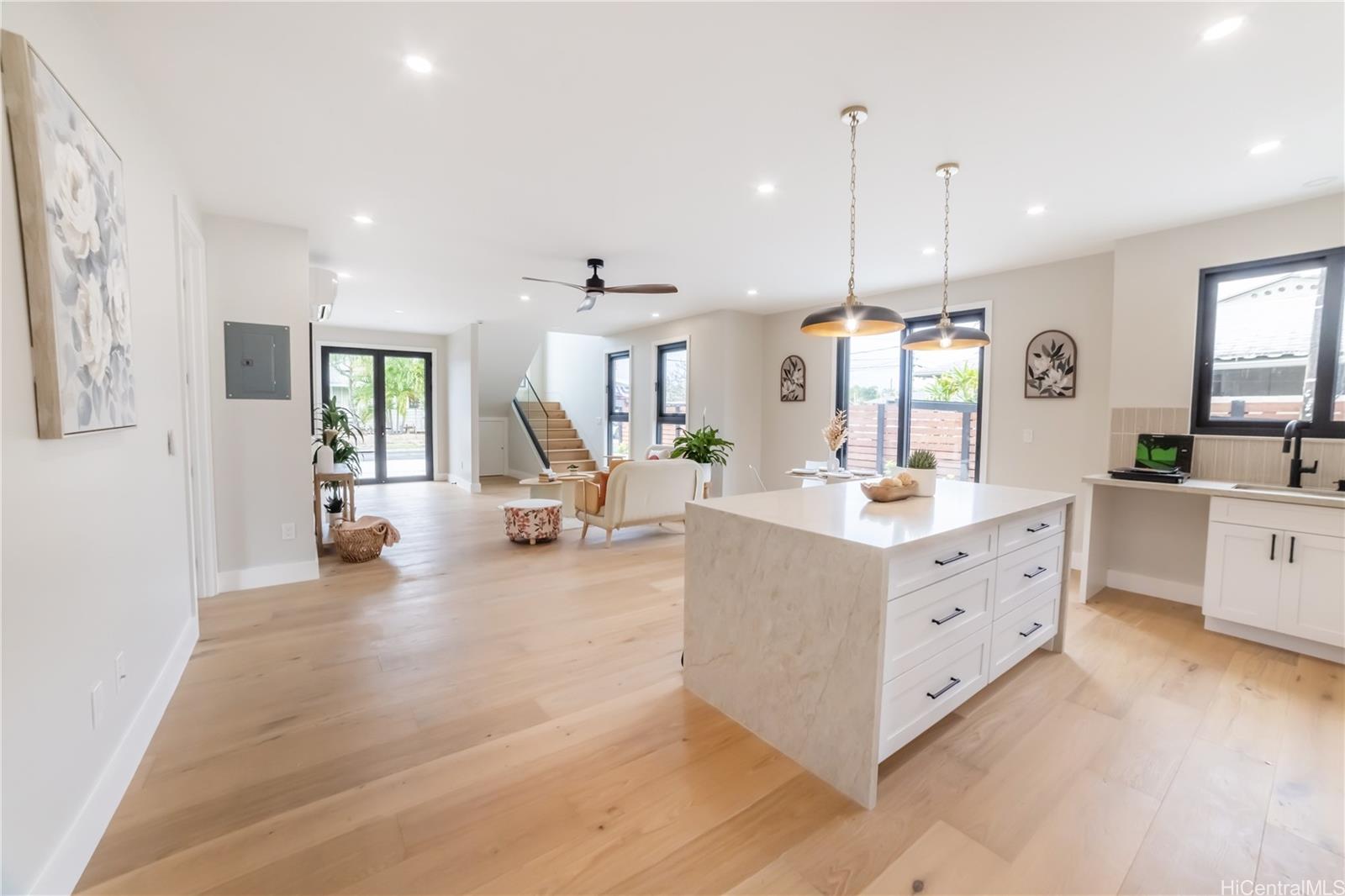 Experience modern island living in this BRAND NEW single-family home, thoughtfully designed with open spaces and high-end finishes throughout. Located in desirable Kailua, this newly built residence blends contemporary architecture with the relaxed comfort of Hawai'i living. The home features a bright, open-concept floor plan (allowing for multi generational living) with soaring ceilings, recessed lighting, and wide-plank flooring.The designer kitchen is a showstopper, offering custom wood cabinetry, quartz countertops, stainless steel appliances, and a spacious island perfect for entertaining. Seamless indoor-outdoor flow creates an inviting space for everyday living and gatherings. Bathrooms are beautifully appointed with modern fixtures, large-format tile, and spa-inspired details, including a luxurious walk-in shower and freestanding soaking tub. Thoughtful finishes and neutral tones throughout create a calm, sophisticated aesthetic. Listing by: Five Star Realty, Inc. (808) 741-5789