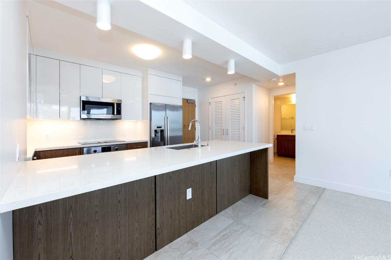 Experience modern island living at Azure Ala Moana, an ultra-convenient high-rise residence completed in 2021. This residence is positioned across from Ala Moana Center and just two blocks from Ala Moana Beach Park, putting dining, shopping, entertainment, and beaches just minutes away. Inside, a bright 2-bedroom, 2-bath floor plan is elevated by high-end features, including a designer kitchen appointed with Bosch appliances and two-tone wood and white lacquer cabinetry. Additional highlights include three split AC zones, sapphire Pacific Ocean views from the lanai, and a primary bedroom suite complete with two closets and a double vanity. Recent upgrades include new luxury vinyl flooring and window coverings throughout. Resort-style amenities feature multiple barbecue cabanas, a large pool with a hot tub, a fitness center, a movie theater, a dog park, guest suites, and more. Capture this ultra-convenient island retreat at Azure Ala Moana #1202. Listing by: Sachi HI Pacific Century Prop. (808) 596-8801