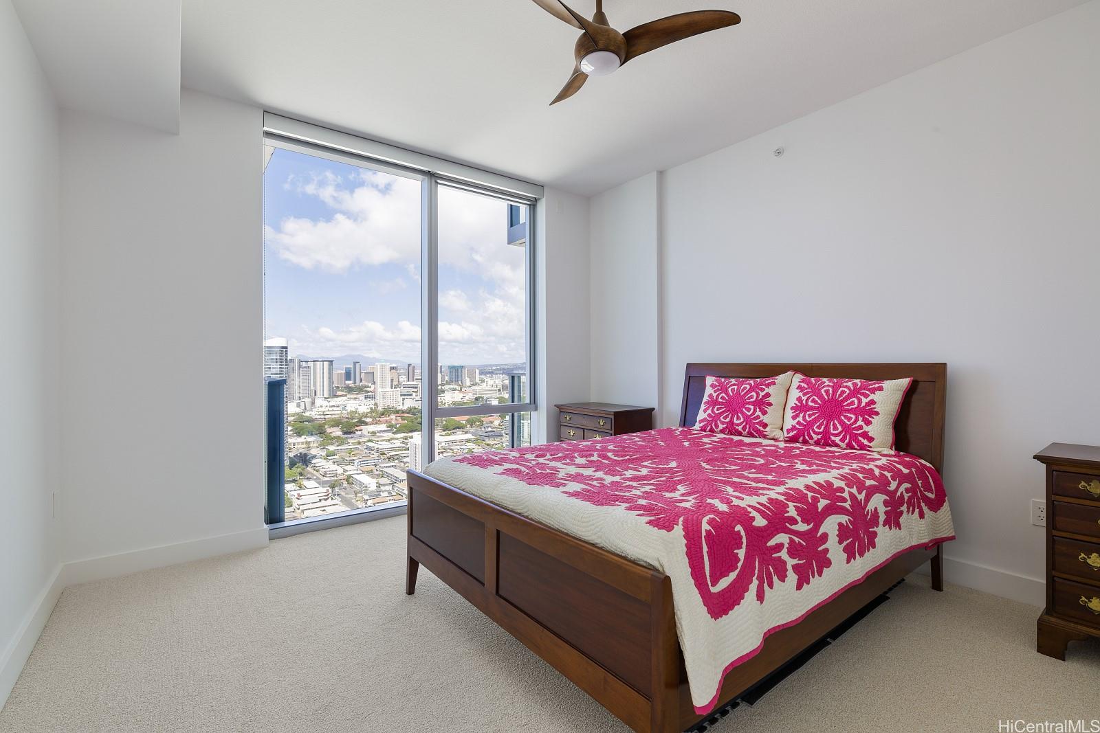Enjoy luxury convenient living on the 35th floor in Mid town Honolulu. Built in 2021,the unit is in Excellent Condition with 9 foot high ceilings with ceiling fans in the bedrooms and living room. Enjoy the ocean and mountain views from the living room, lanai and both bedrooms. Azure offers an exercise room, recreation room, movie theater, 4 grills and 2 cabanas, puppy park, 4 guest rooms for out of town visitors, and concierge services. The unit has two parking stalls and storage. Across the street from Ala Moana Center, Walmart, Sam's Club, great restaurants and much more. Very close to Magic Island and Ala Moana beach. Azure is fully covered with 100% hurricane nsurance. Listing by: Century 21 iProperties Hawaii (808) 216-4999