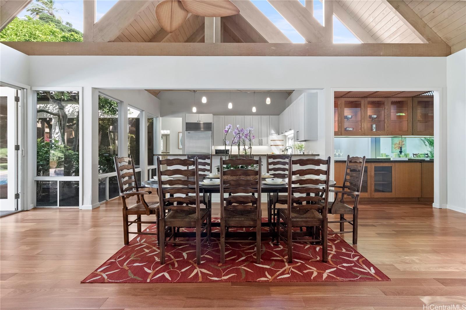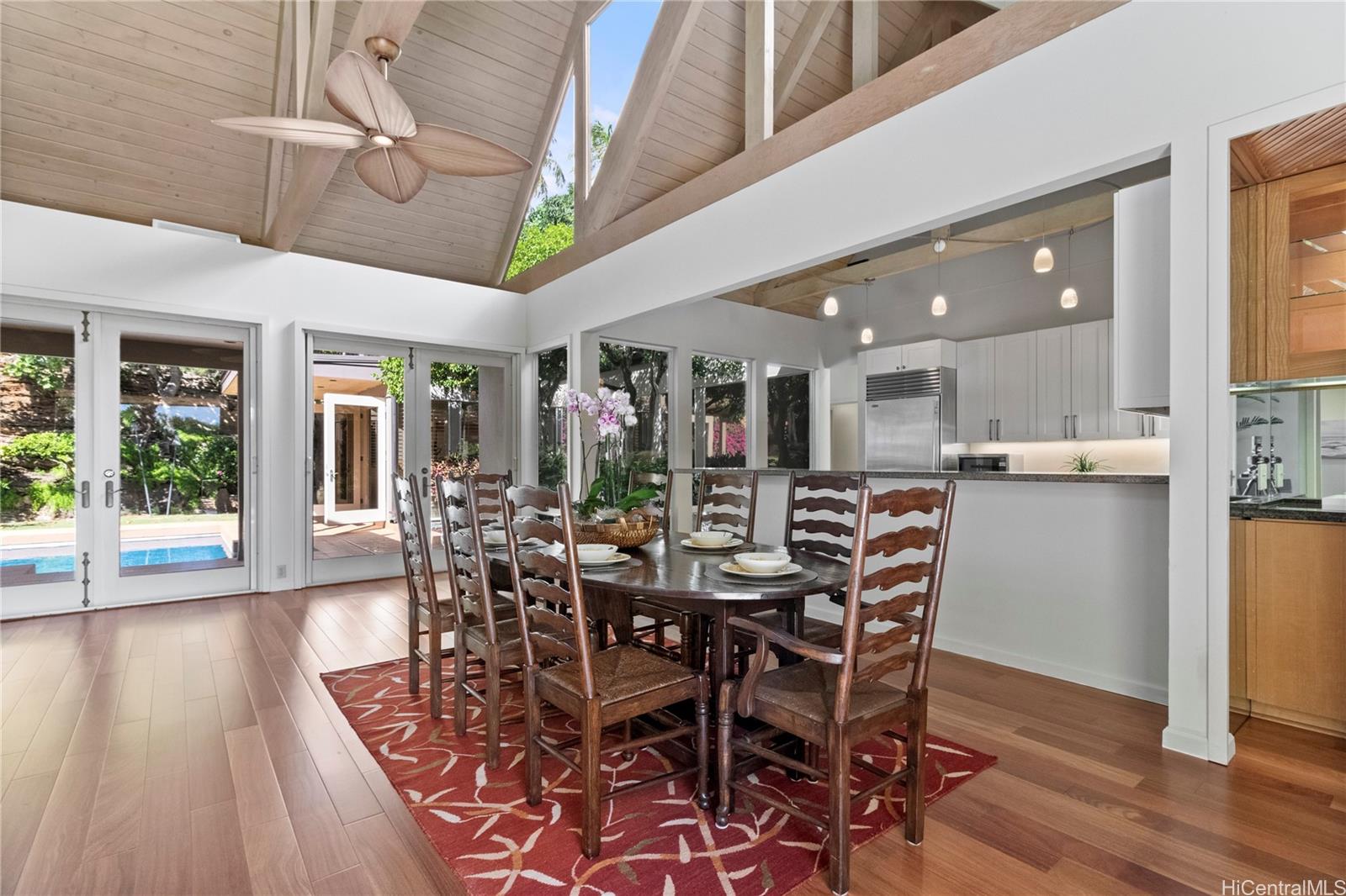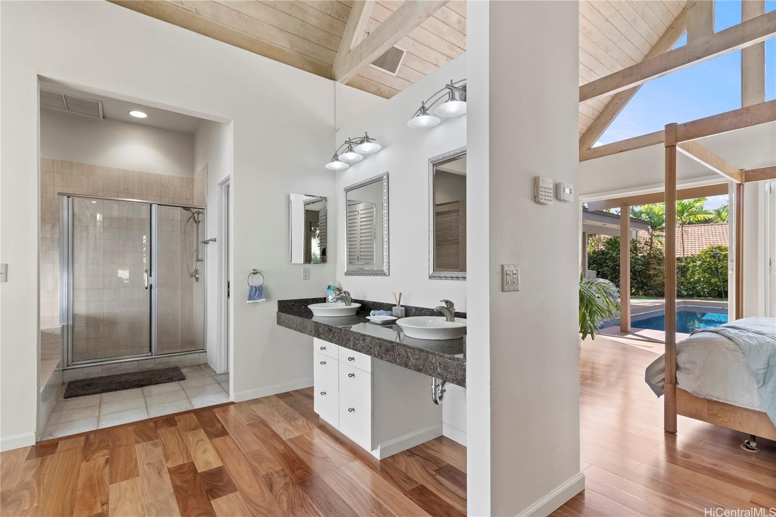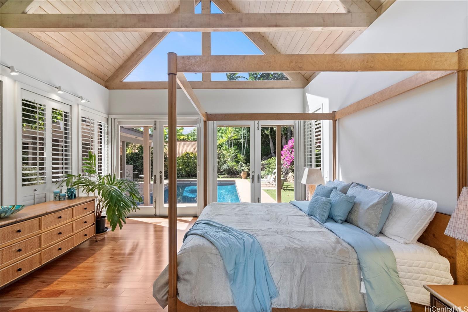 Enter through private gardens into this beautiful 4 bedroom/4 bath single level home that opens out to pool and nature setting in the back. Seamless indoor/outdoor living plus a separate bonus room above the garage. Fully walled in for privacy with new living room engineered wood floors, PV panels and glass panel garage doors. Dramatic open beams and windows throughout to catch the natural light. A serene and private setting. Welcome to your peaceful retreat. Listing by: Coldwell Banker Realty (808) 383-9787