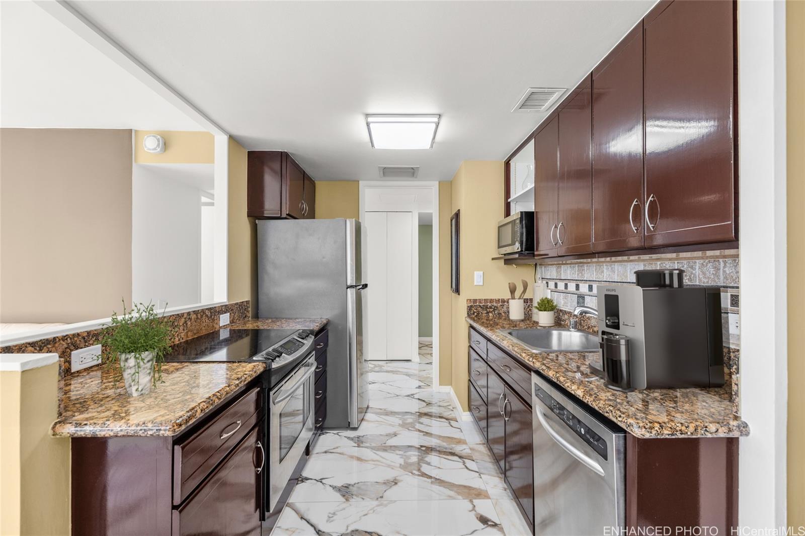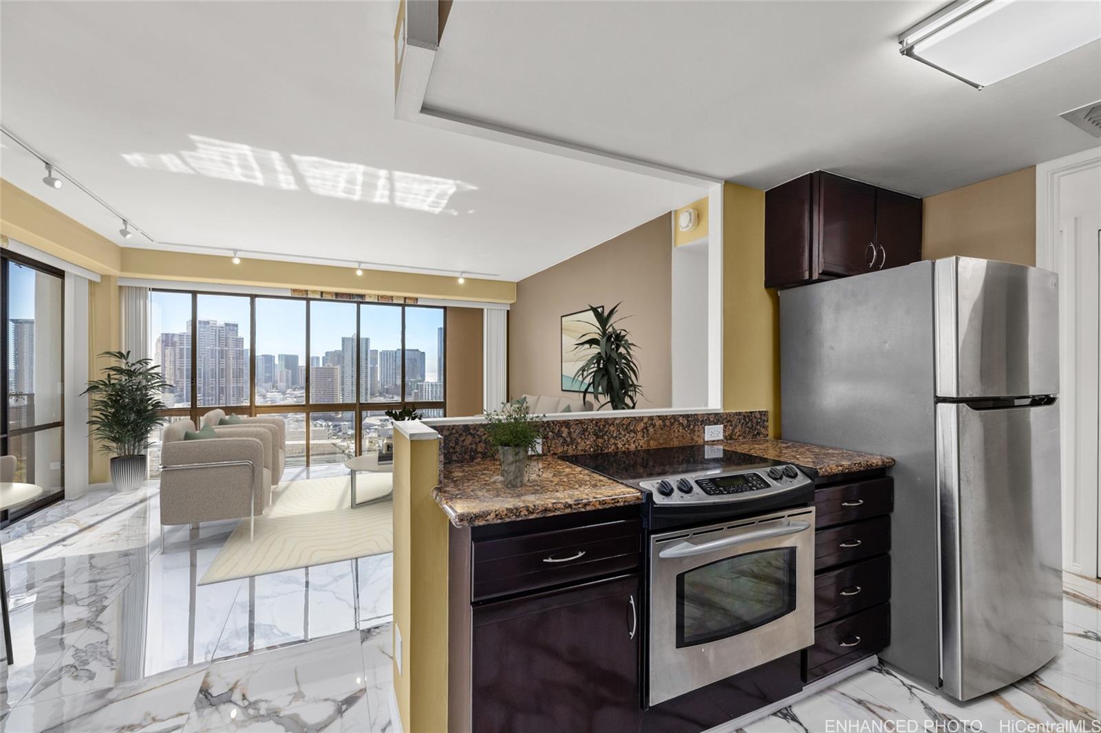 [0] => Welcome to elevated urban elegance in the heartbeat of Hawai‘i’s Capital City. This high-floor corner residence is wrapped in ocean, mountain & city views, framed by floor-to-ceiling windows that capture stunning sunrises & opens to an expansive lanai-your private sanctuary above vibrant Downtown Honolulu district. Beautifully updated with marble floors, smooth ceilings, newly painted, modern finishes, an open kitchen with granite countertops & stainless-steel appliances, this 2-bedroom retreat blends island serenity with timeless sophistication. Enjoy central A/C, covered parking, 24/7 security & maintenance fees that include it ALL: electricity, water, sewer, cable & internet. Harbor Square enhances convenience with a renovated pool deck, on-site manager, secure entry, bike storage, trash chute, and same-floor storage locker. Explore Honolulu’s eclectic art district, chic dining, boutique markets, CU HI, Pickles @ Forté pickleball, DoHo Night Market & architectural landmarks - State Capitol, Iolani Palace & Aloha Tower. This is urban island living at its most inspiring! Live beautifully, work confidently, and thrive effortlessly in one of Honolulu’s most captivating communities.