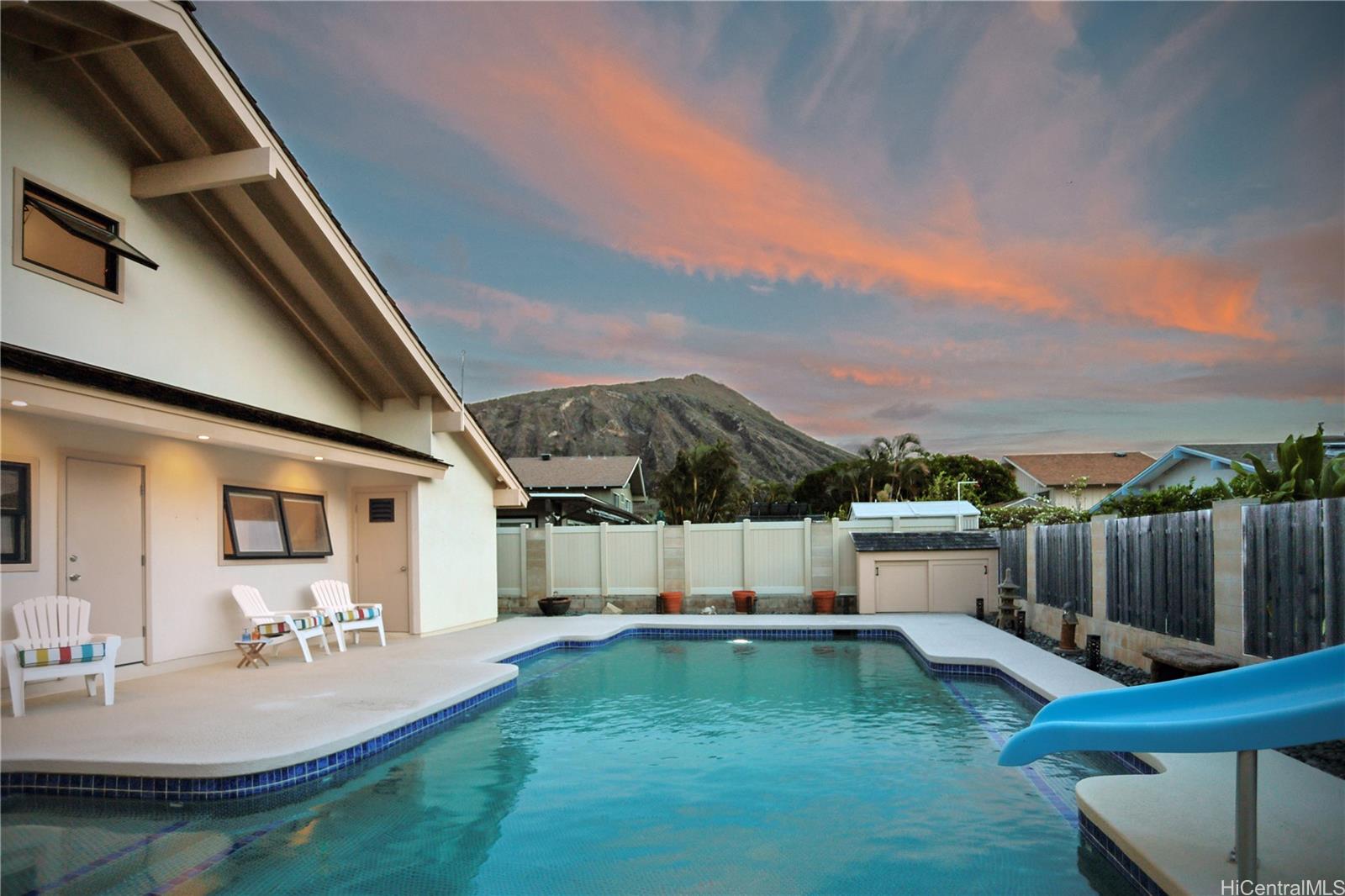 Nestled in a tranquil street in Mariners Cove, this beautifully remodeled 5 bedroom, 4 1/2 bath home combines high-end finishes with practical amenities. Let's start with the kitchen, equipped with Thermador appliances, it boasts expansive quartz countertops, handcrafted wood cabinets, & pantry. Adjacent to the kitchen is a Rec room that transitions to the outdoor kitchen & pool.The primary suite, featuring a step-free shower and a walk-in closet, on the main level, complemented by an additional bedroom/office.Vaulted ceilings & bamboo wood flooring throughout, punctuated by etched stairs. On the second floor is another primary bedroom with breathtaking Kokohead views, two additional bedrooms, two bathrooms & bonus craft room. An adjacent room provides for ample storage. Each bath has been remodeled, with quartz, stone, and Toto fixtures. Cabinetry & trim are crafted from African Mahogany wood, windows & doors by Pella, & gates by Kunkel. Side yard is ready for boats/ trailers, cars, & other toys. Backyard features a 560sf tiled swimming pool with slide, a 325sf covered lanai equipped with a grill, cooktop burner, counter space, & cabinets. A solar water heater is included! Listing by: HI Home For Sellers & Buyers (808) 358-8828
