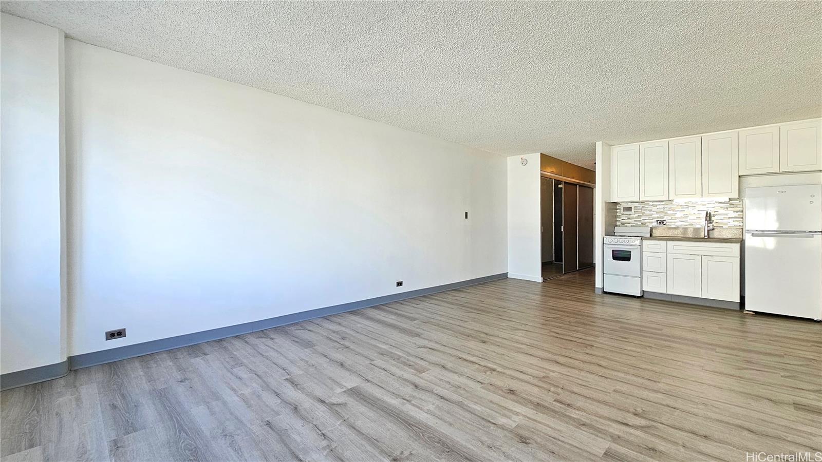 Highly RENOVATED & EXTRA SPACIOUS 448 sq ft studio. Purchased in July 2025: Brand new range, refrigerator and smoke detector. Renovated Sept/Oct/Nov 2024: Brand new paint, vinyl plank flooring. KITCHEN: New top and bottom cabinets, granite counter top, undermount sink & faucet and backsplash. BATHROOM: New metal tub, ceramic tile enclosure with soap dish, cabinets, granite vanity top, connected new compression lines & drain, installed new mirror & mounted medicine cabinet. CLOSET: Renovated closet and installed new closet organizer. New front door bell. Listing by: Realty Edge Inc (808) 227-0866