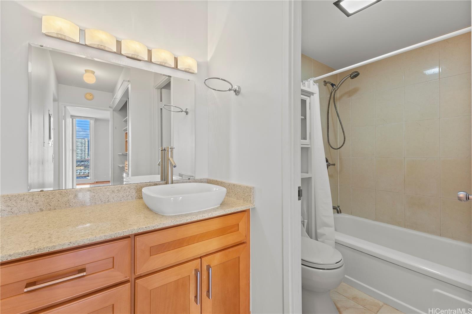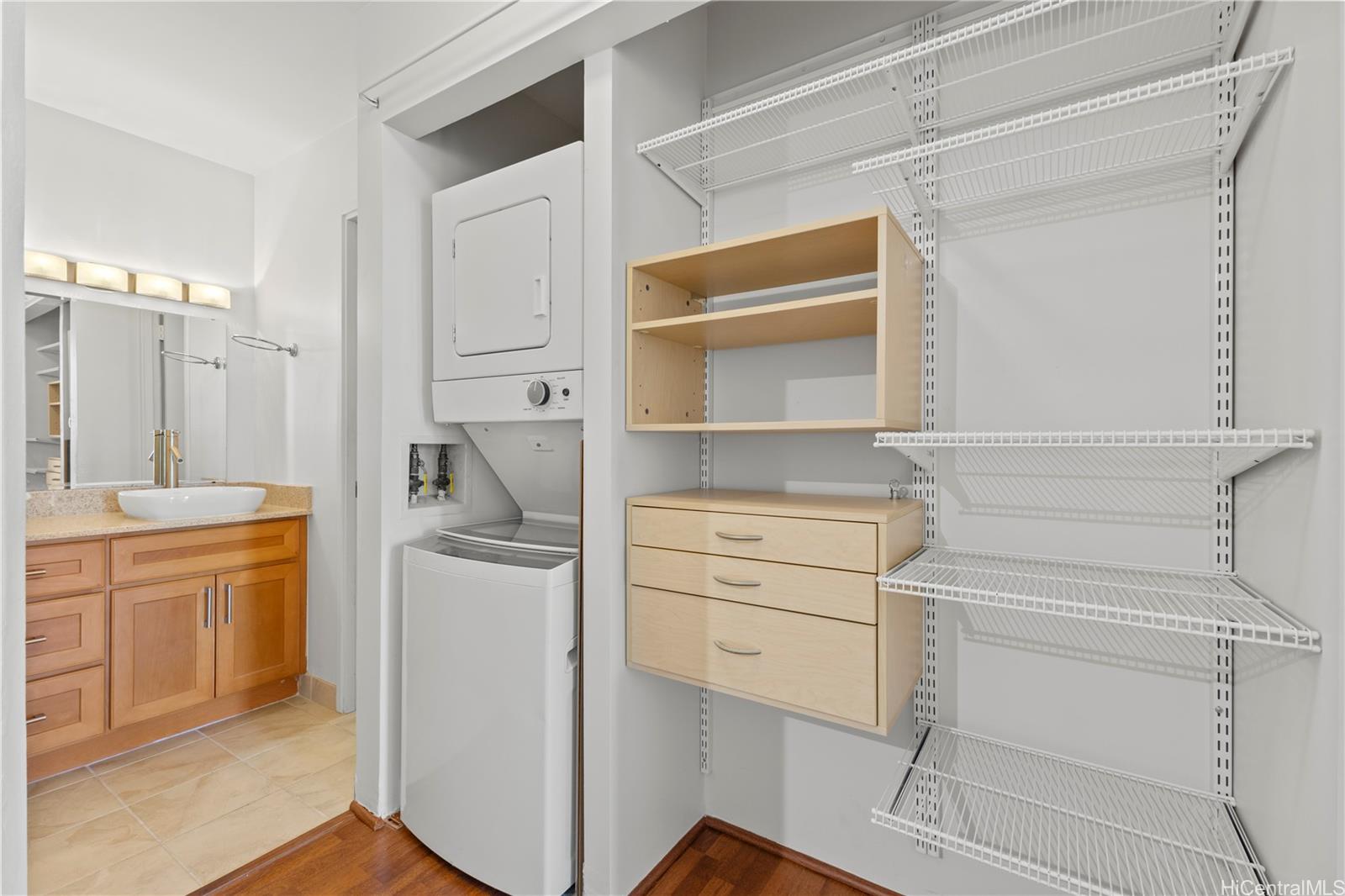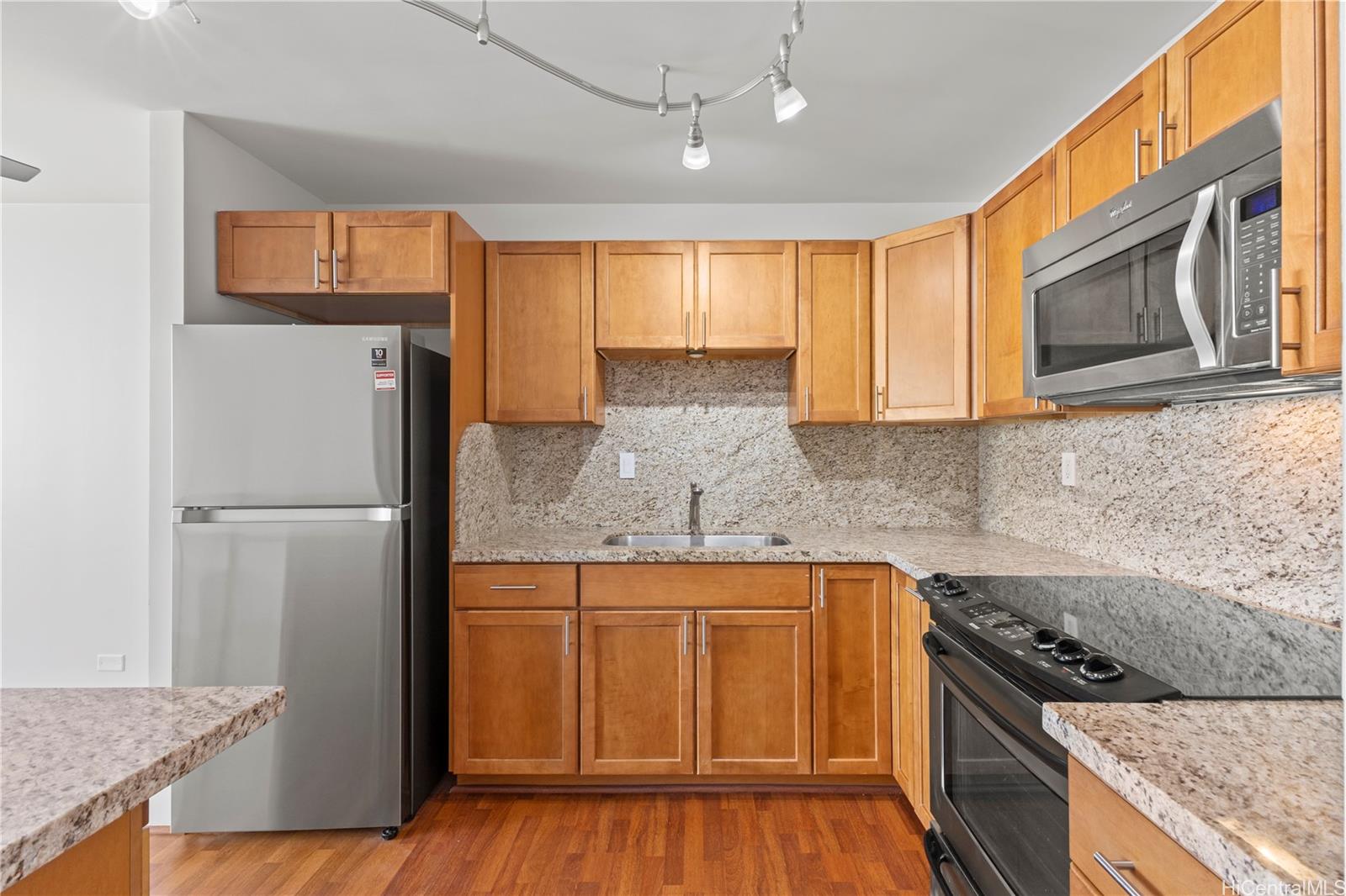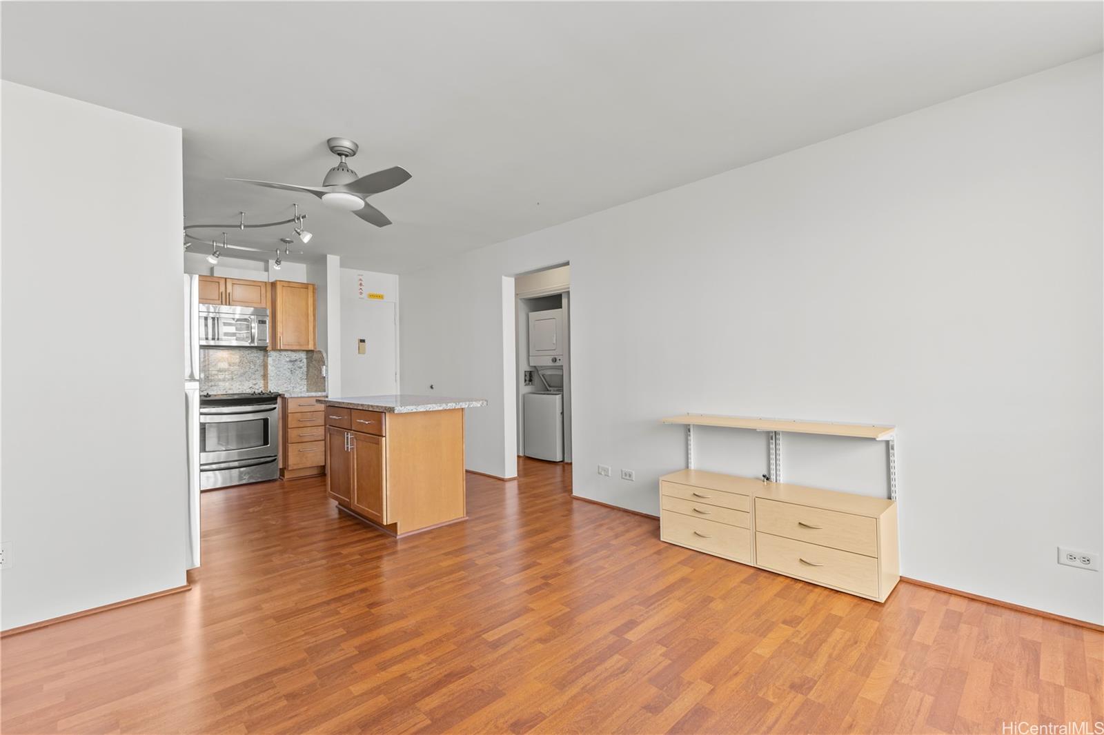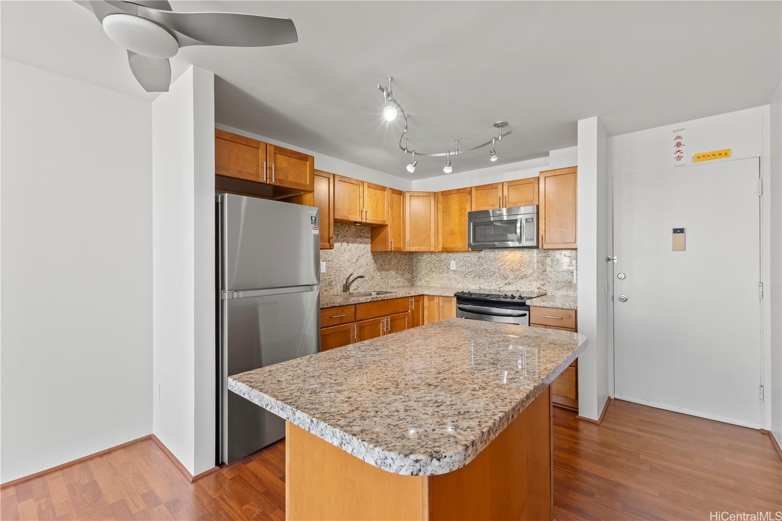 Discover the charm of Scenic Tower, where convenient Honolulu living awaits in the heart of Moiliili. This pet-friendly 1-bedroom, 1-bath residence has an open floor plan with a 56 sf covered lanai and windows allowing natural air flow. Features a beautifully renovated kitchen with granite countertops, ample cabinet space and an island to serve as your dining area. Upgraded with laminate flooring in the living room, kitchen & bedroom and ceramic tile flooring in the bathroom. Enjoy having a walk-in bedroom closet, stacked washer & dryer, along with additional hallway closet space. Relax poolside, entertain in your covered recreation area boarded by a green lawn, and feel at ease with your resident manager Comes with 1 secure, covered parking space. Conveniently located minutes to Waikiki, Ala Moana Shopping Center and the University of Hawaii at Manoa. Listing by: Coldwell Banker Island Prop (808) 875-7000