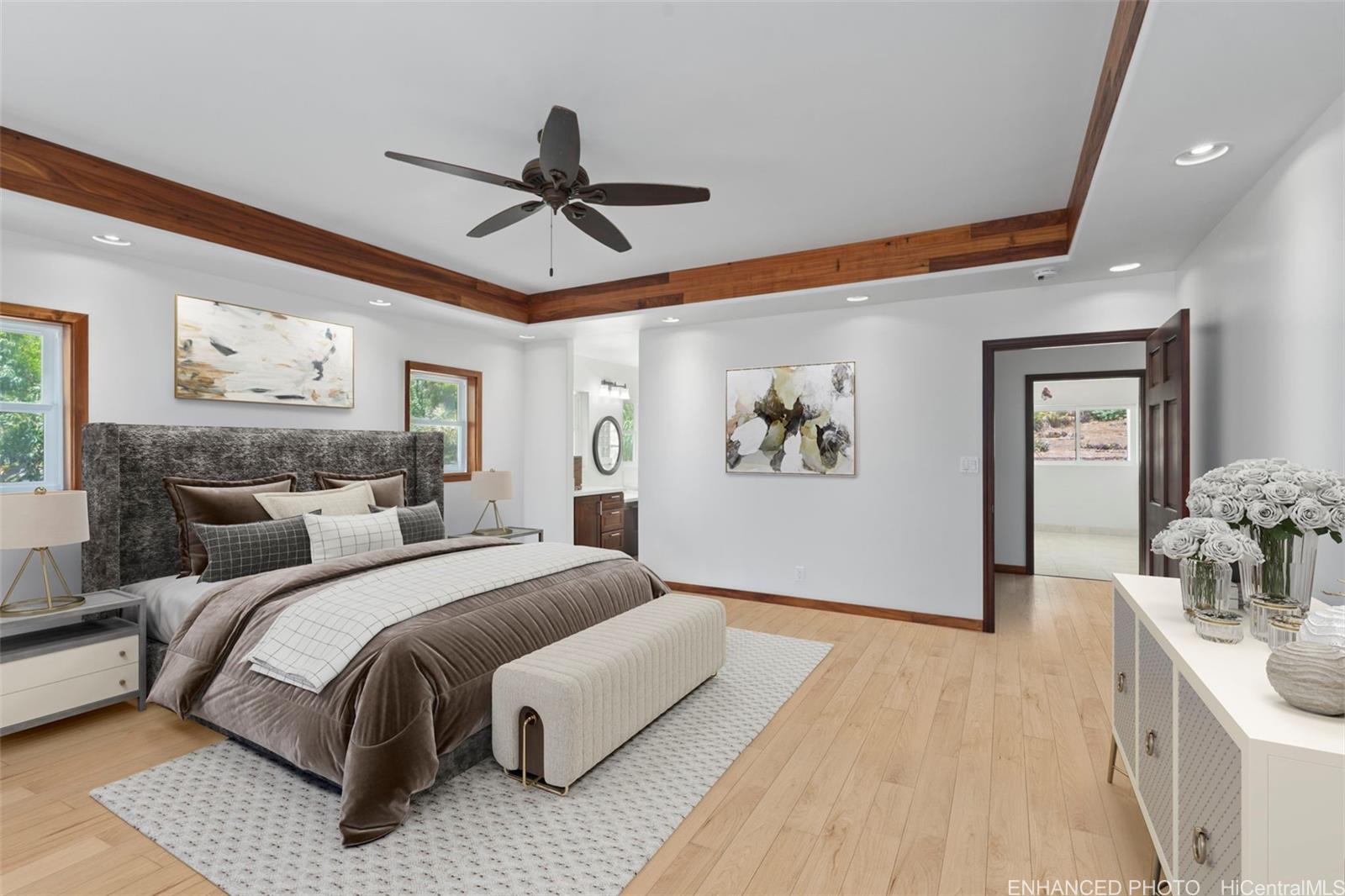 [0] => Welcome to Mauna'olu Estates! Experience indoor-outdoor island living in this beautifully appointed single-level 3-bed, 2-bath home with detached studio and full bath, located in a gated community with 24-hour security. Soaring ceilings and huge sliding doors frame mountain and ocean views throughout the expansive open-concept living area, anchored by a huge kitchen island, custom cabinetry, and quality appliances. Both the living room and spacious primary suite open to a wraparound lanai—perfect for relaxing or entertaining. The primary suite features a custom koa wood closet, dual vanities, jetted tub, and walk-in shower. Below the main home is a vast unfinished area offering potential for recreation, gatherings, or future expansion. Enjoy sustainable living with 24 owned PV panels, a two-car carport, and a large driveway with room for additional vehicles or a boat. Terraced landscaping with succulents and low-maintenance plants create an oasis in this private hillside setting.