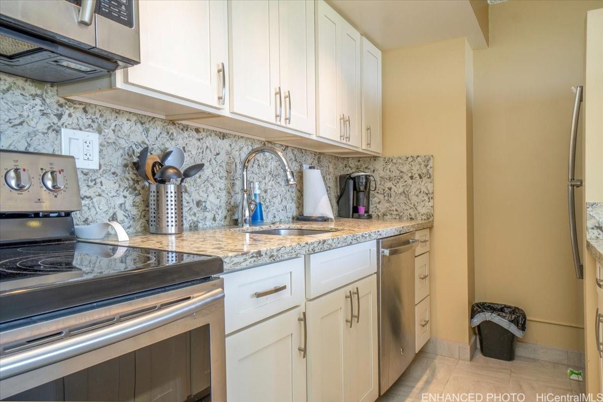 Upgraded Studio located on the 7th floor with unobstructed views of the Waianae Mountain range and Ocean view from lanai. Subject unit boasts an open living room and dining room with upgrades such as Quartz Counter Tops, Murphy Bed, Ceramic Tile Flooring throughout unit, White Wood Shaker Cabinets, Floor to Ceiling windows, and more. Makaha Valley Townhomes offers a community swimming pool, 24-hour security for added privacy. The unit is located within minutes to the world-renowned Makaha Beach, host to some of the world's most mesmerizing sunsets. Listing by: Keller Williams Honolulu (808) 284-0617