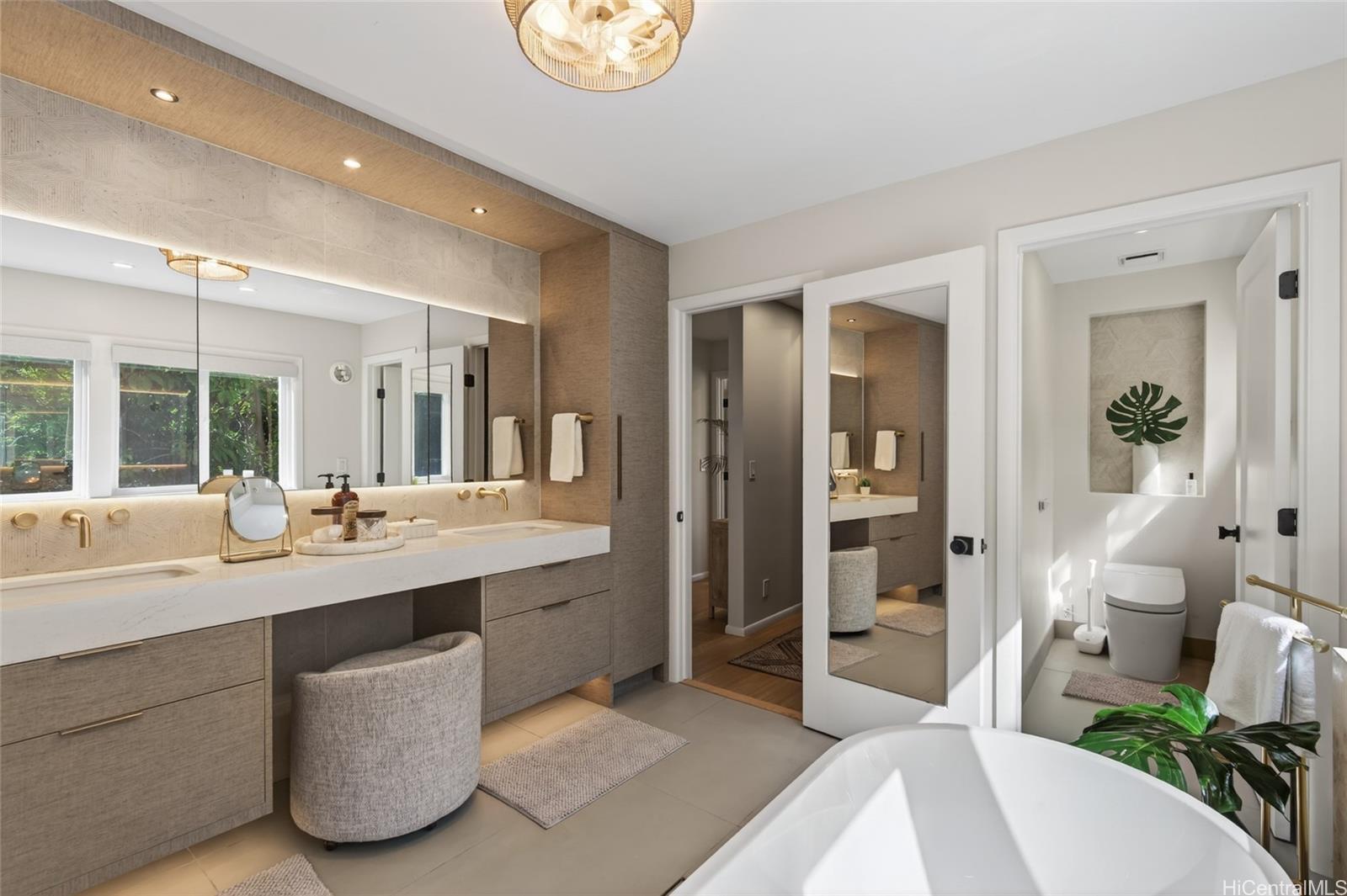 Additional spaces include a light-filled studio with its own deck and a separate lower residence with two bedrooms, generous living areas, and seamless indoor-outdoor flow. A rare, expansive level backyard offers exceptional privacy and includes plans for a swimming pool. Solid concrete construction, a peaceful Aalapapa-facing orientation, updated landscaping, and a full second-floor remodel finished in 2025 complete this extraordinary offering.