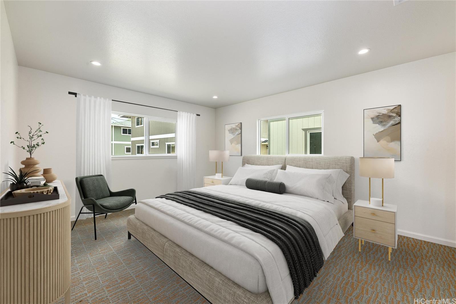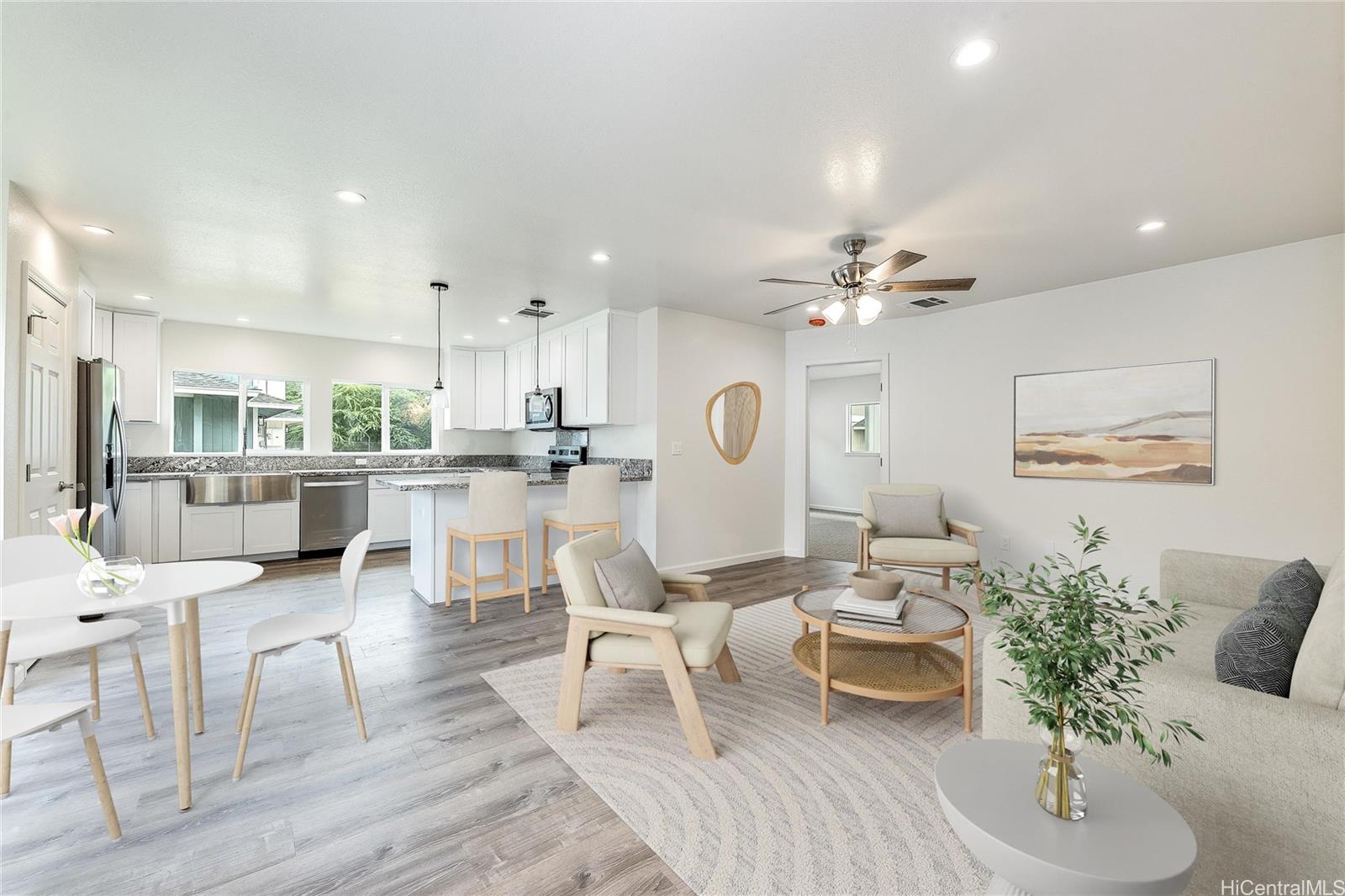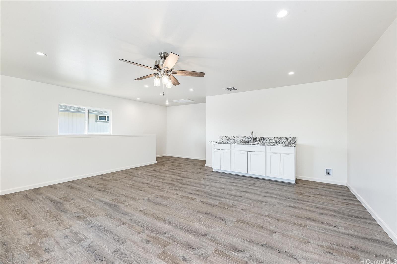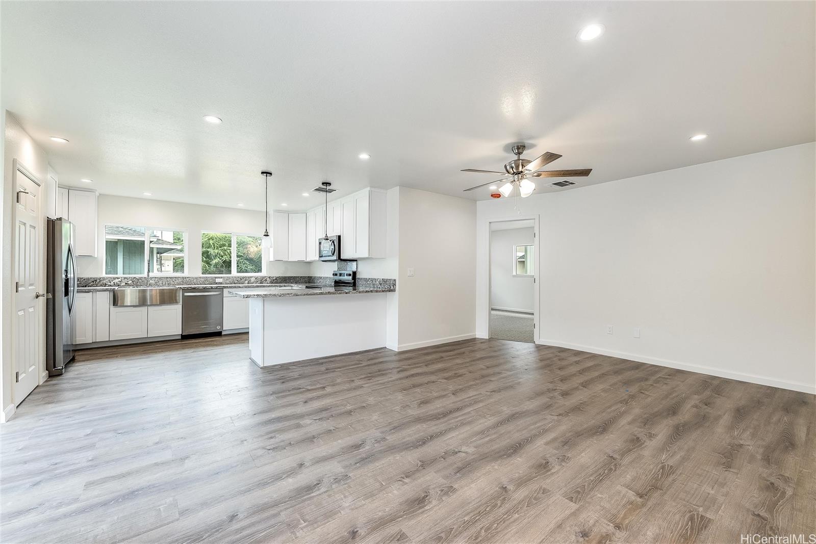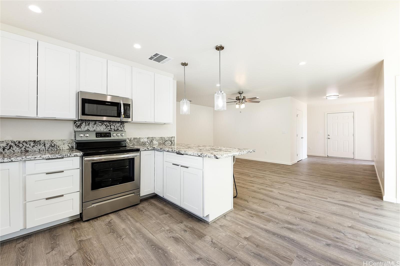 4 bedrooms, 2 Full baths and 1/2 half bath downstairs. This property offers spacious living; a primary bedroom located on the first floor, large walk-in closet, en-suite bathroom with dual sinks. A cozy family room with a wet bar located on the 2nd floor overlooking a covered spacious lanai. The modern style kitchen offers soft-close cabinets, stainless steel appliances, central AC. Located near shopping, schools, parks and minutes away from beaches. Easy to show. Listing by: West Beach Realty, Inc. (808) 398-3039