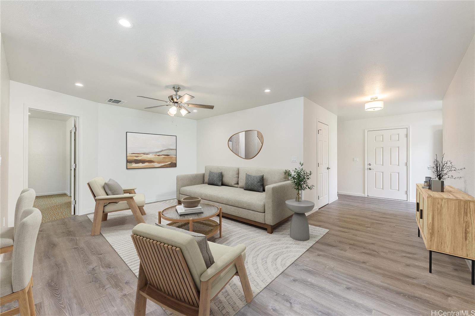 5 bedrooms, 3 Full baths and 1/2 half bath downstairs. This property offers spacious living; a primary bedroom located on the first floor, large walk-in closet, en-suite bathroom with dual sinks. A cozy family room located on the 2nd floor overlooking a covered lanai. The modern style kitchen offers soft-close cabinets, stainless steel appliances, central AC, a wet bar located on the 2nd floor. Located near shopping, schools, parks and minutes away from beaches. Easy to show. Listing by: West Beach Realty, Inc. (808) 398-3039