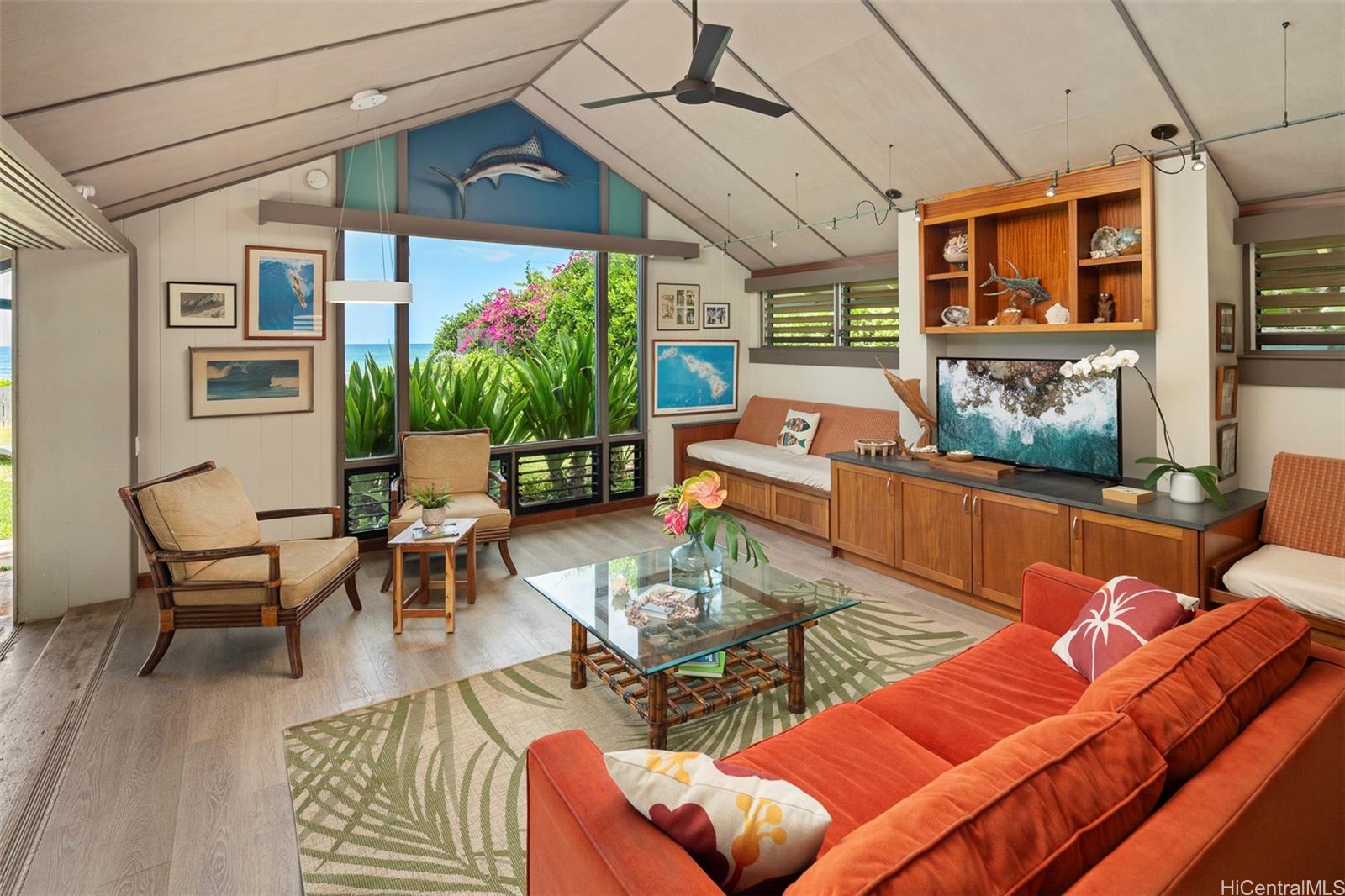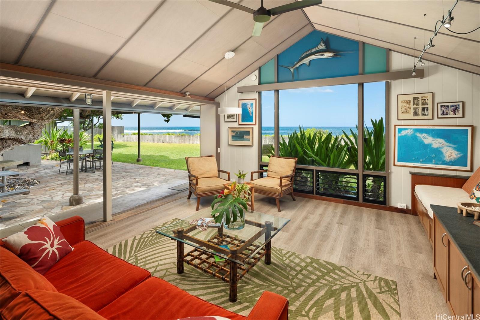 [0] => Welcome to Maluhia, a peaceful beachfront retreat on O‘ahu’s west shore. This gated 4-Bd, 2-Ba home sits at Ma‘ili Point, where sunny days, cool trade winds, and sunsets define daily life. Set on a large 22,225 sq ft parcel with 111 feet of beach frontage, this classic island home reflects old Hawai‘i and indoor-outdoor living by the sea. Step out to a sandy beach for swimming, snorkeling, or surfing, or relax in the yard with seasonal sightings of whales, dolphins, and surfers drifting by. Ma‘ili Point is a world-class surf break offering consistent waves year-round for surfing, foiling, and bodyboarding. Designed by mid-century architect Edward Sullam, who worked under Vladimir Ossipoff, this island treasure embraces timeless island style. The U-shaped plan connects three structures with covered walkways around a spacious Hau Tree Lanai, a shady courtyard that feels like an outdoor living room for everyday gatherings. Two of the wings offer space and privacy, each with 2-Bds and a shared bath. The central great room provides a lounge area with vaulted ceilings, an open kitchen, and sliding doors that bring the outdoors in. Maluhia is a place to unwind and enjoy life by the sea.