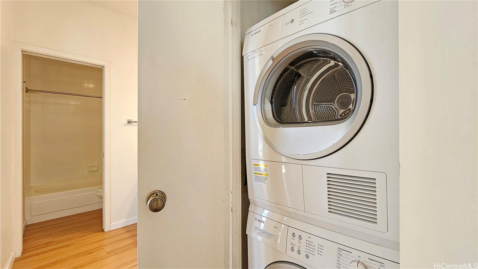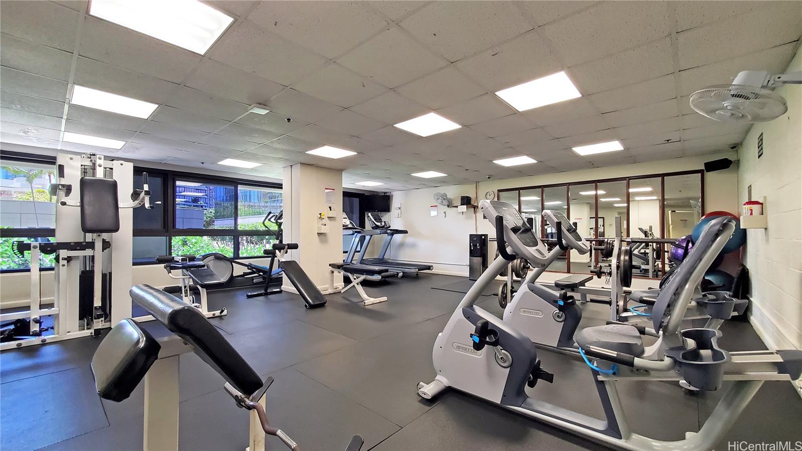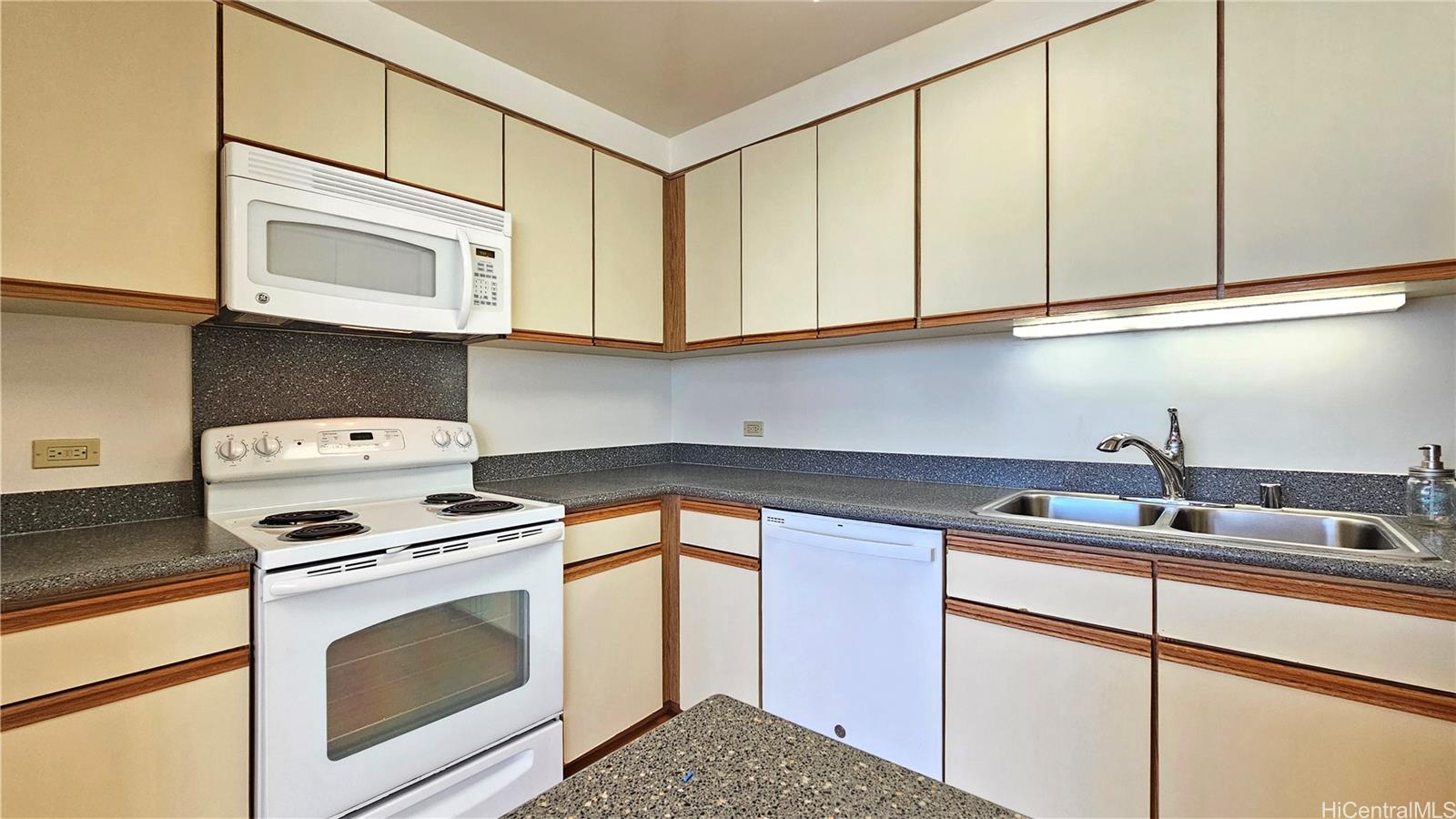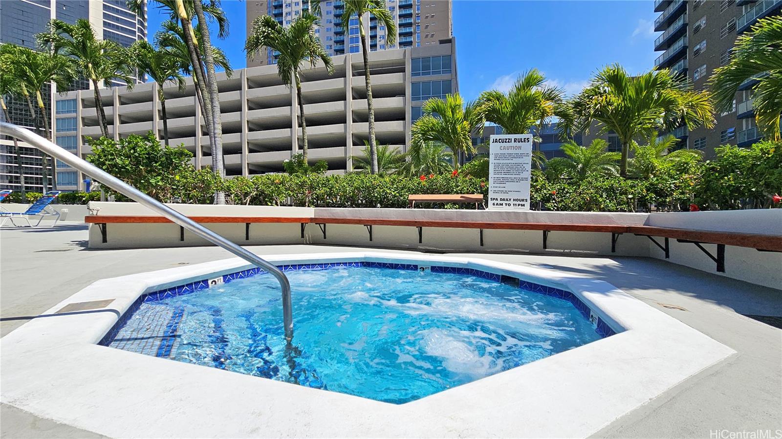 Penthouse unit on the top floor featuring stunning ocean, city, and mountain views. This spacious 1-bedroom, 1-bath residence offers high ceilings and tasteful upgrades, including Paradigm Sandalwood luxury vinyl plank flooring (2021) and new soft vinyl vertical blinds with aluminum tracking (2025). Living room includes mirrored accents to enhance natural light. Kitchen and bathroom features solid surface countertops. Appliances include refrigerator, range/oven, built-in microwave, dishwasher, and Bosch washer/dryer. Unit offers central A/C, entryway broom closet, and covered end stall parking space. Living Area: 622 sq. ft. | Year Built: 1987. Building Amenities: Swimming pool, jacuzzi, BBQ/recreation area, fitness center, resident manager, and 24-hour security. Maintenance Fee Includes: hot water, water, sewer, and cable TV. Seller may choose to perform a 1031 exchange. Sale not subject to finding a replacement property. Listing by: KMJ Realty LLC (808) 521-5655