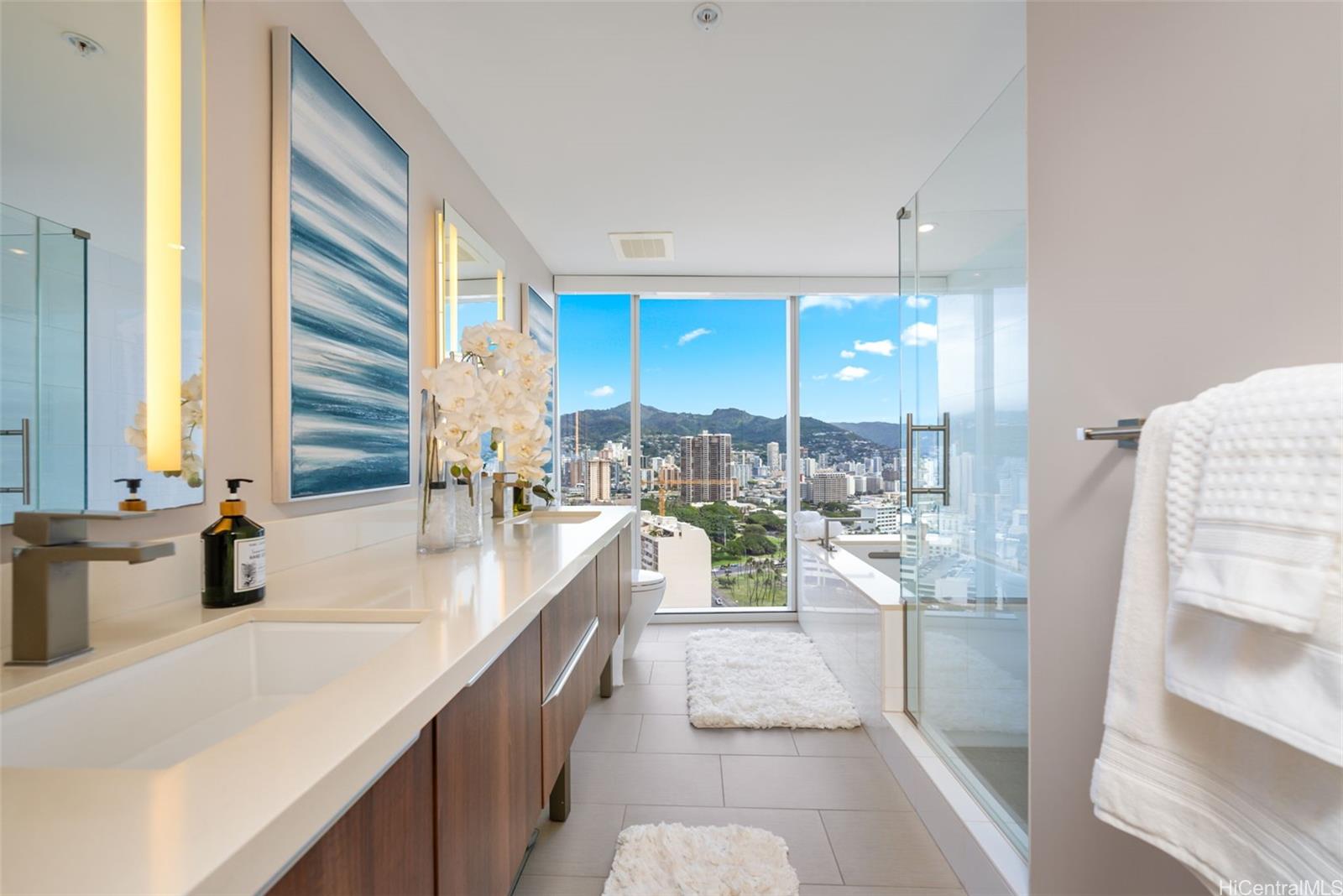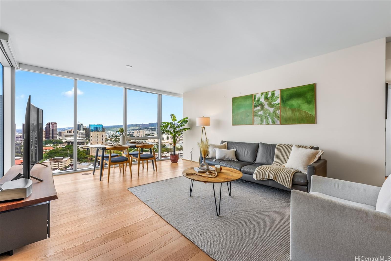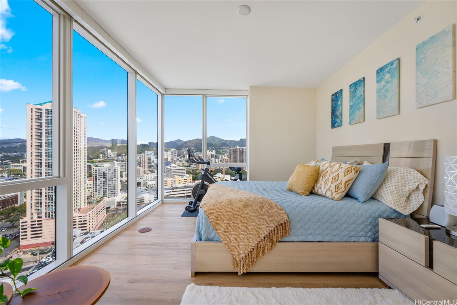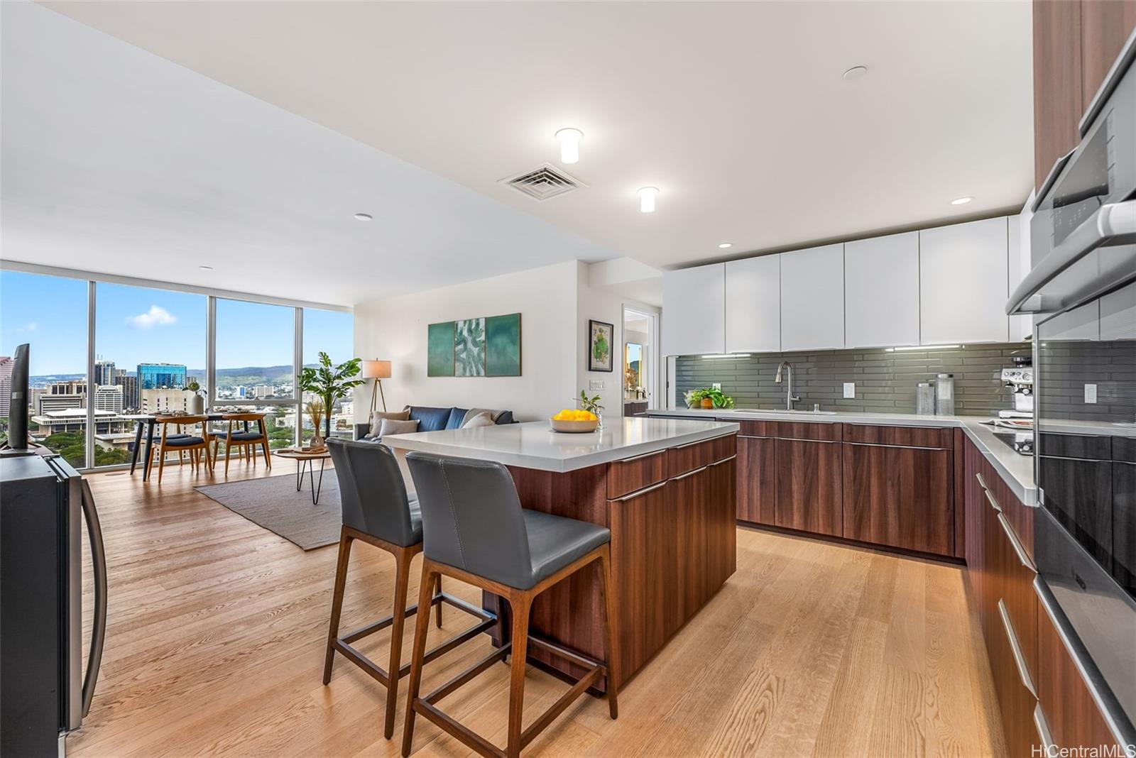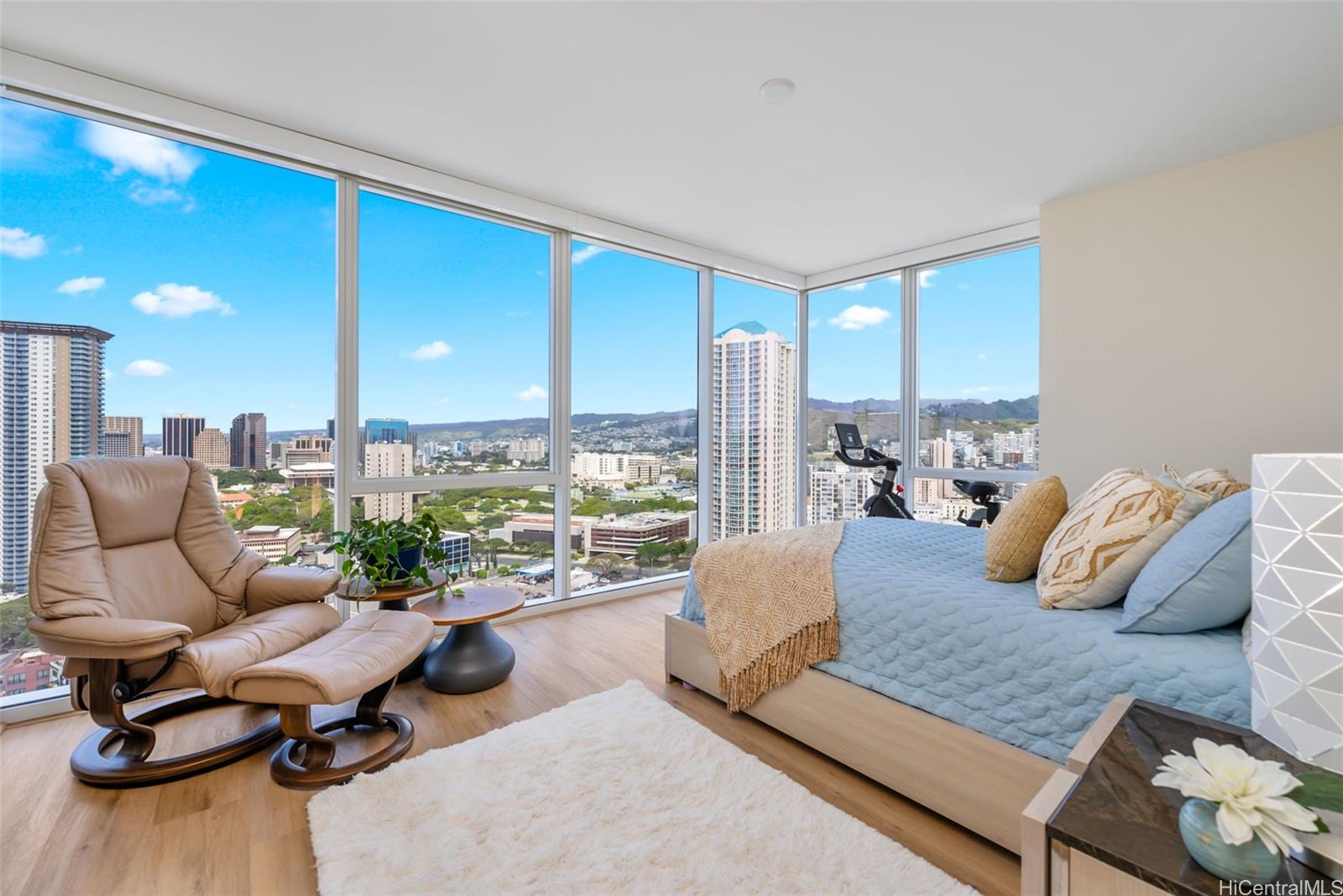 Stunning CORNER END luxury residence with floor to ceiling windows capturing mountain to ocean, sunset & city views. This spacious 2-bedroom 2 bath 1142 sq ft residence features; Studio Becker Kitchen with European cabinetry, polished Quartz countertops, glass tile back splash, Bosch appliances, central AC, full size washer/dryer & engineered hardwood flooring in the living areas & LVT in the bedrooms, 2 (T) parking stalls near the elevator. Symphony Honolulu is home to 388 private condominium luxury residences with exclusive use of an expansive recreation deck featuring an infinity edge pool, sauna, gym, yoga studio, private cabanas, state of the art media room, BBQ areas, private guest suites, PV panels and more. Pet friendly (please verify) dog park, EV Charging Station,24 hr. secured lobby. Listing by: REMAX Hawaii (808) 738-3600
