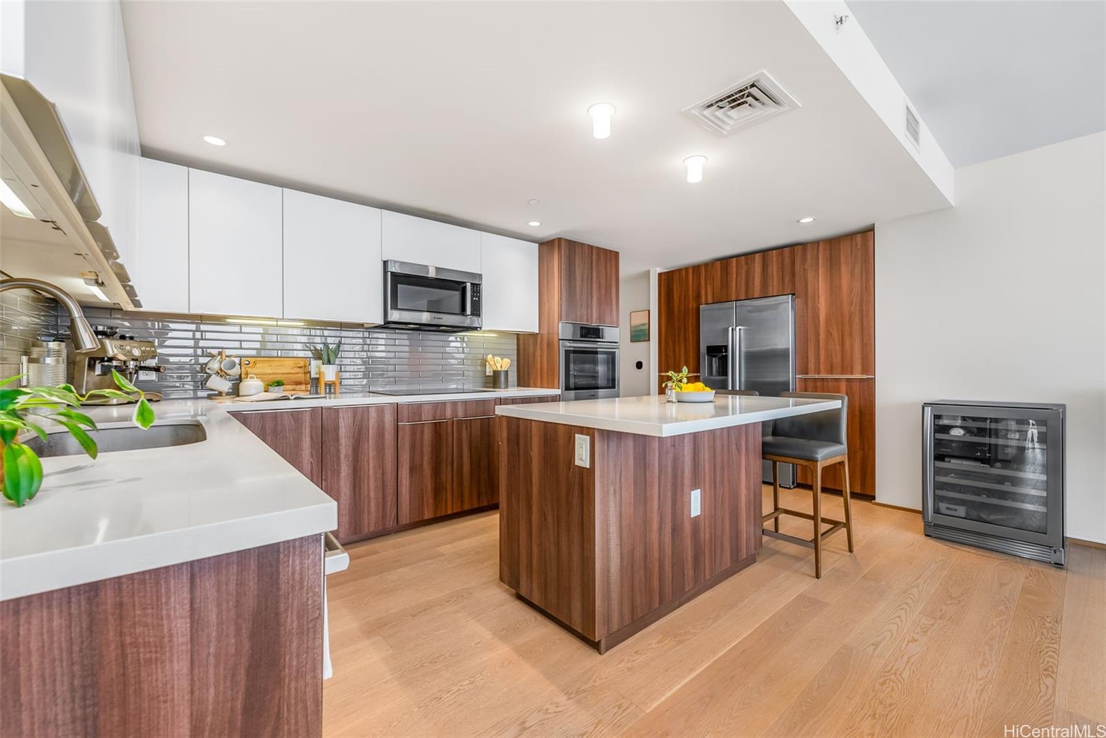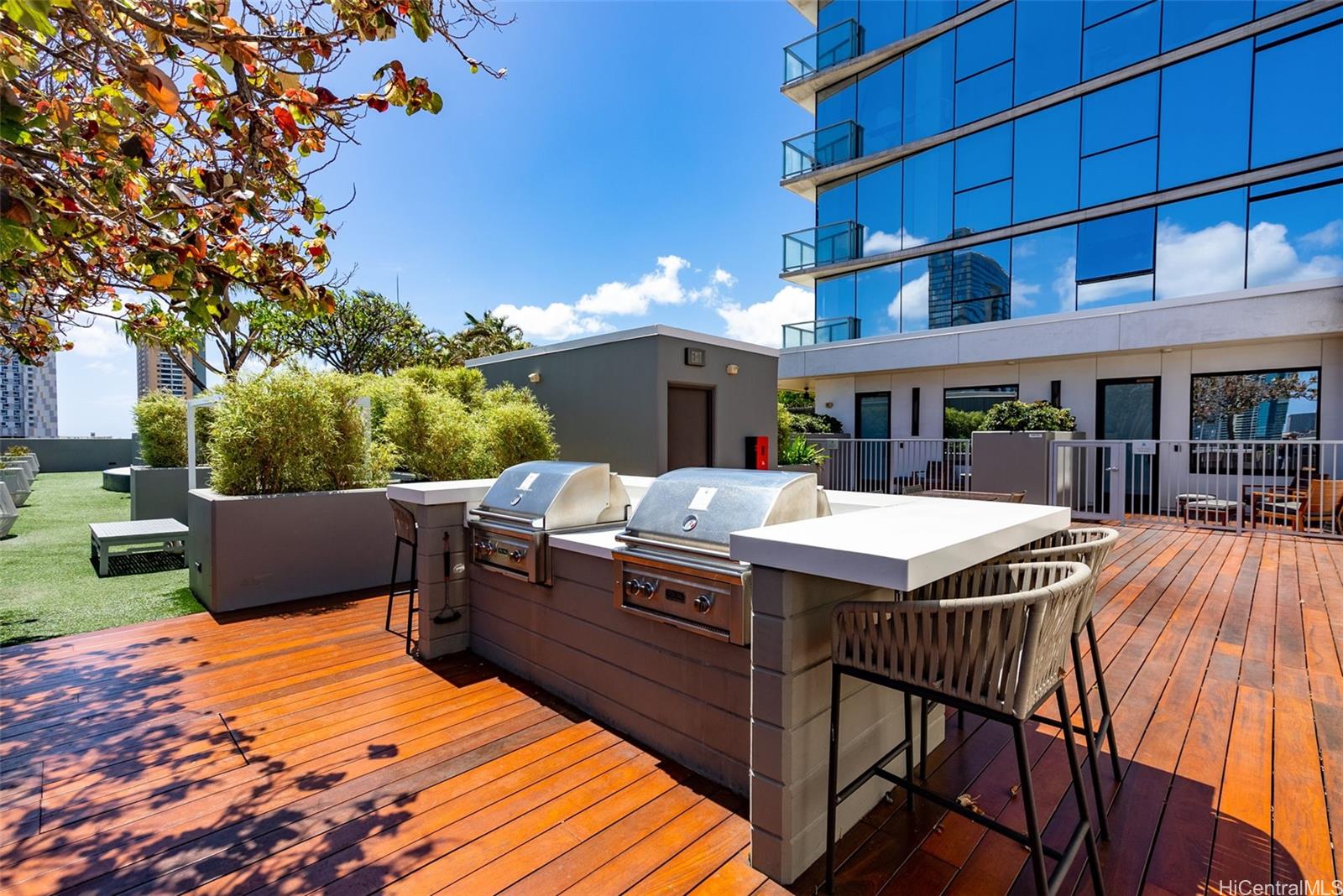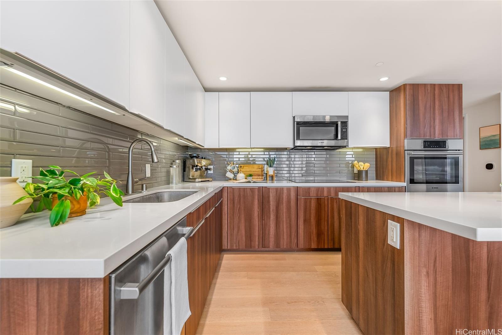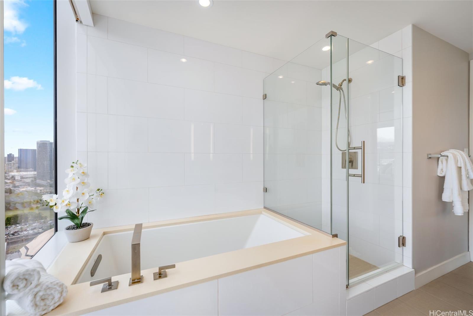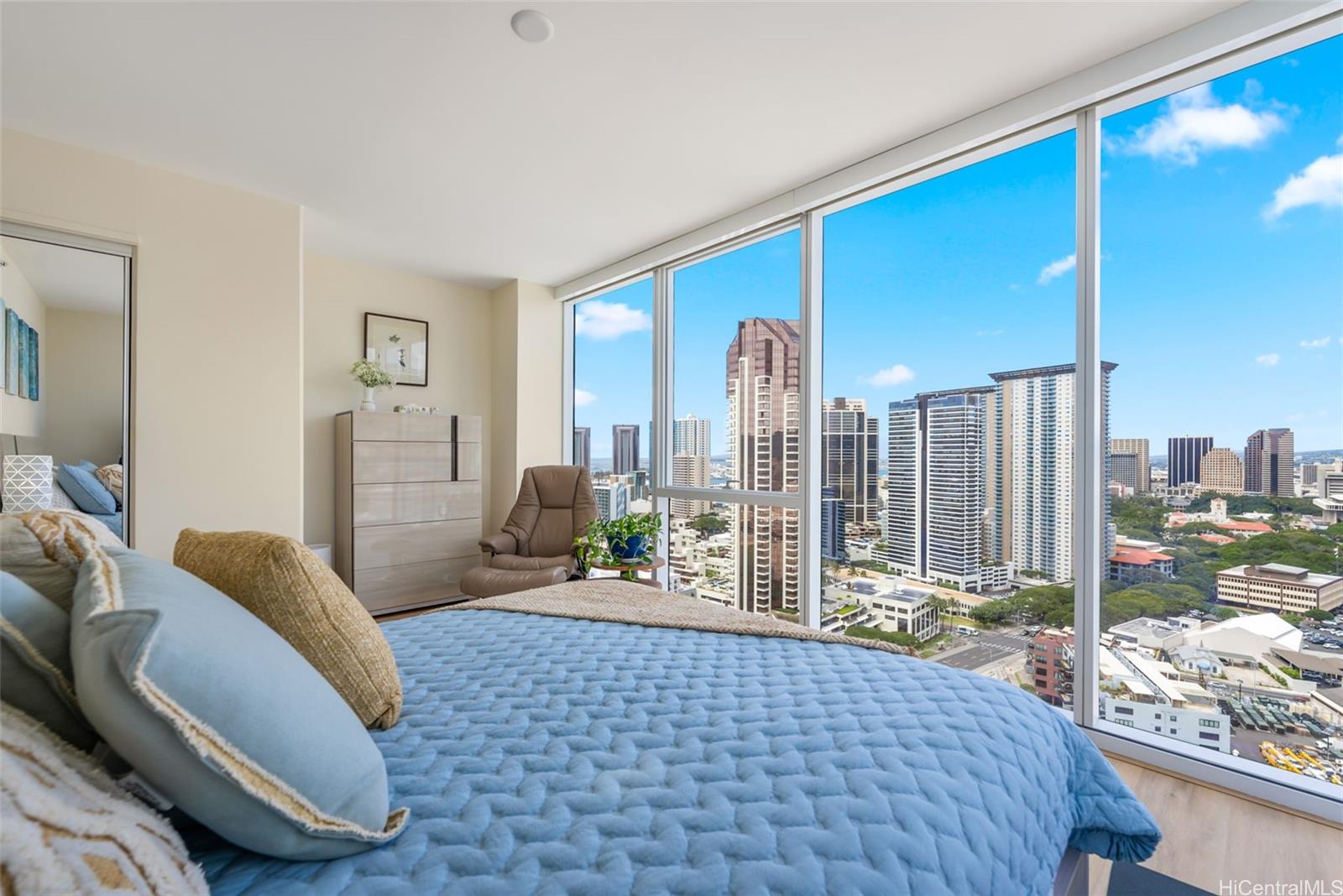 Stunning CORNER END luxury residence with floor to ceiling windows capturing mountain to ocean, sunset & city views. This spacious 2-bedroom 2 bath 1142 sq ft residence features; Studio Becker Kitchen with European cabinetry, polished Quartz countertops, glass tile back splash, Bosch appliances, central AC, full size washer/dryer & engineered hardwood flooring in the living areas & LVT in the bedrooms, 2 (T) parking stalls near the elevator. Symphony Honolulu is home to 388 private condominium luxury residences with exclusive use of an expansive recreation deck featuring an infinity edge pool, sauna, gym, yoga studio, private cabanas, state of the art media room, BBQ areas, private guest suites, PV panels and more. Pet friendly (please verify) dog park, EV Charging Station,24 hr. secured lobby. Listing by: REMAX Hawaii (808) 738-3600