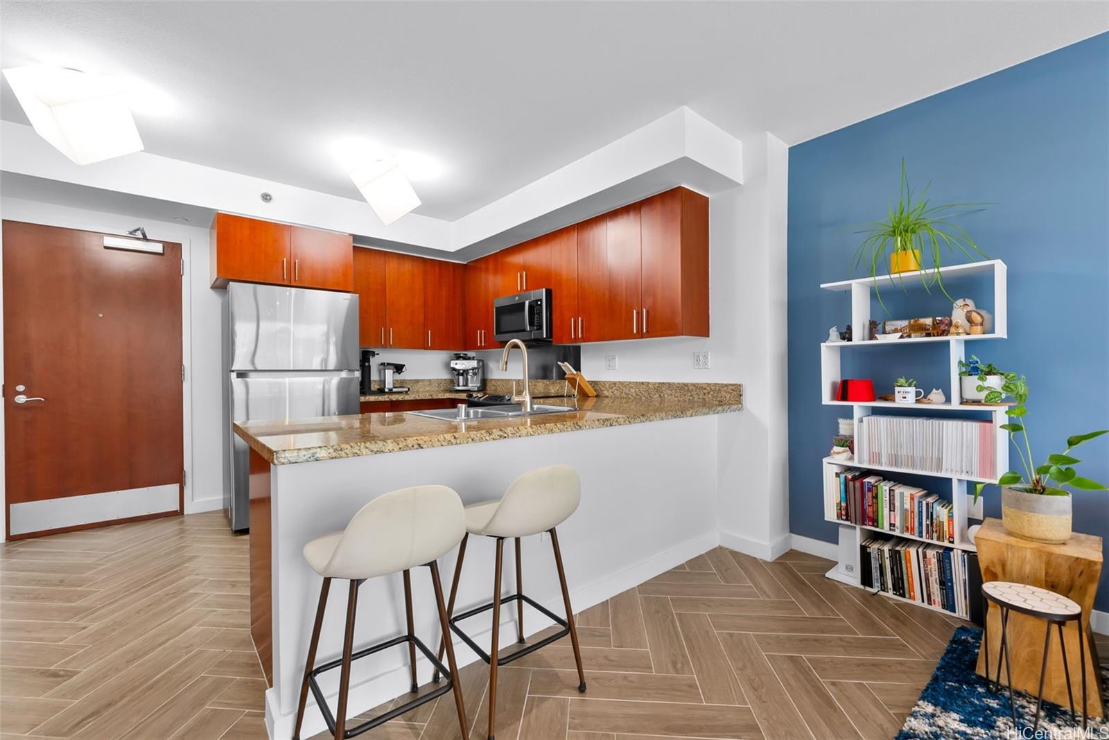 Welcome to 909 Kapiolani, perfectly situated in the heart of Kakaako and just minutes to Ala Moana. Unit 2405 features an open floor plan showcasing beautiful porcelain tile flooring, a modern kitchen with granite counters and stainless steel appliances, in unit washer/dryer, split A/C, an updated bathroom, and breathtaking city and mountain views from your private lanai! The unit also comes with a full-size, covered parking stall. Some of the many building amenities include 24-hr security, pool, bbq stations, fitness center, and a private room for parties. Pet friendly as well! Reach out to your agent to schedule a private showing. Listing by: Ota Realty Consultants, LLC (808) 554-8246