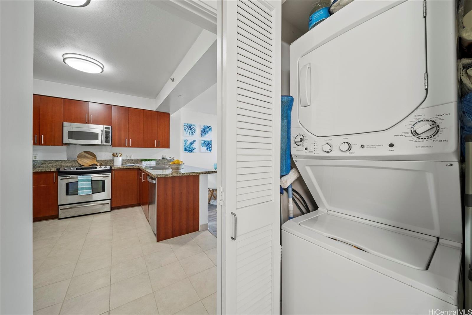 Stylish 1-bedroom, 1-bath condo with floor-to-ceiling windows showcasing stunning city and mountain views. The open layout features a modern kitchen with granite countertops, stainless steel appliances, and plenty of cabinet space that flows seamlessly into the living area. Step out onto your private lanai—perfect for morning coffee, evening sunsets, or entertaining guests. The bright bedroom offers direct lanai access, and the bathroom is finished with sleek, contemporary fixtures. Additional highlights include split A/C, in-unit laundry, and one covered parking stall. Enjoy resort-style amenities such as a pool, jacuzzi, fitness center, BBQ area, garden boxes, recreation room, and 24-hour security. Located in the heart of Kaka‘ako, just a short walk to Ala Moana Center, beaches, and top dining spots, this residence combines comfort, style, and urban convenience in one perfect package. Listing by: Keller Williams Honolulu (808) 295-8157