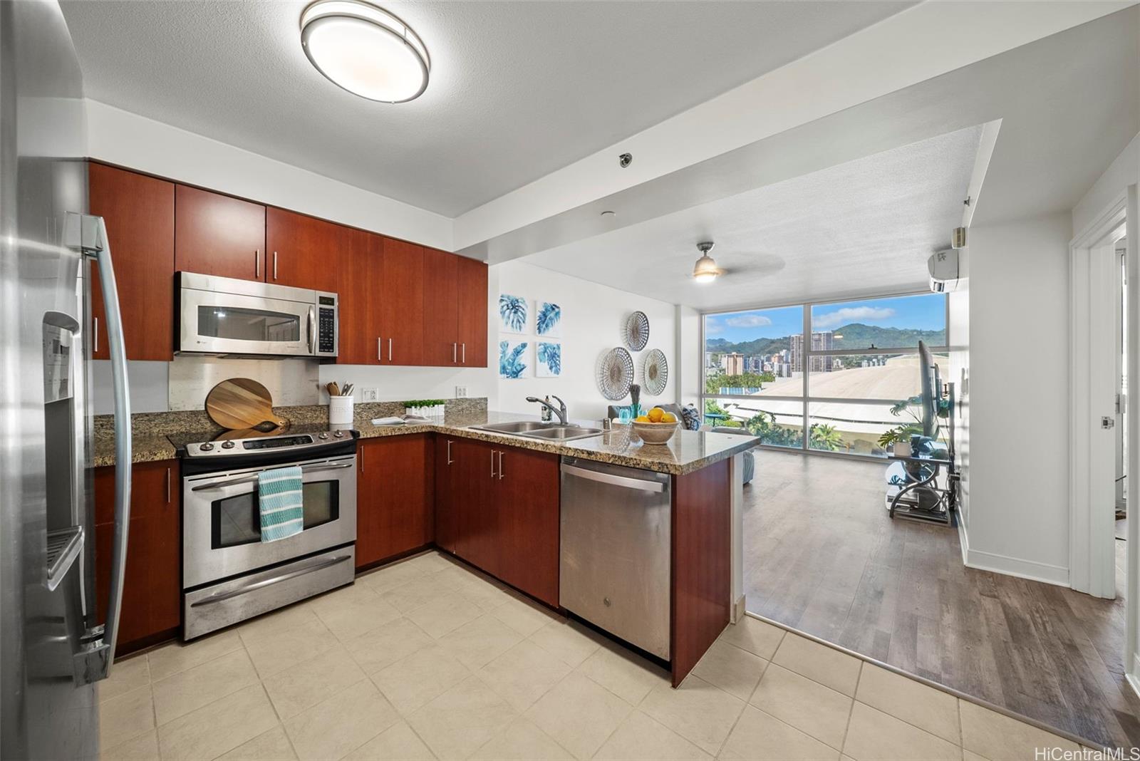 [0] => Stylish 1-bedroom, 1-bath condo with floor-to-ceiling windows showcasing stunning city and mountain views. The open layout features a modern kitchen with granite countertops, stainless steel appliances, and plenty of cabinet space that flows seamlessly into the living area. Step out onto your private lanai—perfect for morning coffee, evening sunsets, or entertaining guests. The bright bedroom offers direct lanai access, and the bathroom is finished with sleek, contemporary fixtures. Additional highlights include split A/C, in-unit laundry, and one covered parking stall. Enjoy resort-style amenities such as a pool, jacuzzi, fitness center, BBQ area, garden boxes, recreation room, and 24-hour security. Located in the heart of Kaka‘ako, just a short walk to Ala Moana Center, beaches, and top dining spots, this residence combines comfort, style, and urban convenience in one perfect package.