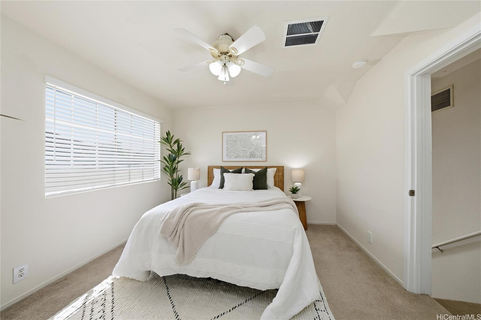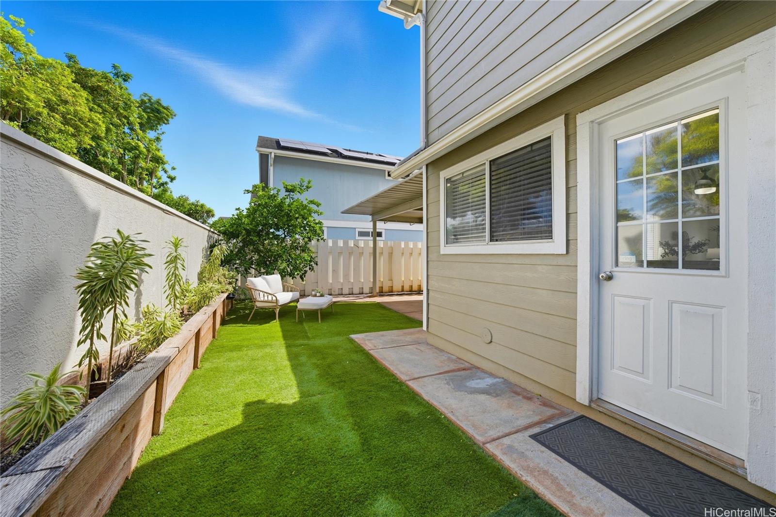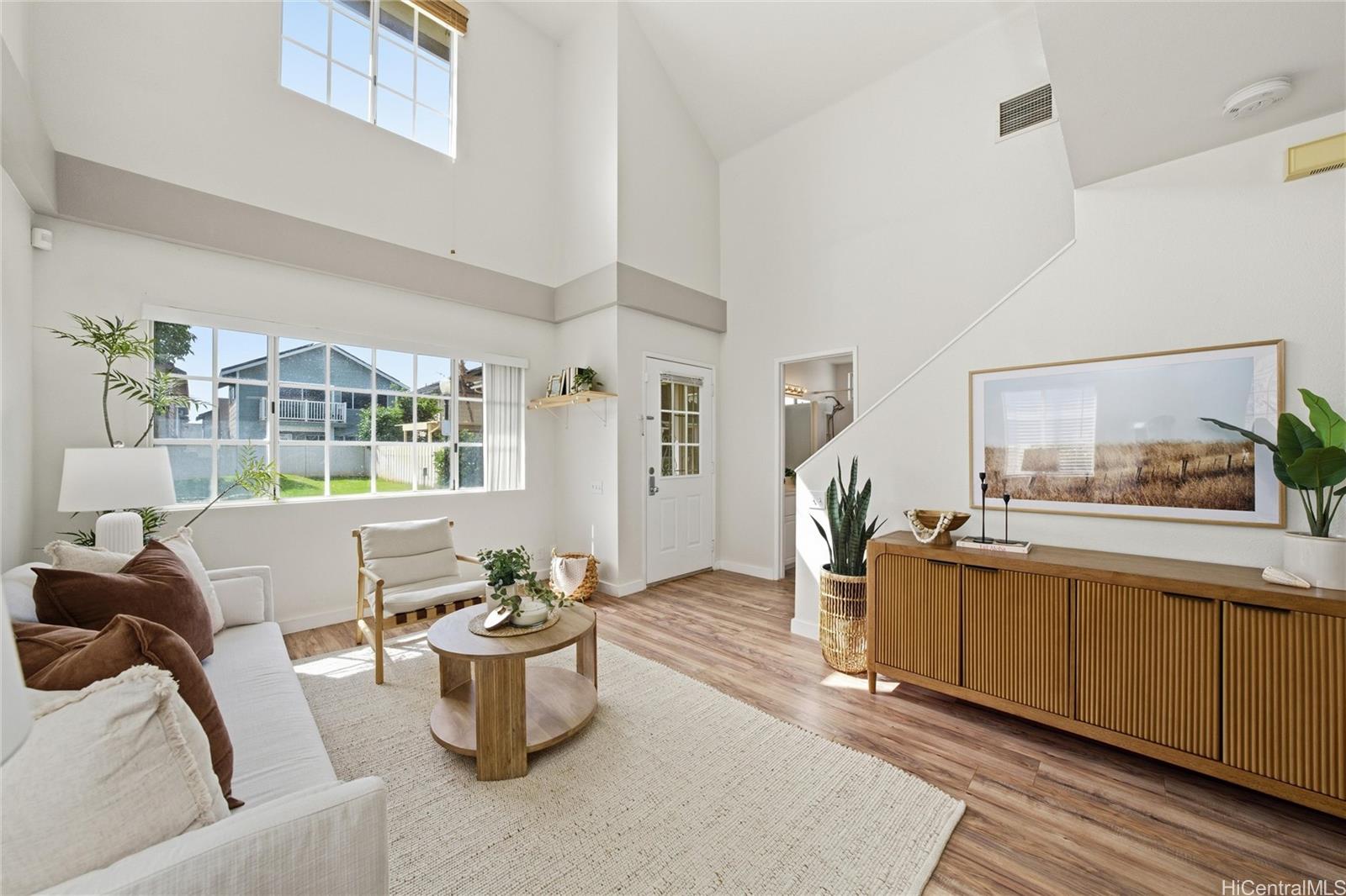 Price Improvement! This beautifully maintained 2-bedroom, 2-bath home features a spacious layout with vaulted ceilings, central air conditioning, and sleek vinyl laminate flooring. The primary suite with a full ensuite bath is conveniently located on the first floor, while the second bedroom and full bath offer privacy upstairs. Enjoy the convenience of a 2-car carport plus two additional driveway spaces, along with guest parking nearby. Positioned across from a lush green open space, this home offers a peaceful setting in a thriving community. Modern upgrades include updated appliances and a powerful energy-efficient setup with 21 owned photovoltaic panels and 2-Tesla Powerwall batteries—helping you save on utilities. Located in the heart of Ewa, you're just minutes from shopping, dining, entertainment, banks, the post office, and public transportation. BONUS: This property comes with a VA assumable loan at an incredibly low 2.25% interest rate. This is an exceptional opportunity for qualified VA buyers. Maintenance Fee will actually be DECREASING to $400.17 in January 2026! Listing by: Corcoran Pacific Properties (808) 589-2040
