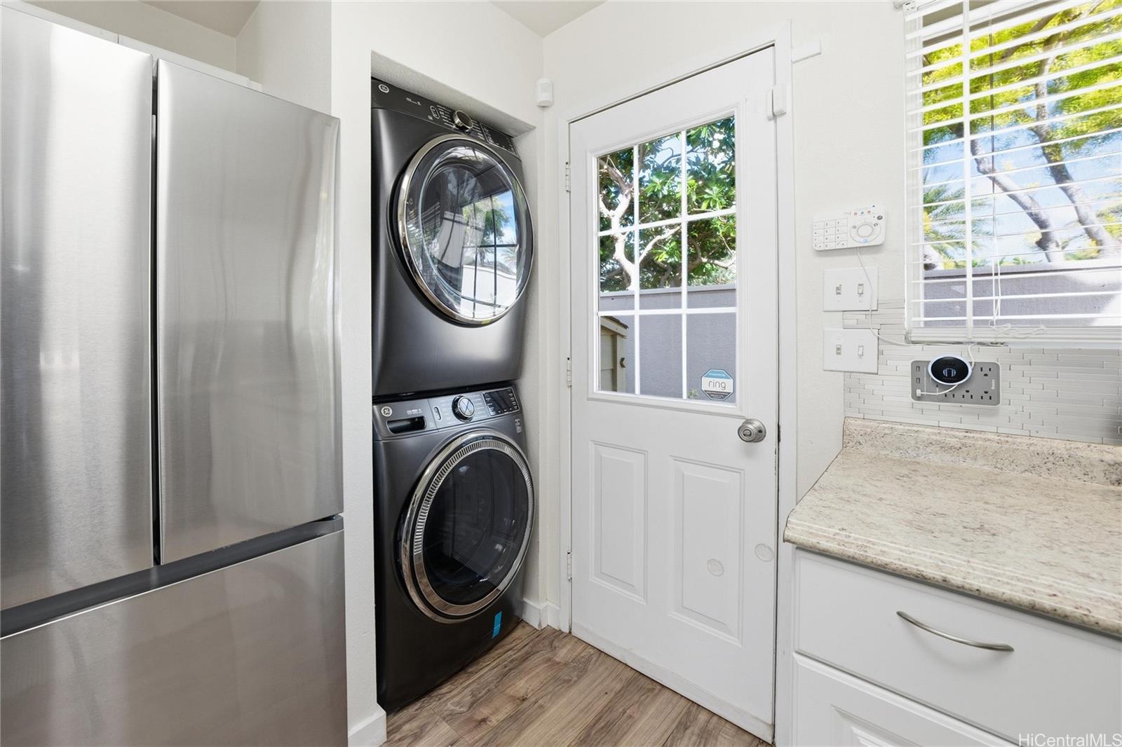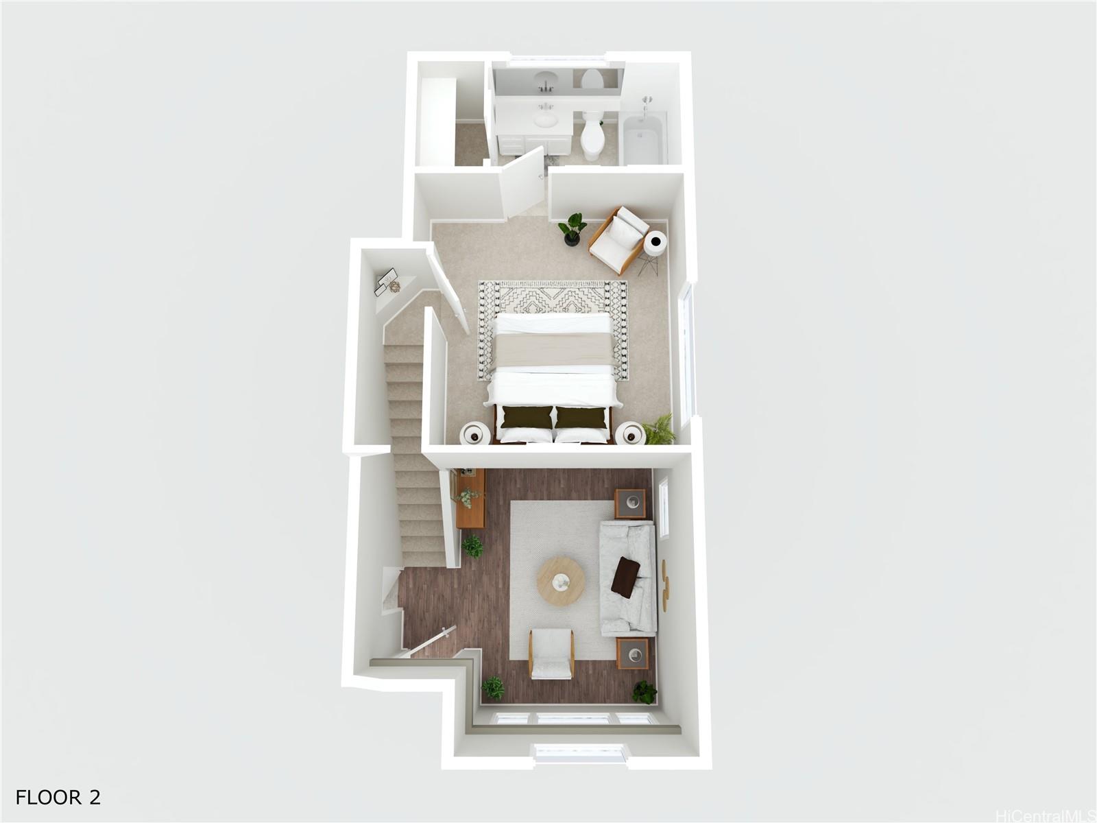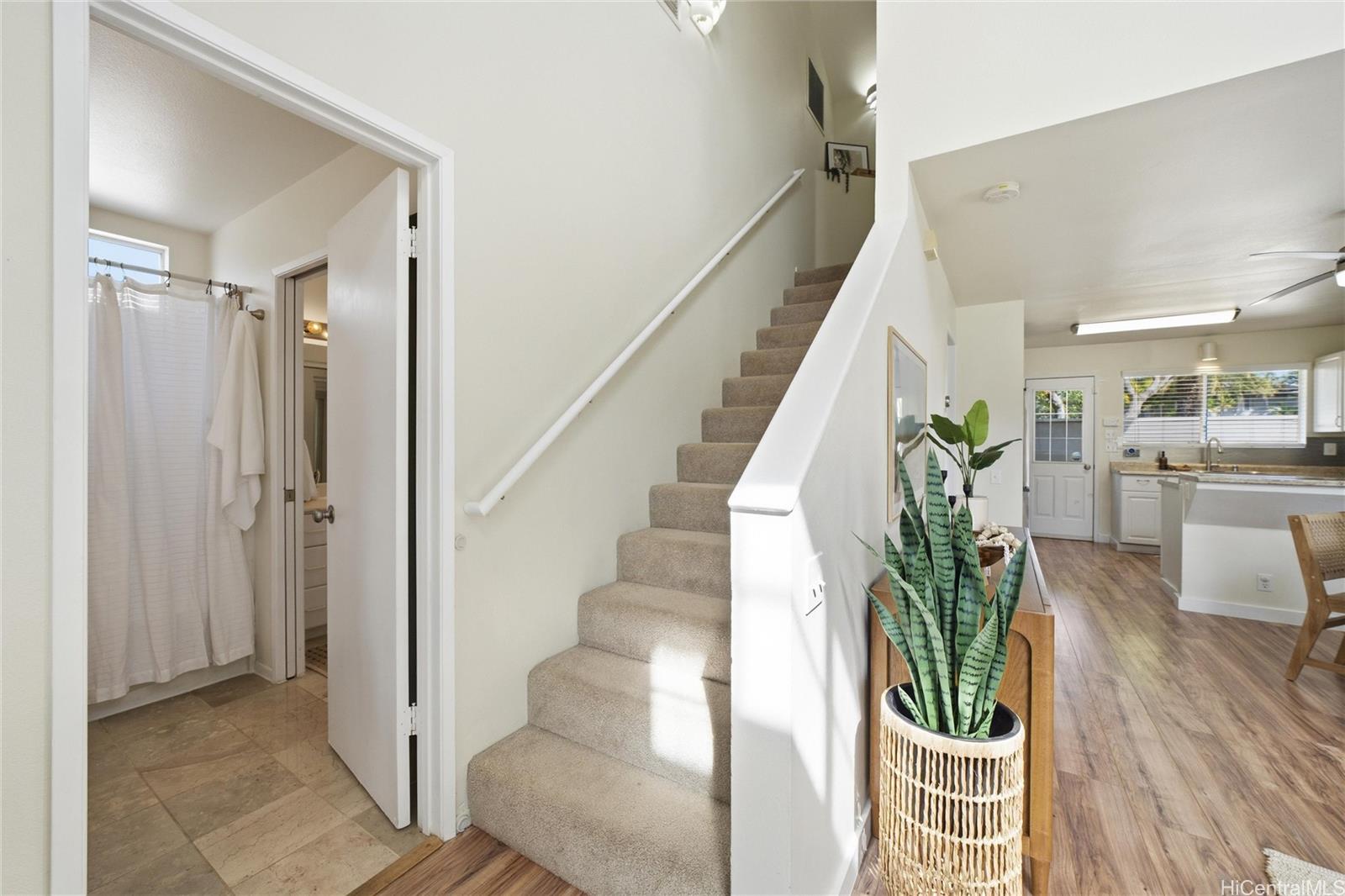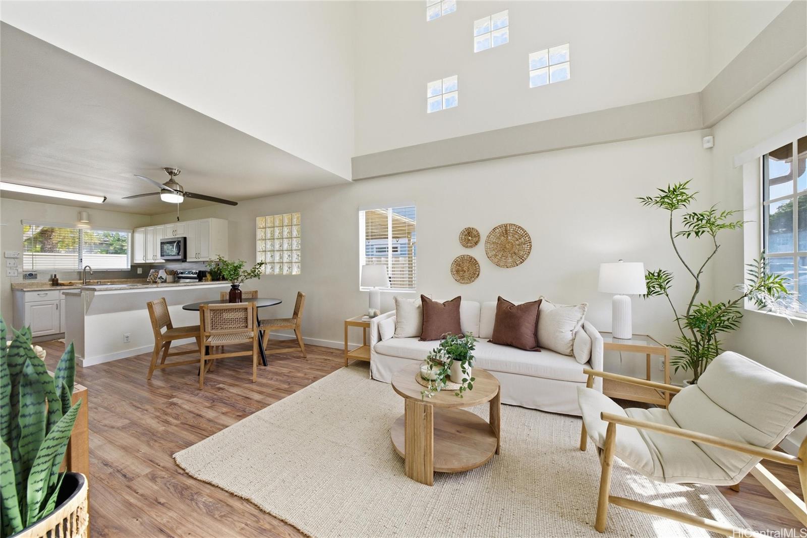 Price Improvement! This beautifully maintained 2-bedroom, 2-bath home features a spacious layout with vaulted ceilings, central air conditioning, and sleek vinyl laminate flooring. The primary suite with a full ensuite bath is conveniently located on the first floor, while the second bedroom and full bath offer privacy upstairs. Enjoy the convenience of a 2-car carport plus two additional driveway spaces, along with guest parking nearby. Positioned across from a lush green open space, this home offers a peaceful setting in a thriving community. Modern upgrades include updated appliances and a powerful energy-efficient setup with 21 owned photovoltaic panels and 2-Tesla Powerwall batteries—helping you save on utilities. Located in the heart of Ewa, you're just minutes from shopping, dining, entertainment, banks, the post office, and public transportation. BONUS: This property comes with a VA assumable loan at an incredibly low 2.25% interest rate. This is an exceptional opportunity for qualified VA buyers. Maintenance Fee will actually be DECREASING to $400.17 in January 2026! Listing by: Corcoran Pacific Properties (808) 589-2040