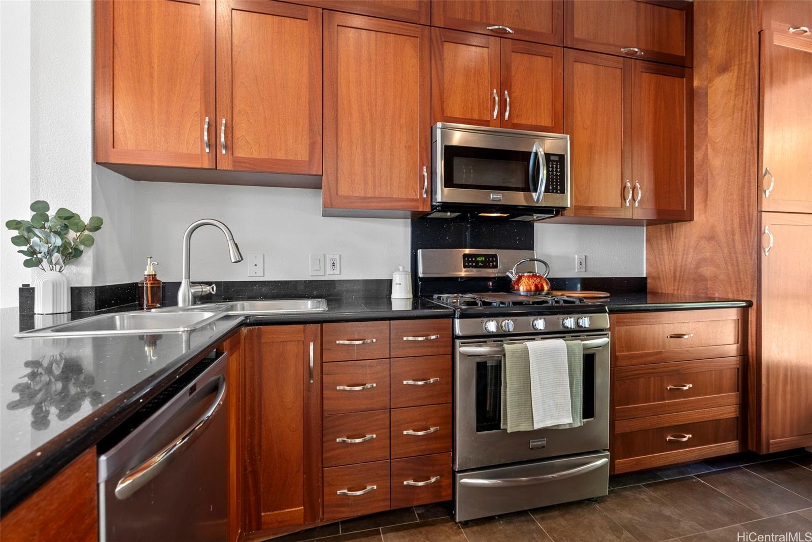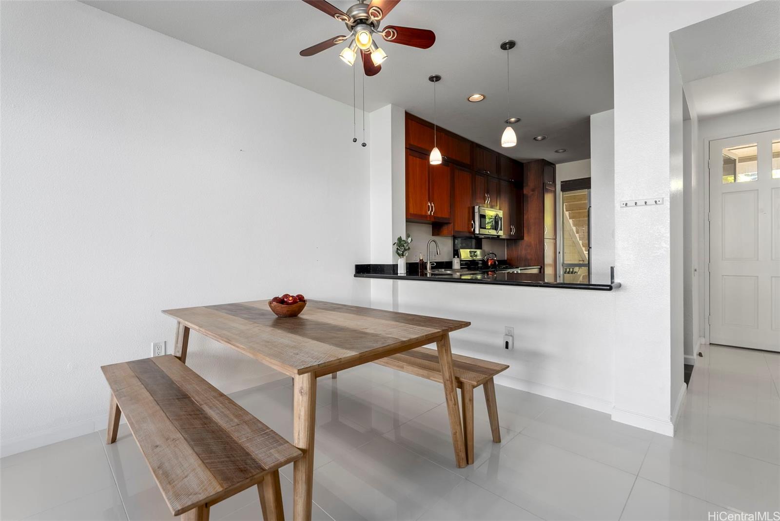 [0] => Don’t miss this gorgeously updated ground-floor townhome in the well-maintained Kekuilani Villas. This delightful 2-bedroom, 1-bathroom home with 2 assigned parking stalls features desirable golf course views overlooking Kapolei Golf Course. Inside, enjoy an updated kitchen and bathrooms, tile flooring throughout, and high ceilings that create a bright and airy atmosphere. Residents also enjoy access to community amenities including a pool and BBQ area, along with ample guest parking for family and friends. Conveniently located near Ka Makana Ali‘i Mall, shops, eateries, boutiques, daily necessities, and the rail, this move-in ready home offers the perfect blend of comfort and lifestyle.