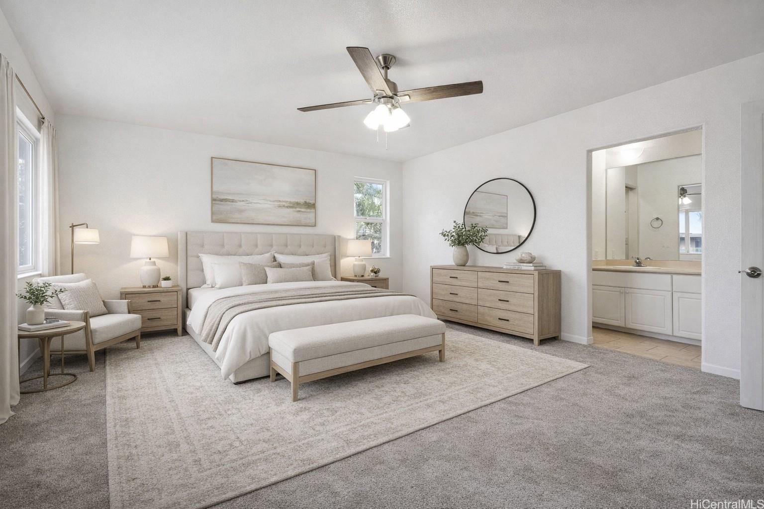 Rare bidding opportunity in Kapolei's sought-after Iwalani community. This 4-bedroom, 2.5-bathroom single-family home features nearly 1,930 sqft of living space with dramatic high ceilings in the main living area, making it one of the largest floor plans in the neighborhood. An assumable VA loan at 1.75% offers qualified buyers a rare and significant financial advantage at a fraction of today's rates. All bedrooms and full baths located upstairs for privacy with an open main level perfect for daily living and gathering. Situated on an oversized 4,436 sqft lot with a fully fenced backyard ideal for pets and kids, an attached 2-car garage, tile roof, Mediterranean-style architecture, and 19 owned solar PV panels to offset electricity costs. Easily access Villages of Kapolei Community Pool, walking distance to Kapolei Elementary, Middle, and High Schools and minutes from Ka Makana Ali'i Shopping Mall, Costco, West Oahu beaches, and H-1 freeway access. Don't miss your chance to bid have your agent see MLS Agent Remarks for auction terms and details.