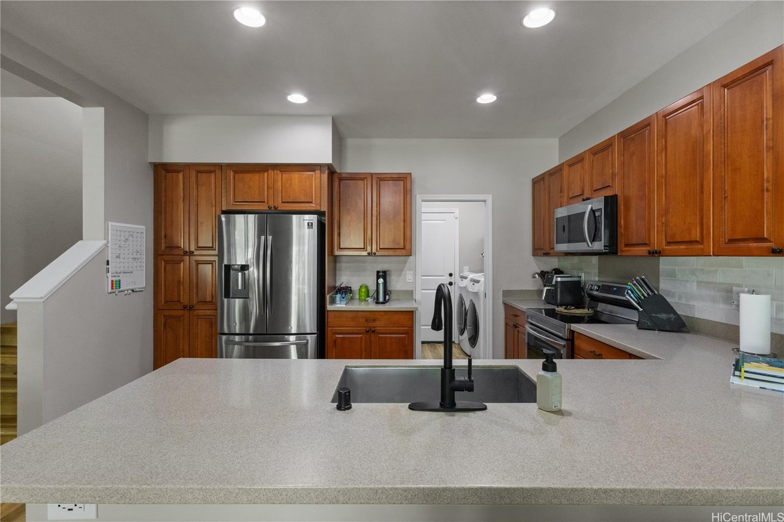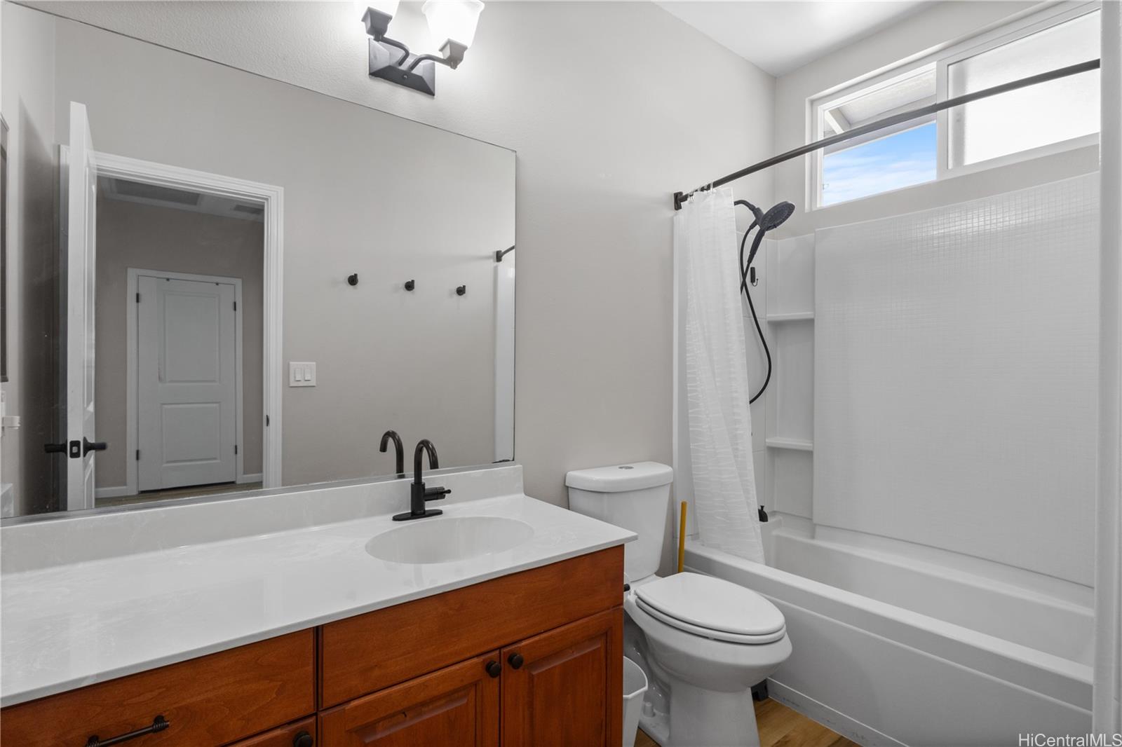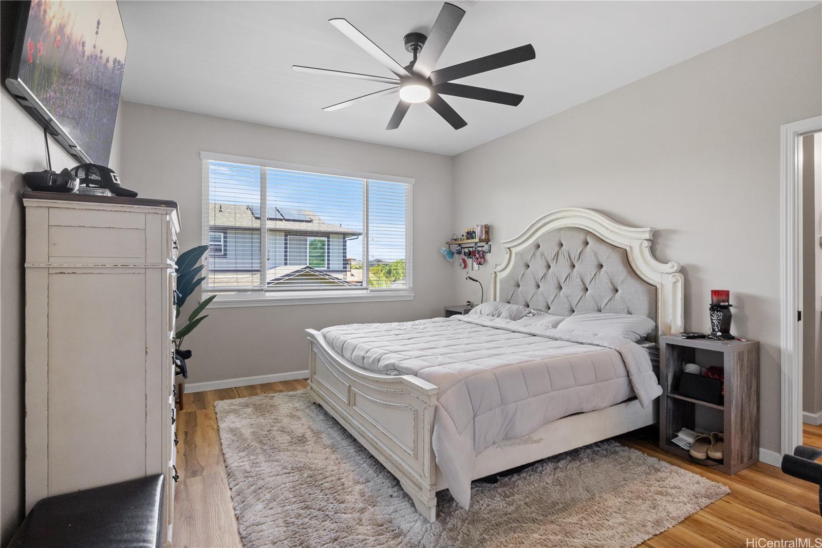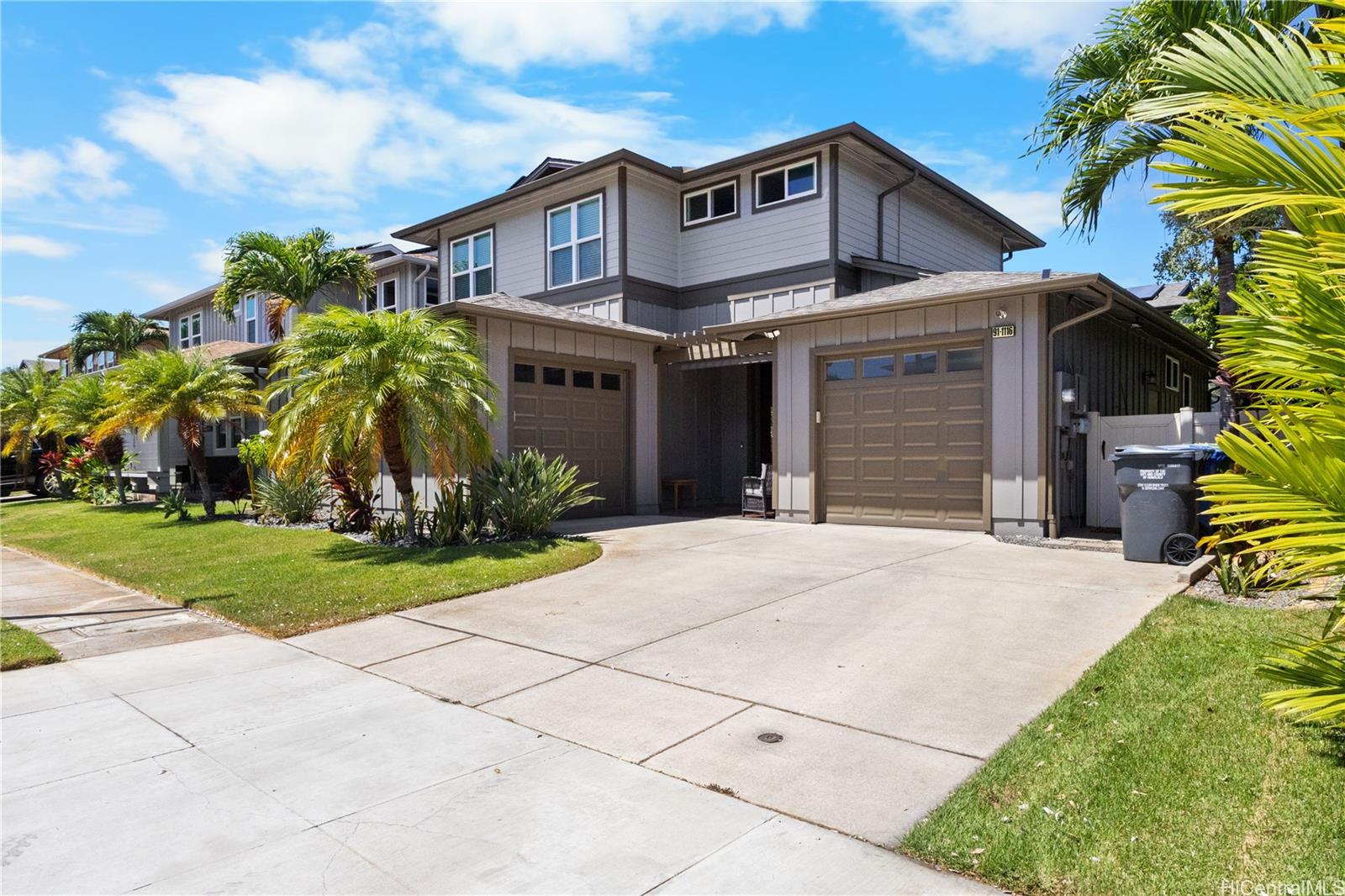 Experience upscale, laid-back island living in Ewa Gentry’s coveted Sandalwood community. It greets you with beautifully landscaped streets that make every day feel like a retreat, not a routine. Upon entering, you’ll appreciate the thoughtfully designed open-concept floor plan, ideal for both effortless entertaining and serene everyday living. The main level features a bedroom and full bathroom, offering a solution for guests or a practical home office. Upstairs, retreat to the primary suite - your private sanctuary, designed for rest and rejuvenation. Additional beds & baths are thoughtfully laid out to provide privacy and comfort for all. Function meets sophistication with two separate one-car garages, one of which is currently set up as a gym, and the other garage now features a Tesla charger. The spacious driveway accommodates two additional vehicles, while plentiful street parking ensures convenience for visitors. Set on a quiet cul-de-sac away from the bustle of main roads, this home offers a peaceful, elevated lifestyle just minutes from shopping, dining, golf courses, and beaches. Discover the perfect blend of style, space, and serenity - island living at its finest. Listing by: Real Broker (855) 450-0442