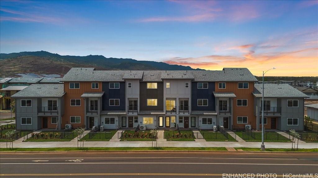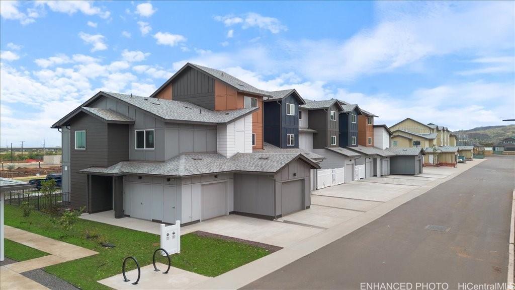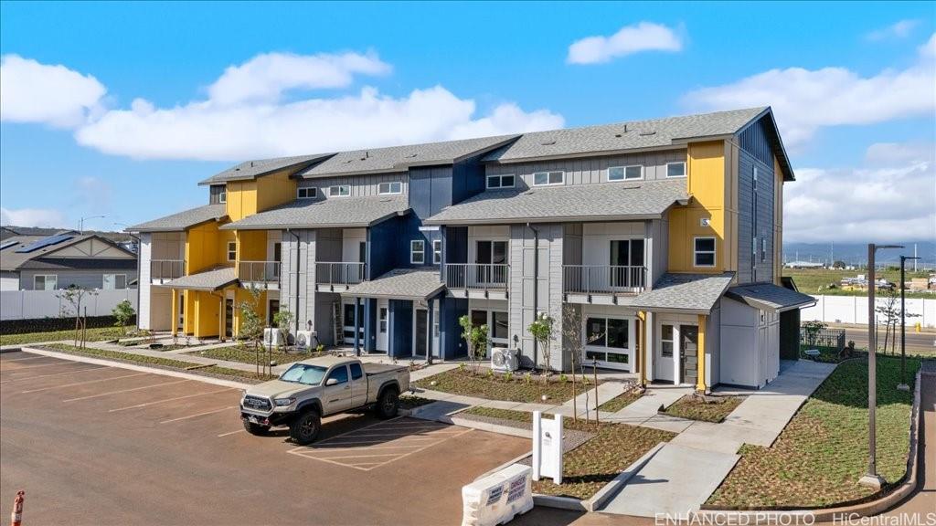 These two stories 2 bedroom and 2-bathroom end unit condominium consists of 1,004 square feet of net living area. When you step into this home, you will be greeted by a staircase that leads you into the living room which flows seamlessly into the kitchen featuring stainless steel appliances and white soft-close cabinets. On this floor, you'll find the primary bedroom with a walk-in closet and ensuite bathroom with a double vanity, water closet and walk-in shower. Down the hall, you're greeted by the secondary bedroom with a generously sized closet and mirrored sliding doors. Additionally, the secondary bathroom includes a combination bathtub and shower. Attached to this home is a single-car garage. Split air conditioning and modern appliances including a range/oven, micro-hood, dishwasher, refrigerator, and washer/dryer allow for ease of living. Listing by: D R Horton Hawaii, LLC (808) 366-0085