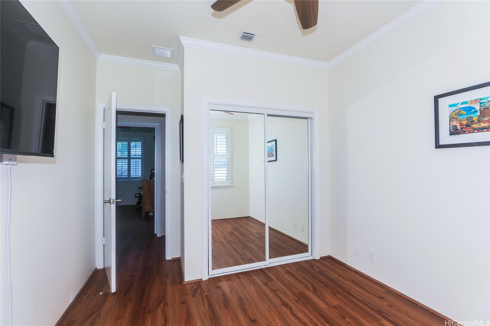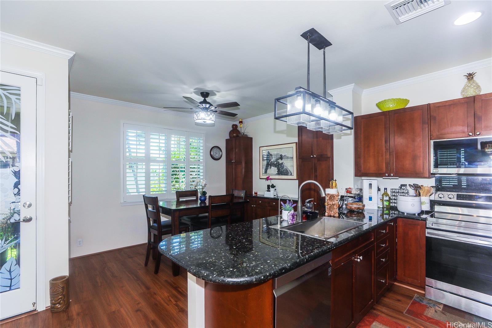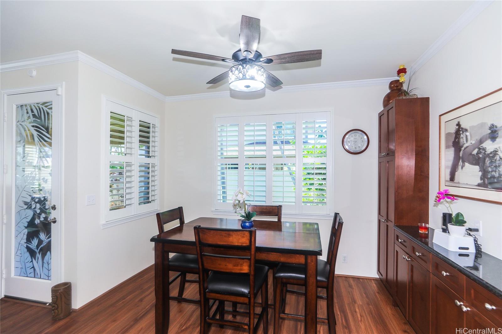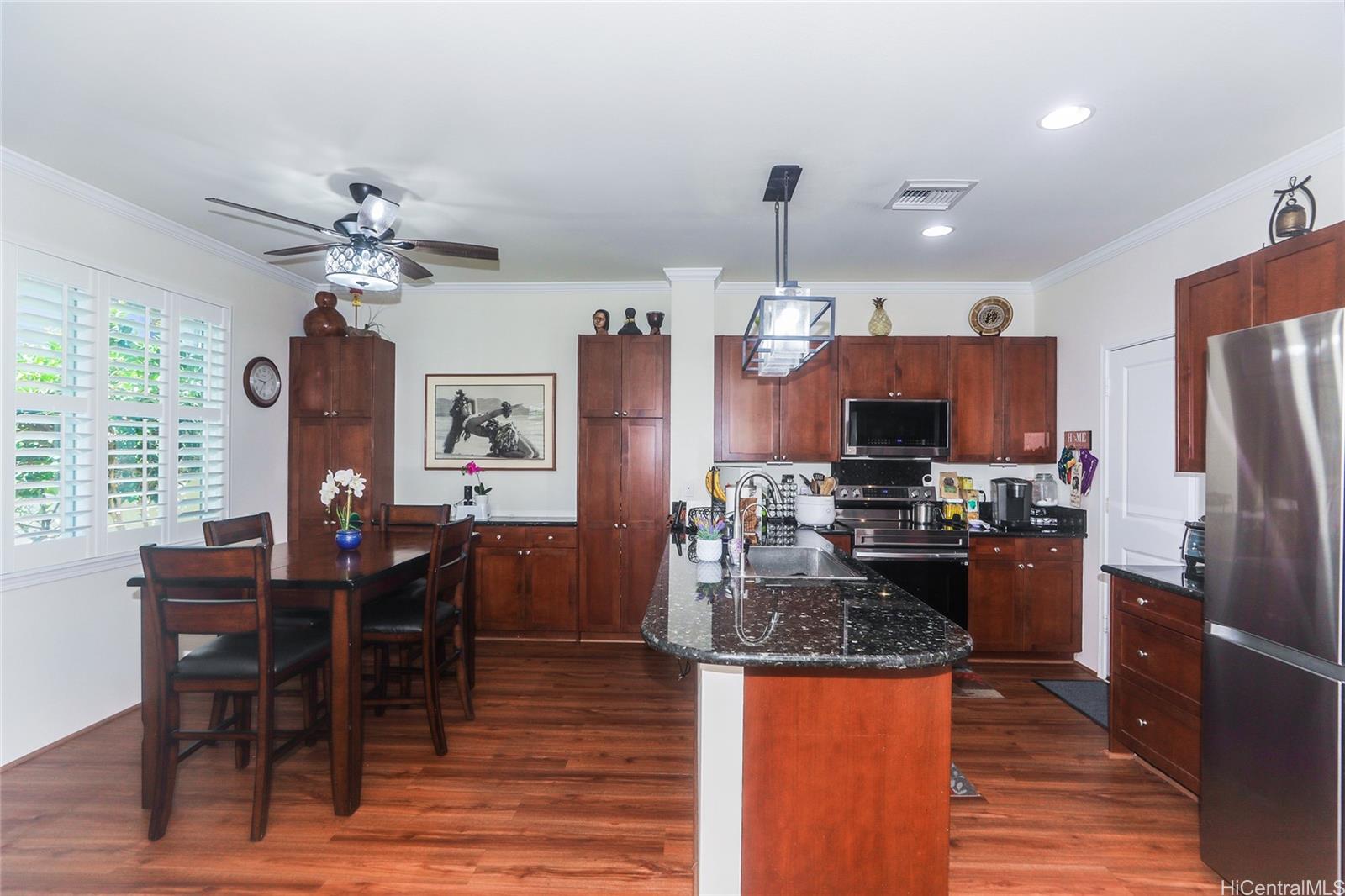Gentry Latitudes community! Rarely available 4 bedroom, 3 bath single level home with 1 Bedroom and Full bath on first floor. 19 Owned PV panels (Net metering.) When you enter the home, you will be impressed with the open floor plan and one of a kind upgraded personal touches: Crown molding, plantation shutters, high end laminate wood flooring throughout, Central A/C replaced in 2019 with UV return vent to help kill germs. Upgraded ceiling fans and kitchen chandelier. Stunning main bathroom walk in shower. Keypad front door lock, Ring cameras and ADT Security system: Cameras, window and door sensors. Very quiet and private landscaped yard is ideal for BBQs, family gatherings or just enjoying some quiet time. Fantastic shopping and entertainment only minutes away. Garage features a Split A/C and Wi-Fi remote opener. **Seller is offering a $3,000 credit to the buyer for closing costs** Listing by: Help-U-Sell Honolulu Prop. (808) 255-3220