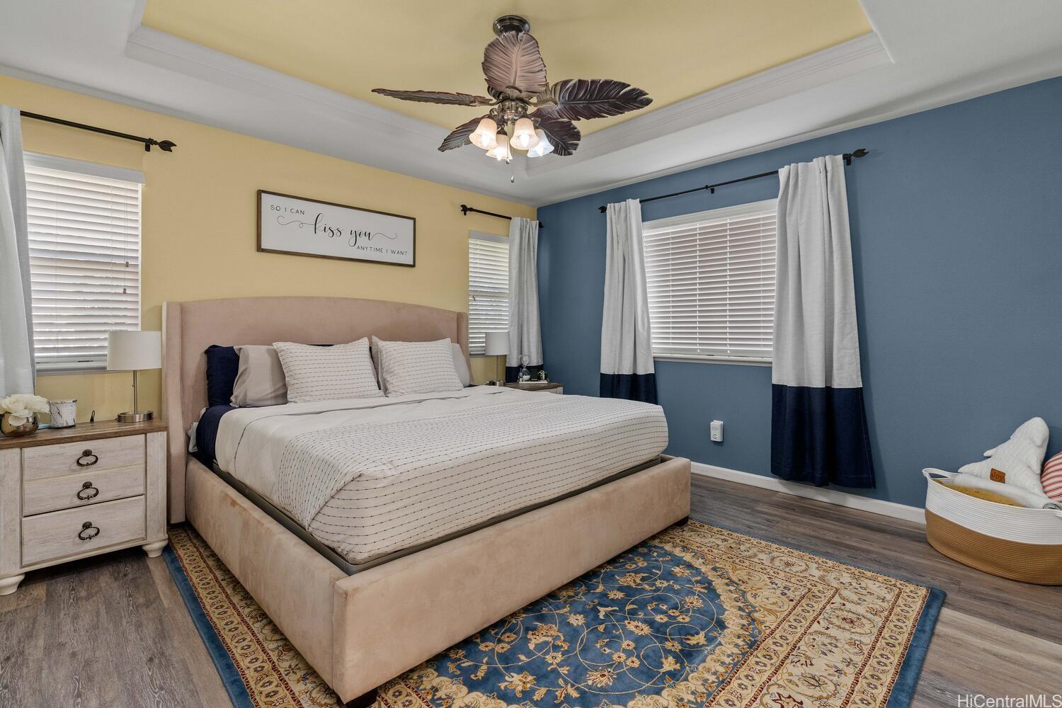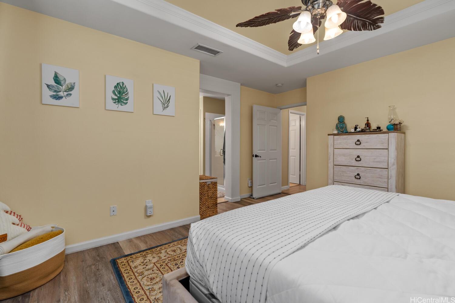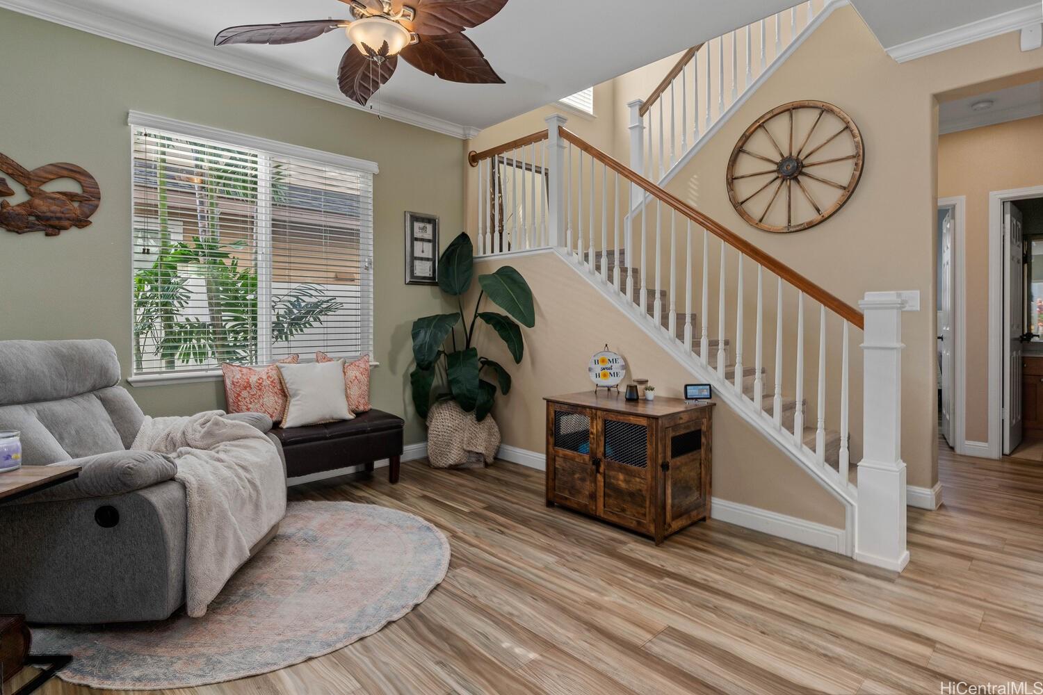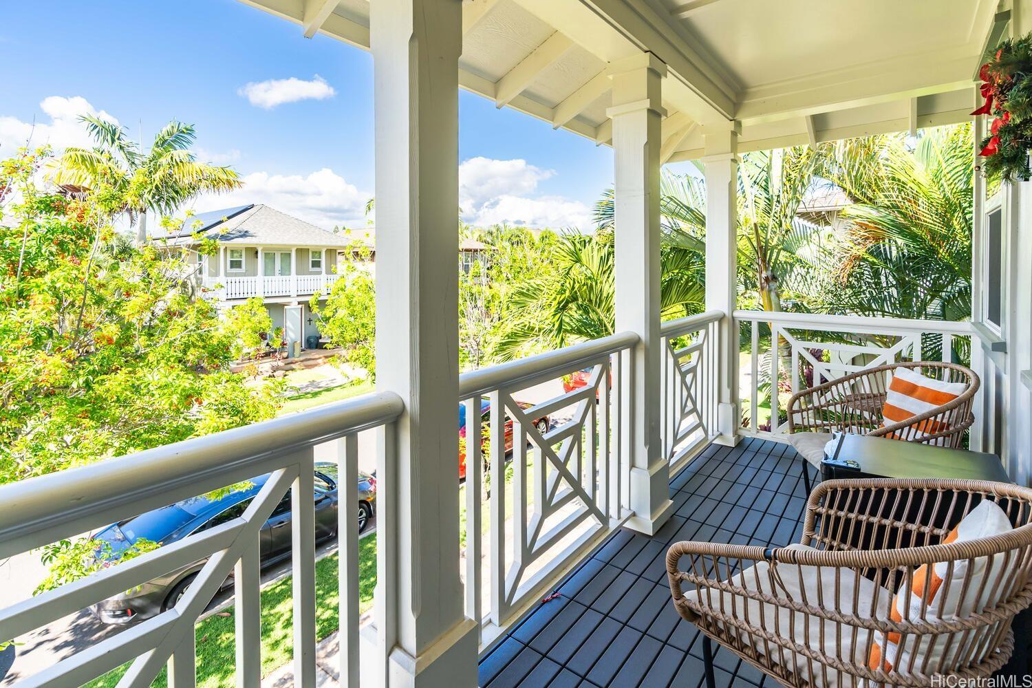 Stunning 4-bedroom, 3-bath single-family home in Ka Makana at Hoakalei — quietly situated at the back of the neighborhood with a private upstairs balcony and beautifully landscaped tropical yard. Meticulous pride of ownership with custom-engineered vinyl plank flooring, crown molding, and built-in wiring for surround sound. Over 100K in owned solar panels, 42 total, and two owned Tesla Powerwall 3 batteries for significantly reduced energy costs. Spacious great room, separate dining area, and an open kitchen with updated appliances, custom shelving, spice rack, and abundant storage. Convenient full bedroom and full bath on the ground floor, plus a large walk-in storage closet; oversized washer and dryer included. Upstairs features three bedrooms, including the primary with an ensuite and a custom loft office offering sunset views. HOA includes cable, internet, home phone, pool, tennis courts, and fitness center. Short walk or bike ride to Wai Kai Club and award-winning Hoakalei Country Club and Golf Course; close to schools, shopping, and beaches. Balance on loan: 1,135,196.17; interest rate: 4.75%; monthly payments: 6,383.80. Difference of 159,804. payoff good through April 2026 Listing by: RE/MAX Honolulu (808) 426-8772
