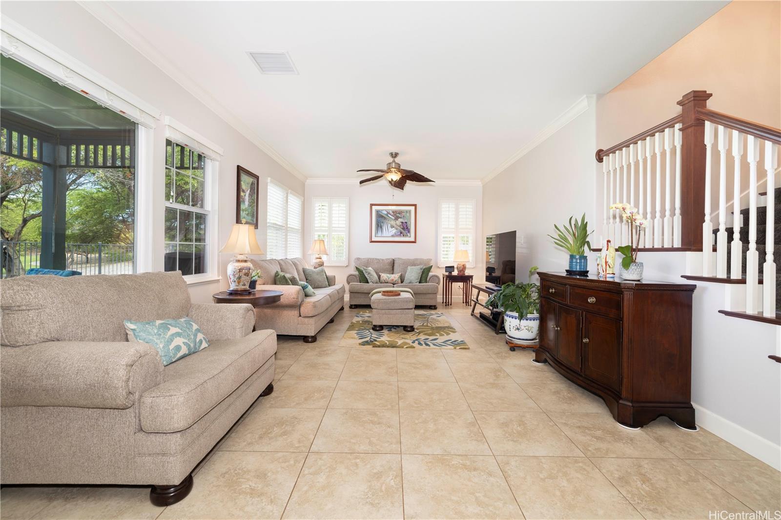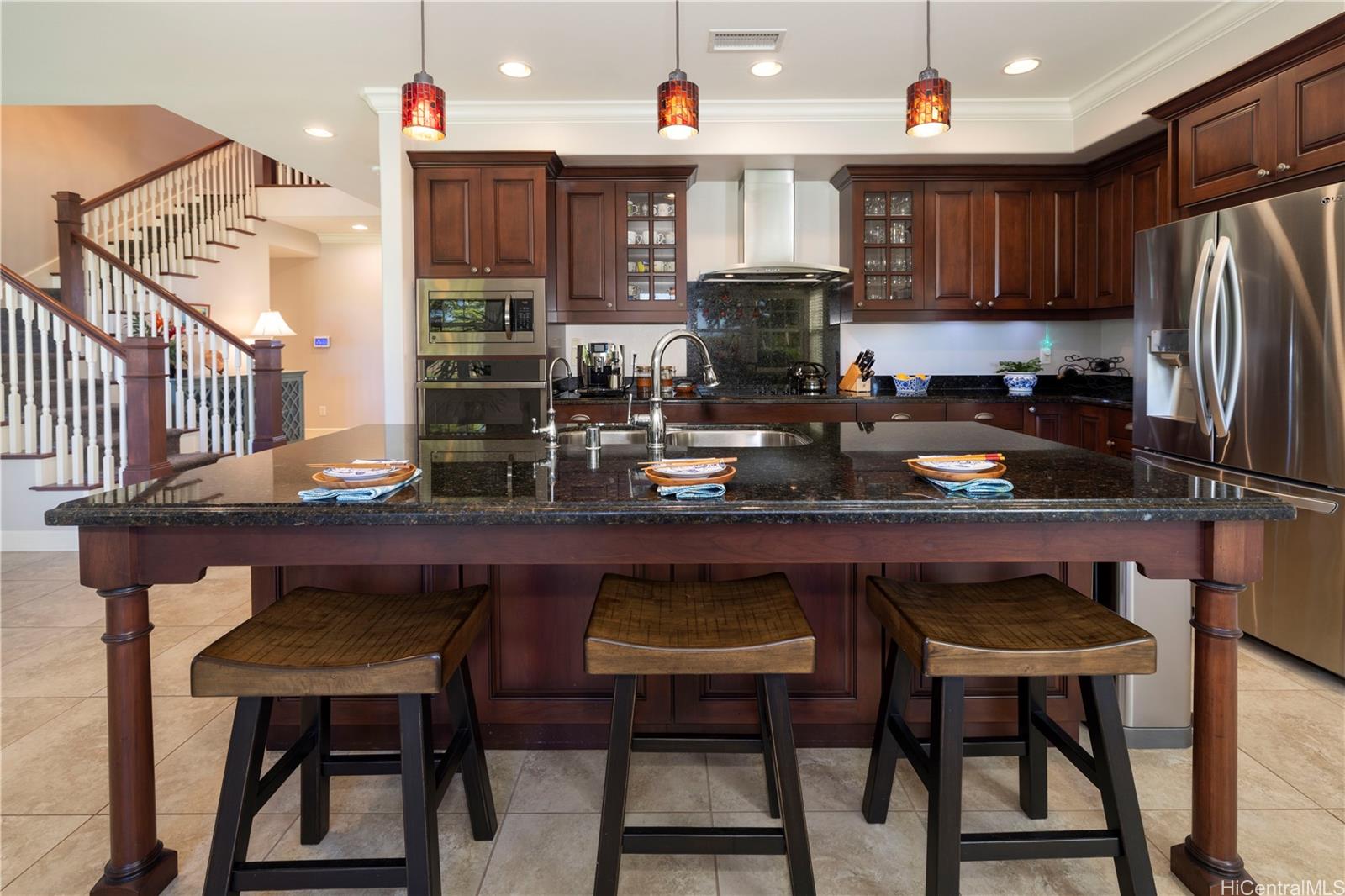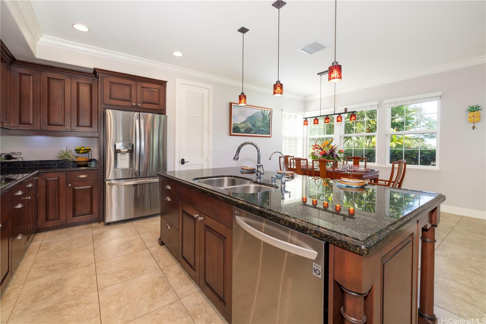 [0] => Fronting the Hoakalei Golf Course, this meticulous 4-bedroom home is refined island living! From the welcoming foyer, the French doors open to a bonus room—ideal as a private office, reading retreat, or den—along with a main-level bedroom & full bathroom, perfect for guests or multi-generational living. The modern kitchen has upgraded cabinetry, stainless steel appliances, granite counters, and a large island with additional seating.