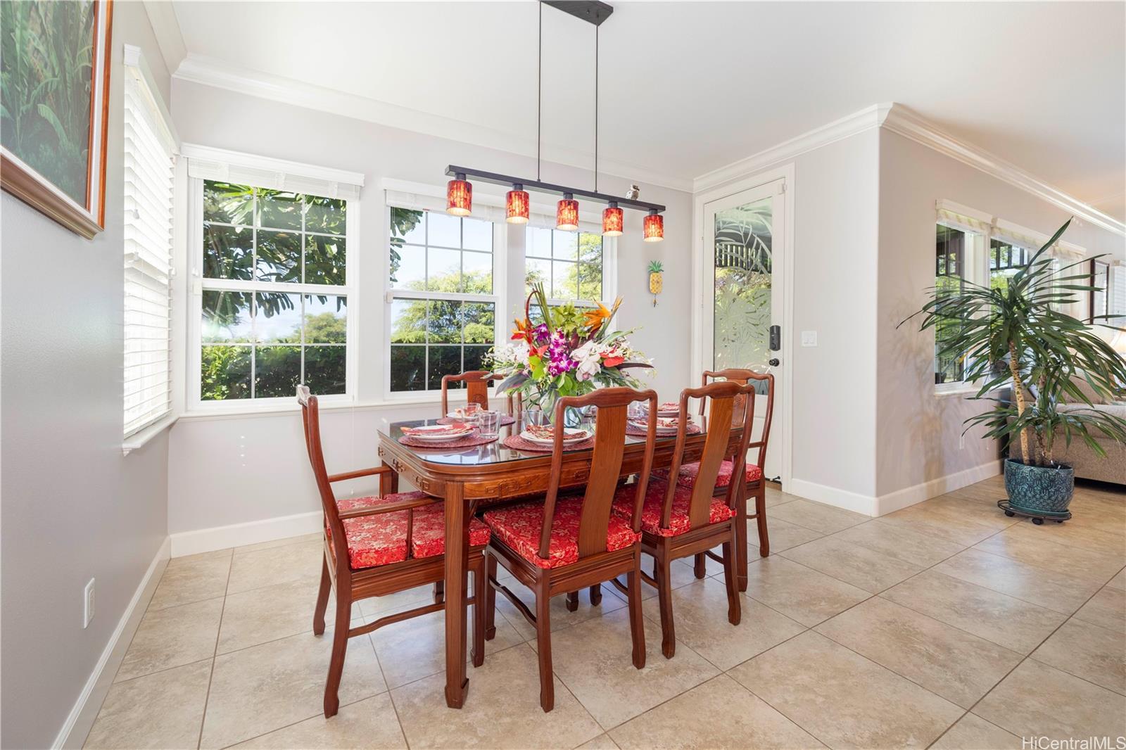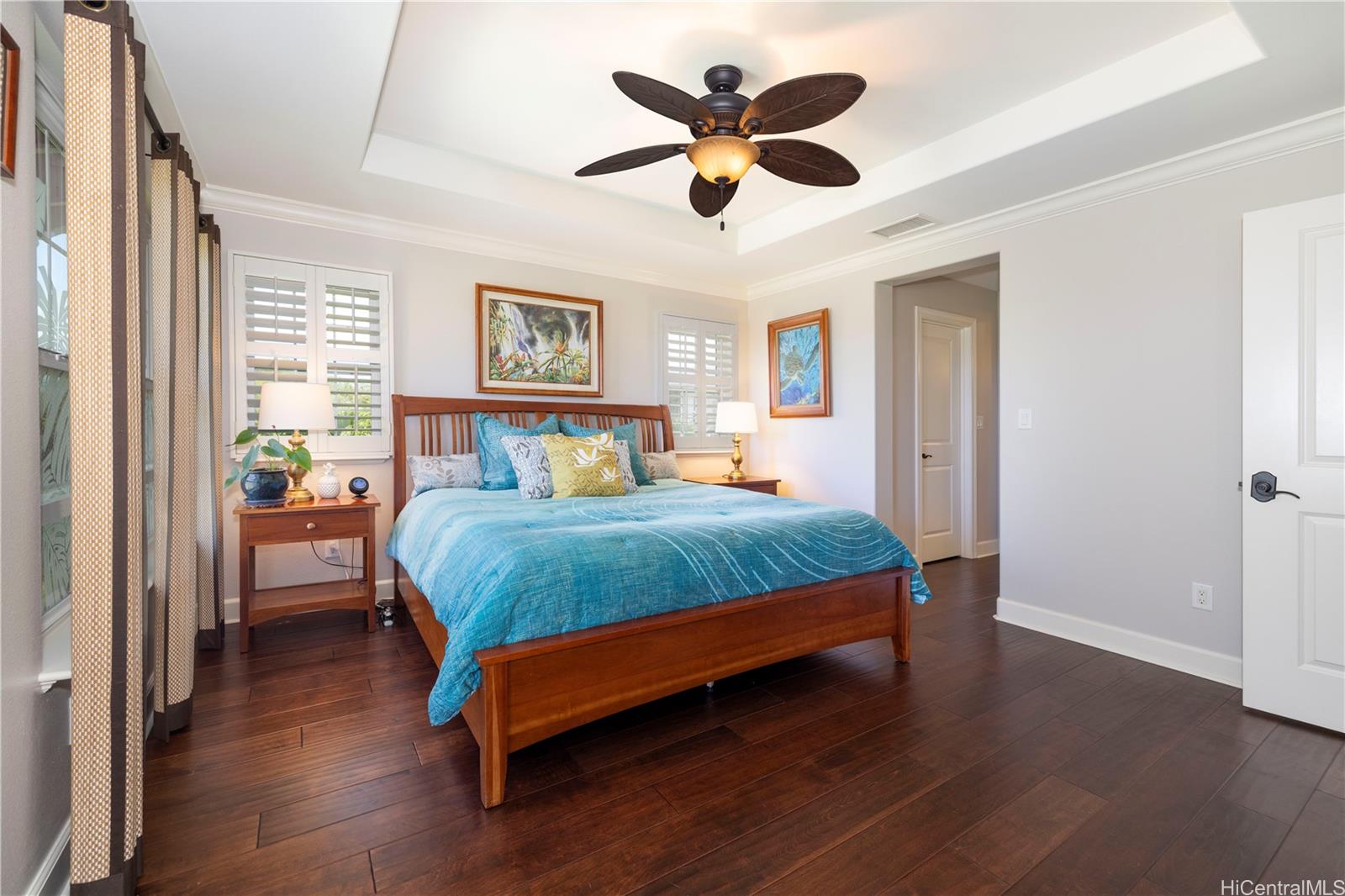 string(1209) "Fronting the Hoakalei Golf Course, this meticulous 4-bedroom home is refined island living! From the welcoming foyer, the French doors open to a bonus room—ideal as a private office, reading retreat, or den—along with a main-level bedroom & full bathroom, perfect for guests or multi-generational living. The modern kitchen has upgraded cabinetry, stainless steel appliances, granite counters, and a large island with additional seating.