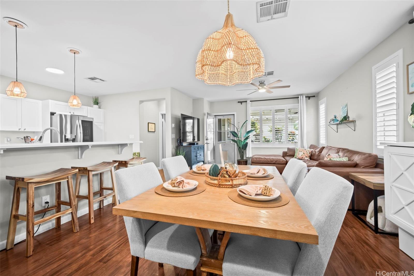 Single-level 3-bed, 2-bath townhome in the sought-after Ka Makana at Hoakalei community, meticulously maintained with updates that make it feel brand new. Stylish laminate floors, plantation shutters, and stainless-steel appliances create a polished backdrop, while the primary suite offers a spacious walk-in closet. Central AC and a solar water heater ensure year-round comfort and efficiency. The private outdoor patio is perfect for coffee mornings or evening gatherings. Two-car garage with extra storage. Just a short stroll to resort-style amenities such as the pool, hot tub, fitness center, tennis, pickleball, and BBQs. Plus, a dog park and guest parking nearby. Association fees include cable, internet, phone, water, sewer, and community amenities. Optional fee access to the Private Wai Kai Hale Lagoon. Close to sandy beaches, shopping, dining, schools, and Ka Makana Ali‘i mall. Listing by: Berkshire Hathaway HmSvc HI RE (808) 306-7242