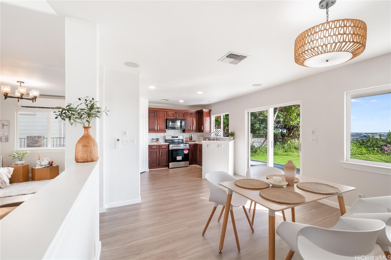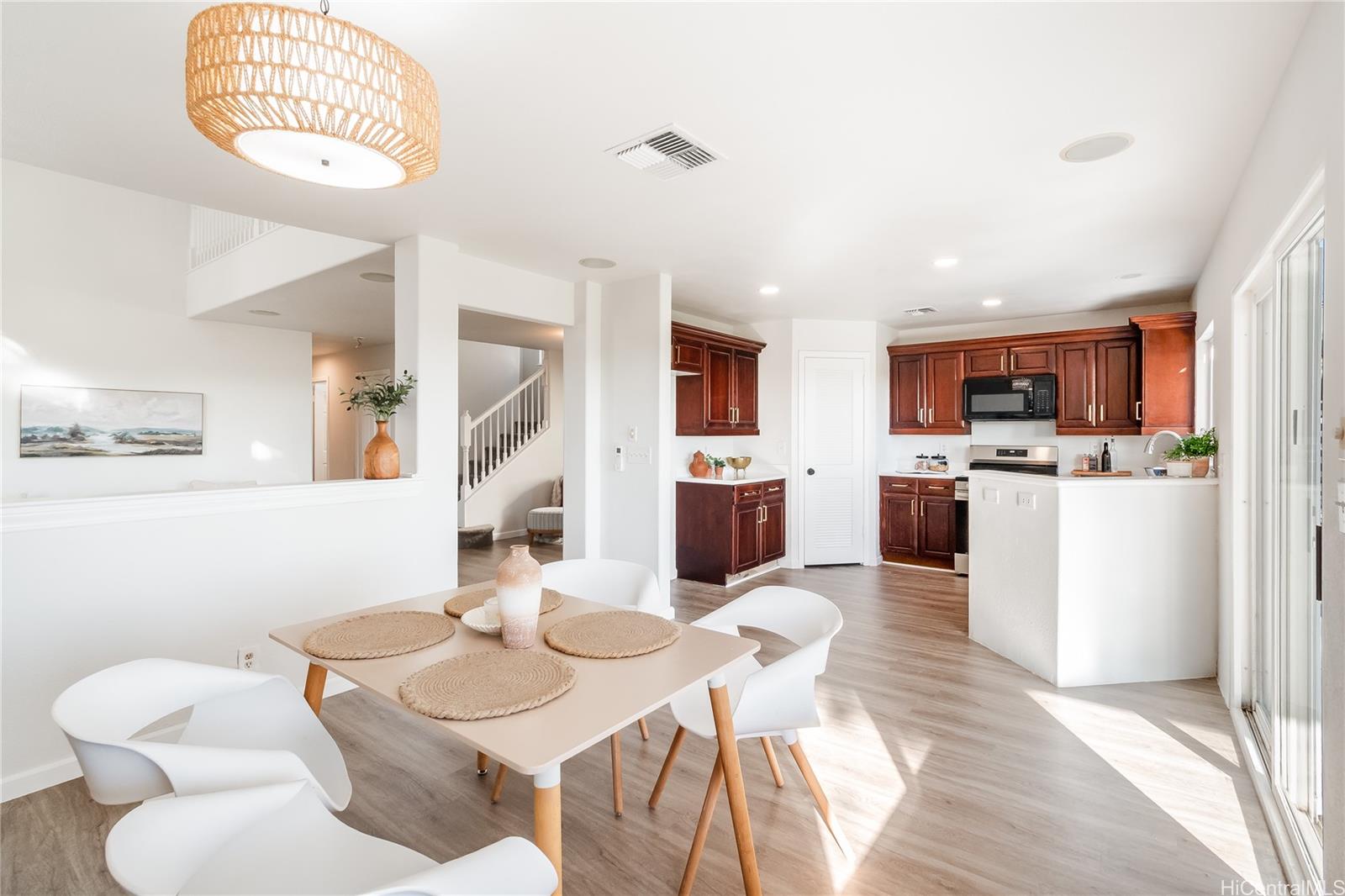 [0] => Your Kapolei Knolls hideaway — refreshed, private, and full of potential. Located in one of Kapolei’s most desirable neighborhoods, this home offers a peaceful setting with wide streets, well-kept homes, and a true community feel. Recently refreshed with new interior paint, updated vinyl plank flooring downstairs, new carpet upstairs, and brand-new appliances, it’s clean, bright, and ready for move-in. The flexible layout includes a convenient main-level suite, perfect for guests or multi-generational living. Upstairs bedrooms provide privacy and separation, while the open living areas create a comfortable flow for everyday life.