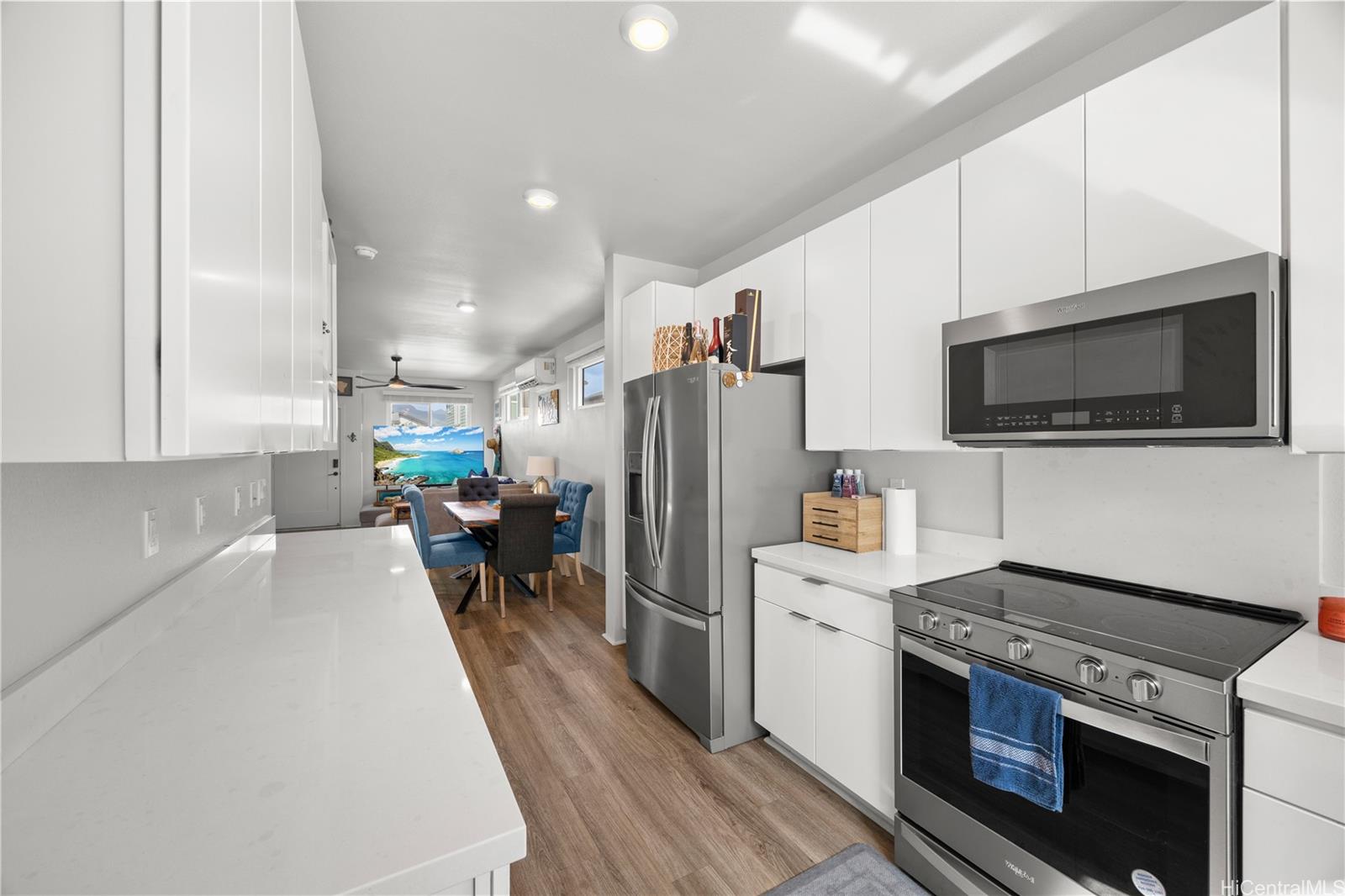 [0] => Welcome to your dream home in Ho'opili, Ewa Beach, Hawaii! This stunning 3-bedroom, 2.5-bathroom single family home offers modern island living with split AC, solid surface counters, stainless steel appliances and vinyl plank flooring, featuring a convenient powder room downstairs, a loft on the second floor, a primary suite with a walk-in closet and dual sinks, and a private backyard and a laundry room on the second floor where all of the bedrooms and closets are located and all within a vibrant master-planned community close to beaches, shopping, dining and other amenities, perfect for your Hawaii lifestyle! Just a short drive to the Skyline and the Kroc Center.