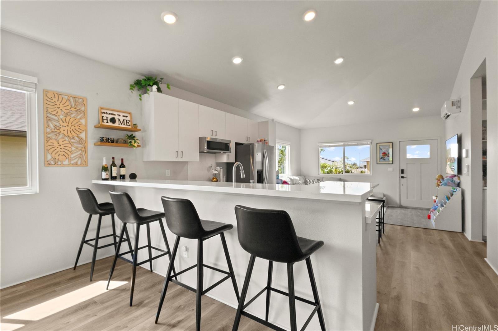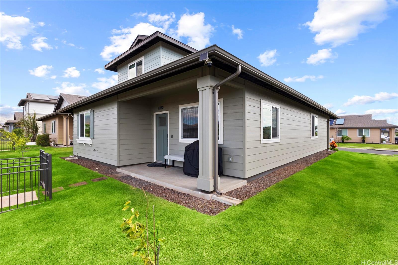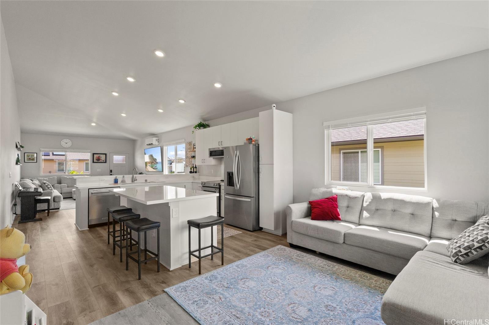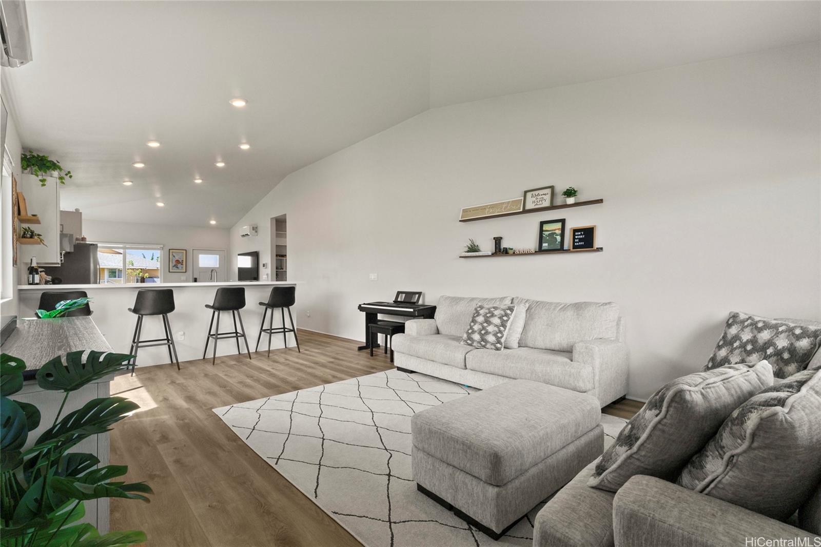 This stunning 4-bedroom, 2.5-bath single-family home offers modern comfort with timeless charm. The first-floor primary suite adds convenience, while soaring vaulted ceilings create an airy open-concept living space. A chef-inspired kitchen with quartz countertops, a large island, luxury vinyl plank flooring, and upgraded KitchenAid appliances make this home shine. Every bedroom includes split AC for year-round comfort, and thoughtful details like Solatube lighting, upstairs linen storage, and a dedicated laundry room elevate daily living. Step outside to your covered lanai, landscaped yard with irrigation, and Urban Garden. Complete with a 2-car garage, Smart Home system, solar water heater, and owned PV Panels. Listing by: eXp Realty (808) 589-9747