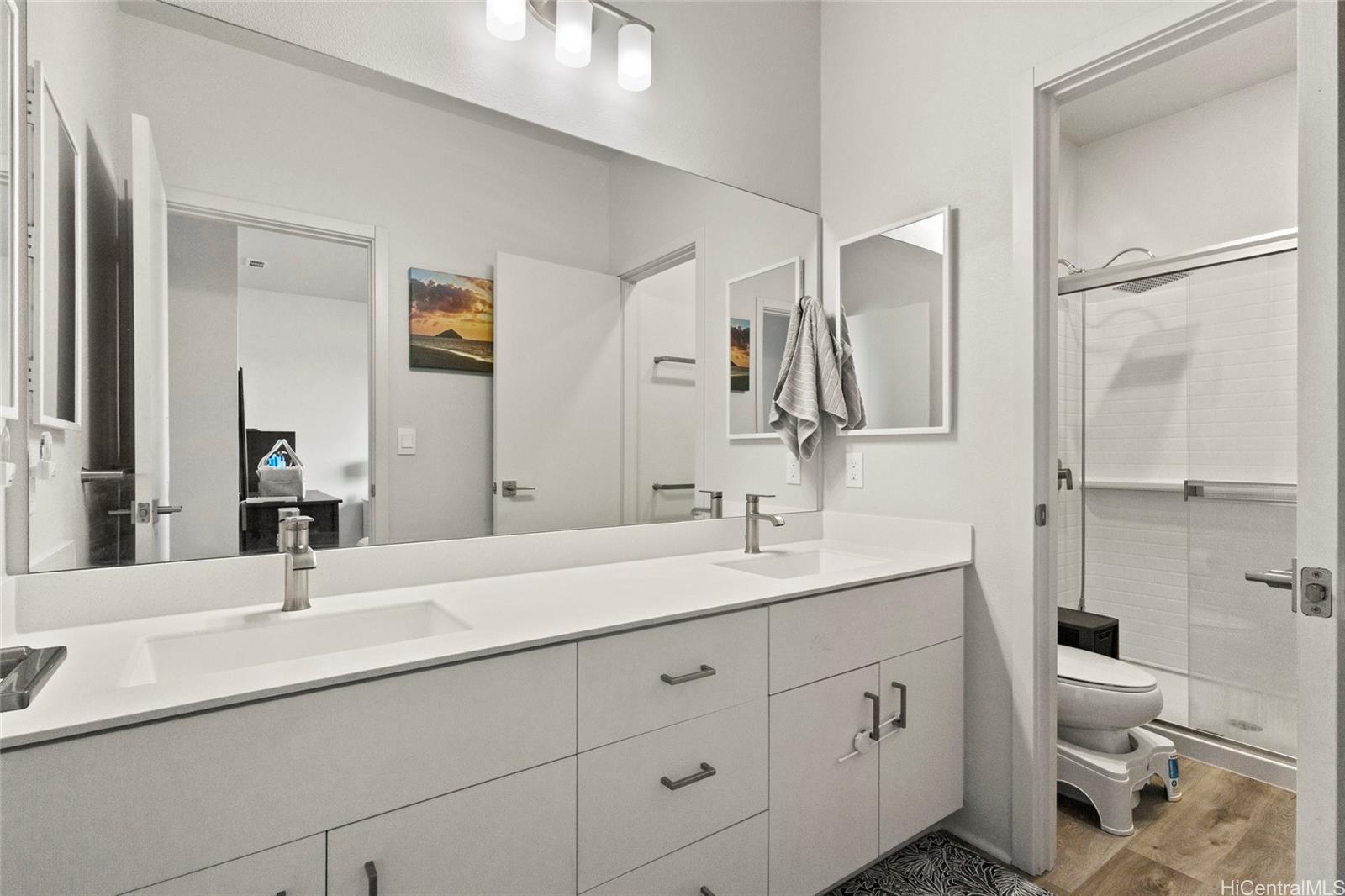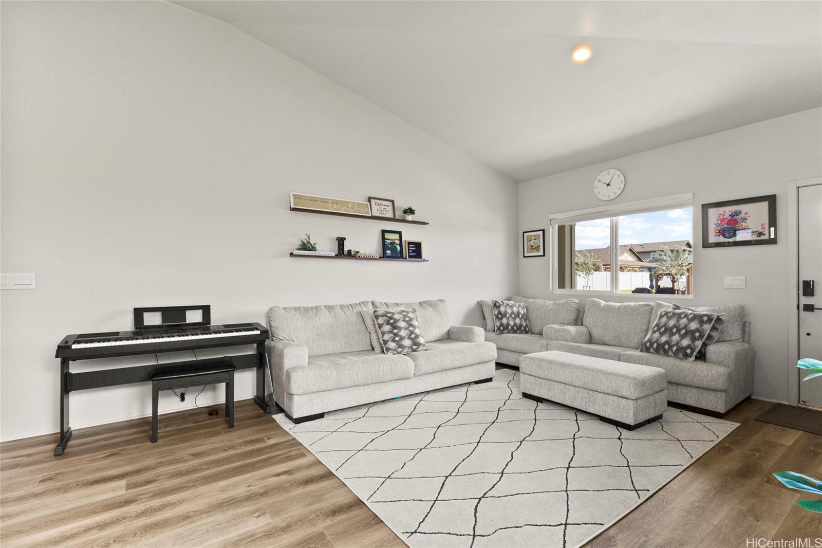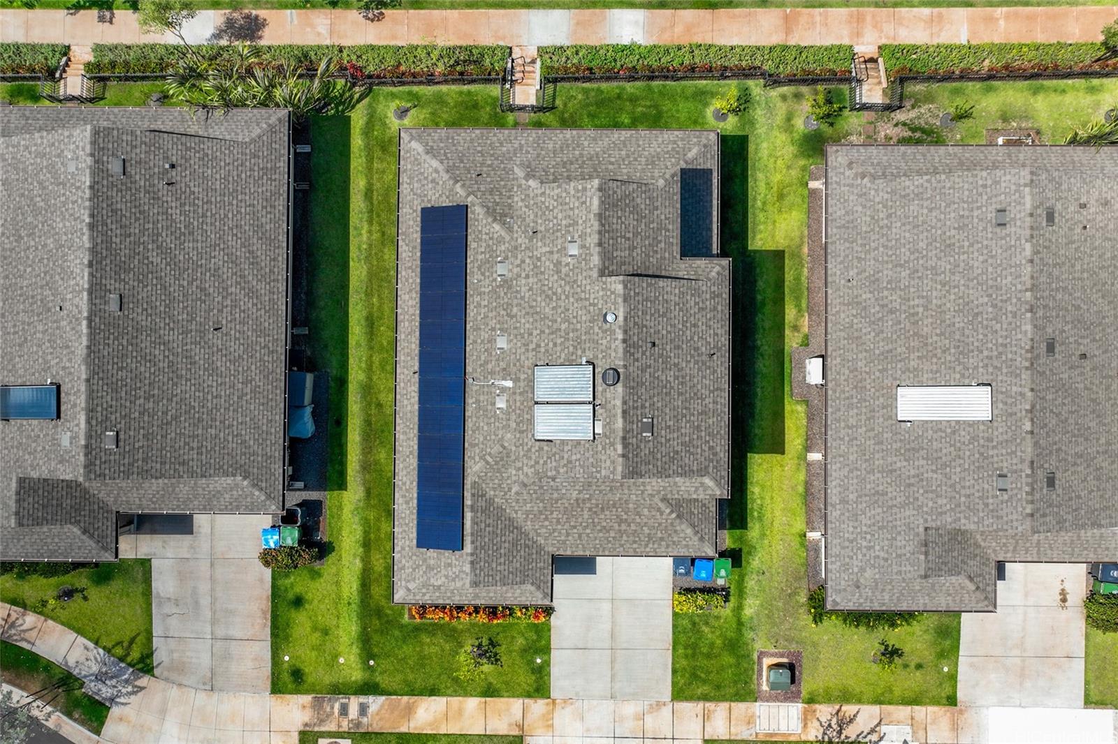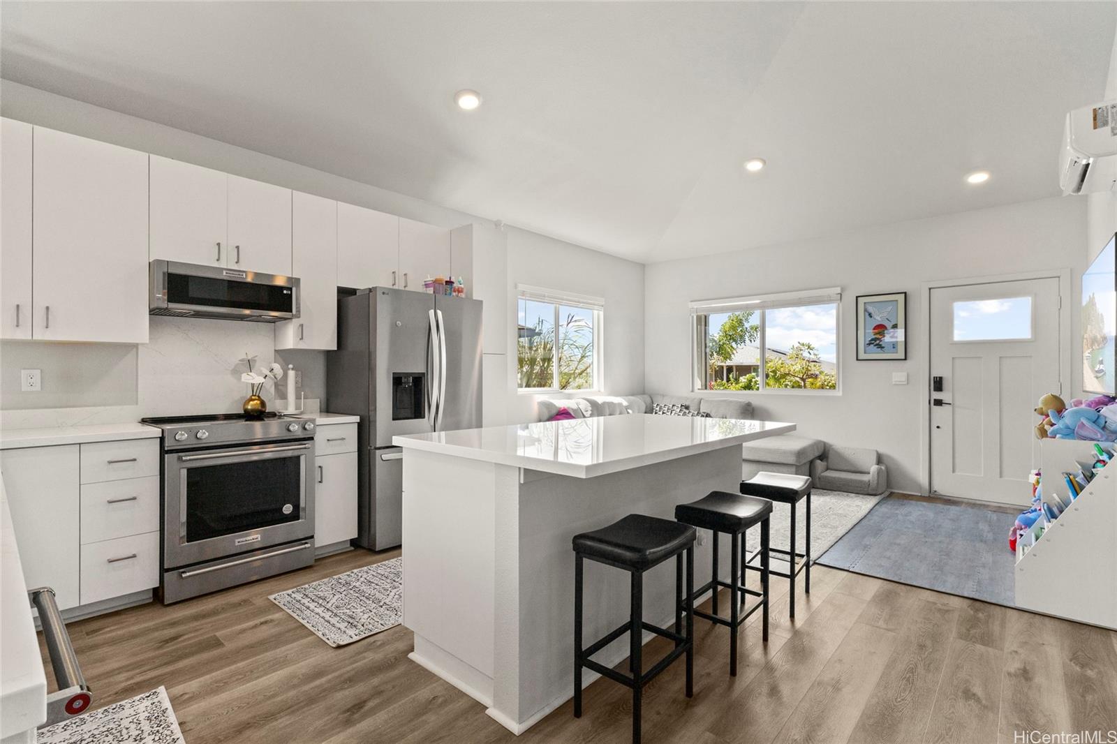 This stunning 4-bedroom, 2.5-bath single-family home offers modern comfort with timeless charm. The first-floor primary suite adds convenience, while soaring vaulted ceilings create an airy open-concept living space. A chef-inspired kitchen with quartz countertops, a large island, luxury vinyl plank flooring, and upgraded KitchenAid appliances make this home shine. Every bedroom includes split AC for year-round comfort, and thoughtful details like Solatube lighting, upstairs linen storage, and a dedicated laundry room elevate daily living. Step outside to your covered lanai, landscaped yard with irrigation, and Urban Garden. Complete with a 2-car garage, Smart Home system, solar water heater, and owned PV Panels. Listing by: eXp Realty (808) 589-9747