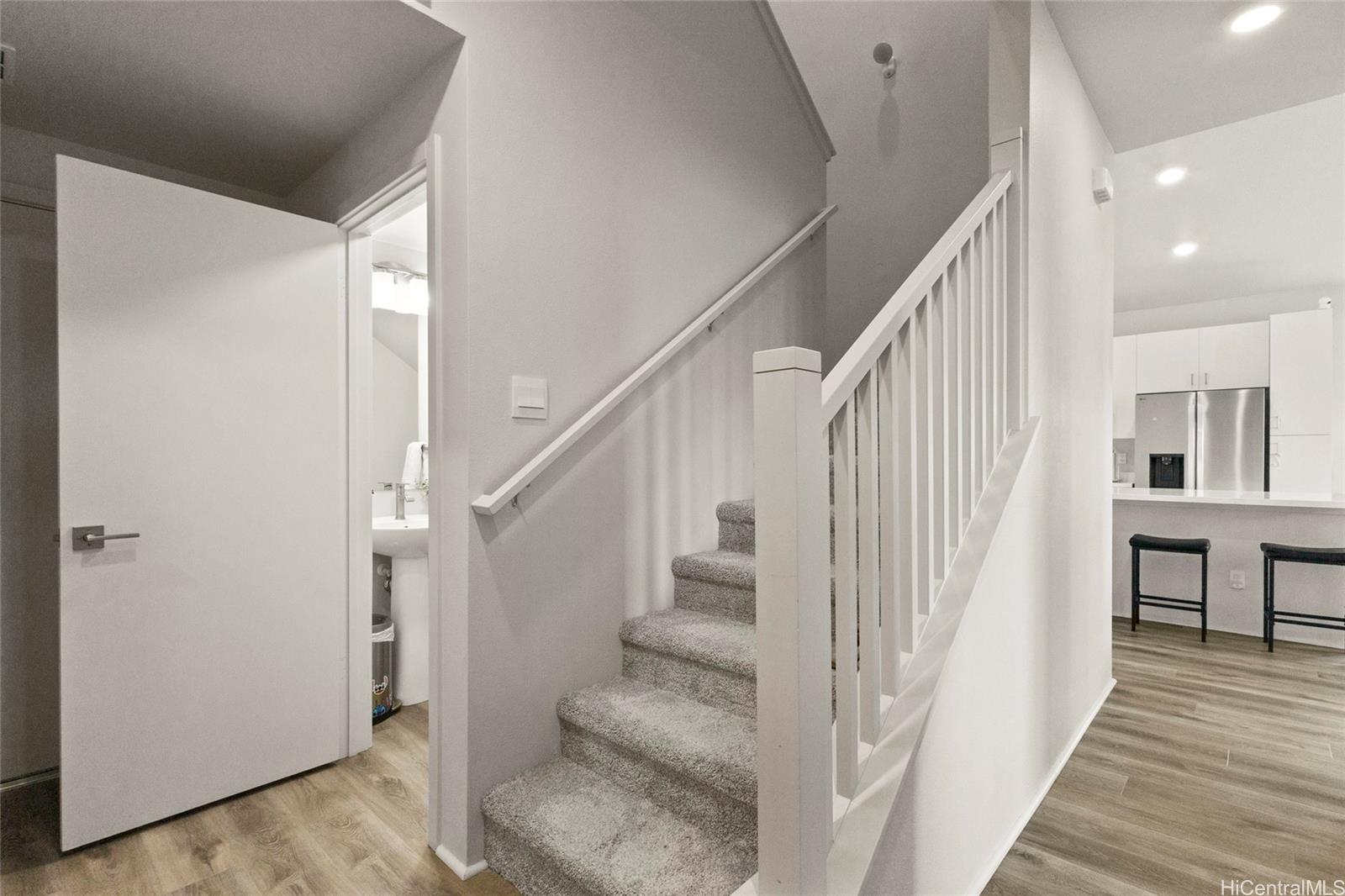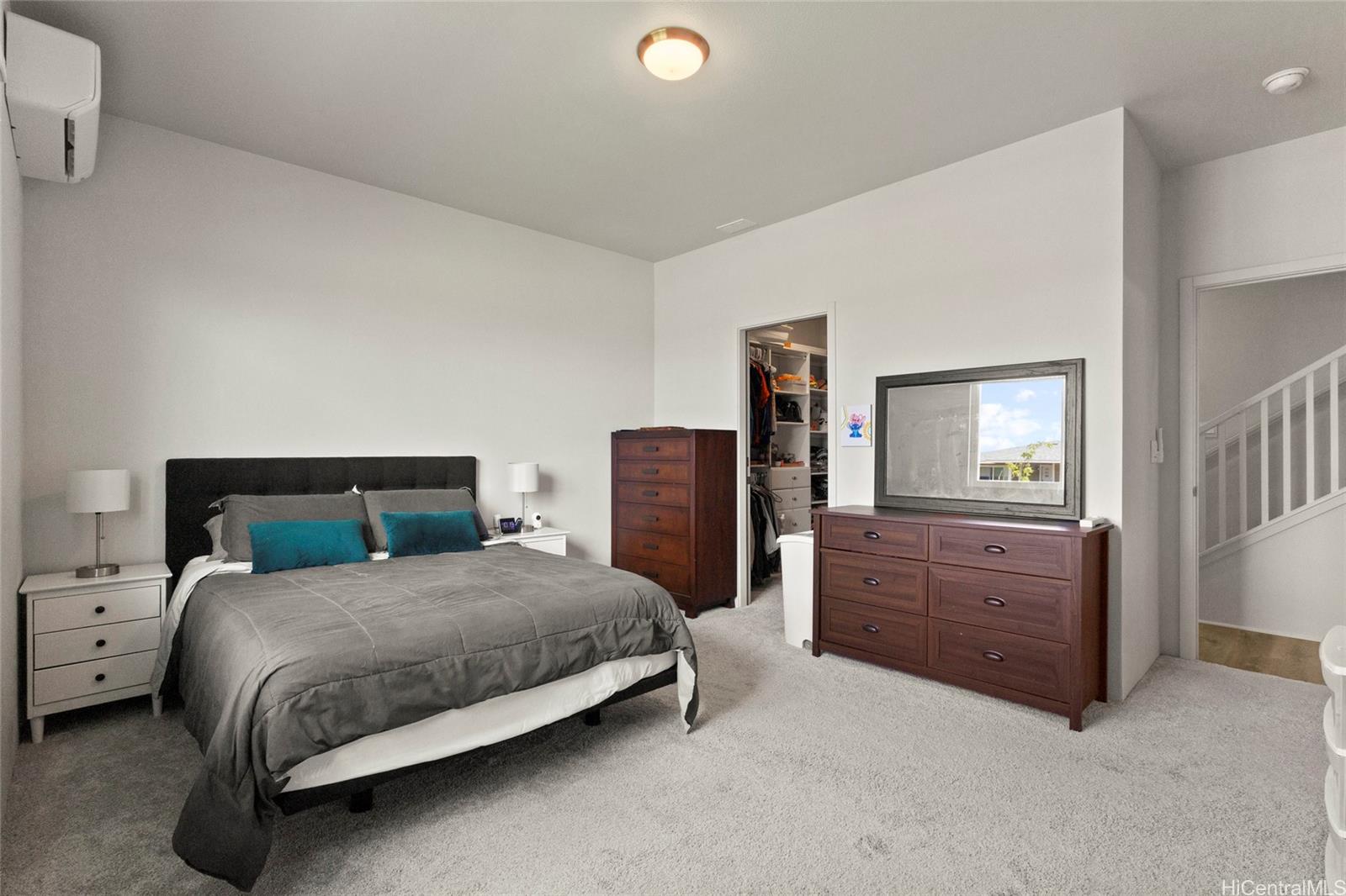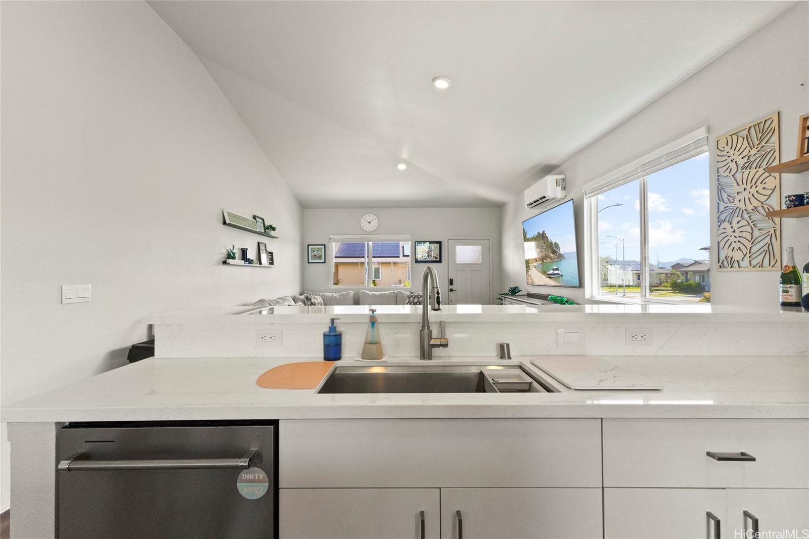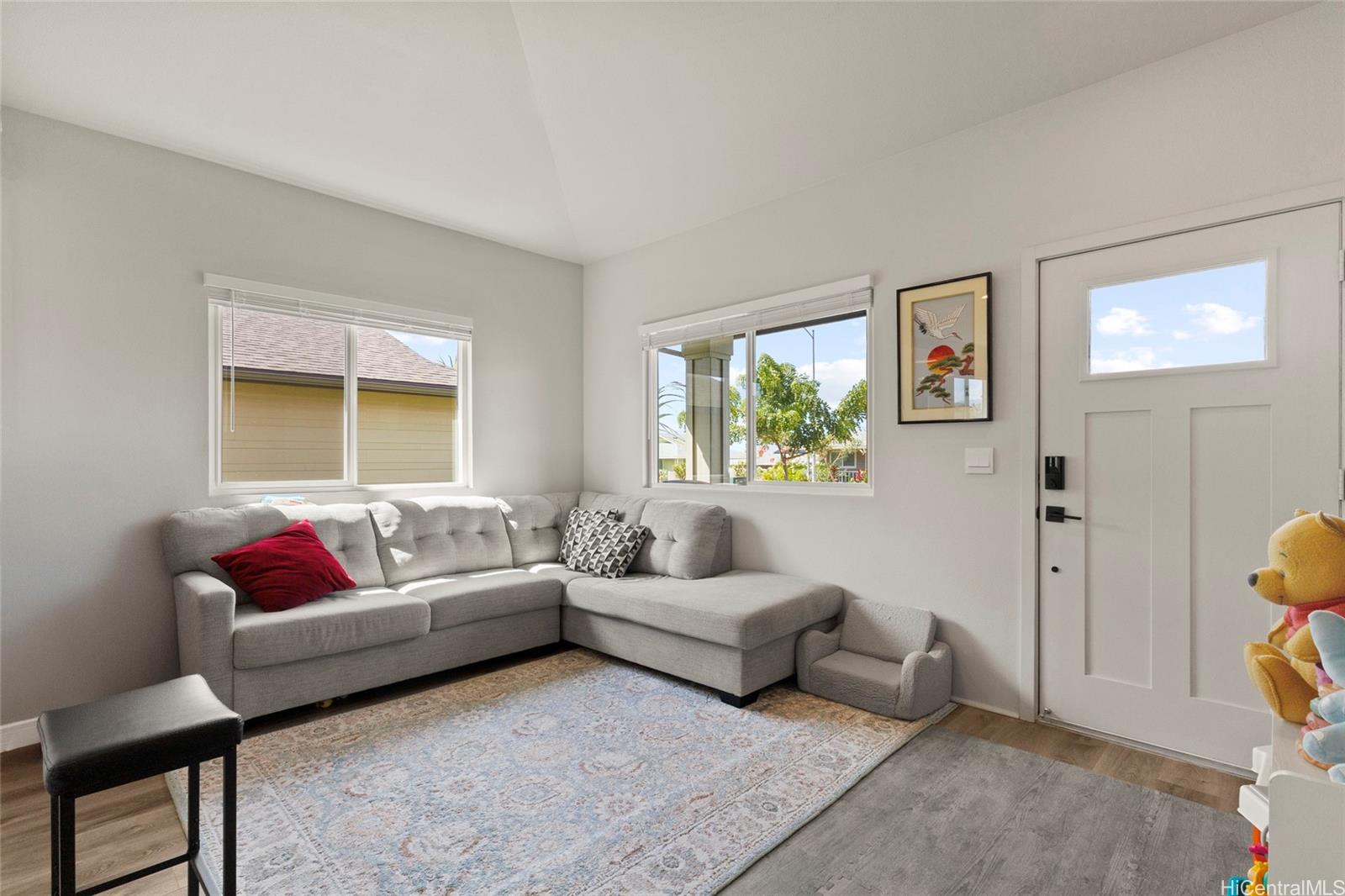 This stunning 4-bedroom, 2.5-bath single-family home offers modern comfort with timeless charm. The first-floor primary suite adds convenience, while soaring vaulted ceilings create an airy open-concept living space. A chef-inspired kitchen with quartz countertops, a large island, luxury vinyl plank flooring, and upgraded KitchenAid appliances make this home shine. Every bedroom includes split AC for year-round comfort, and thoughtful details like Solatube lighting, upstairs linen storage, and a dedicated laundry room elevate daily living. Step outside to your covered lanai, landscaped yard with irrigation, and Urban Garden. Complete with a 2-car garage, Smart Home system, solar water heater, and owned PV Panels. Listing by: eXp Realty (808) 589-9747