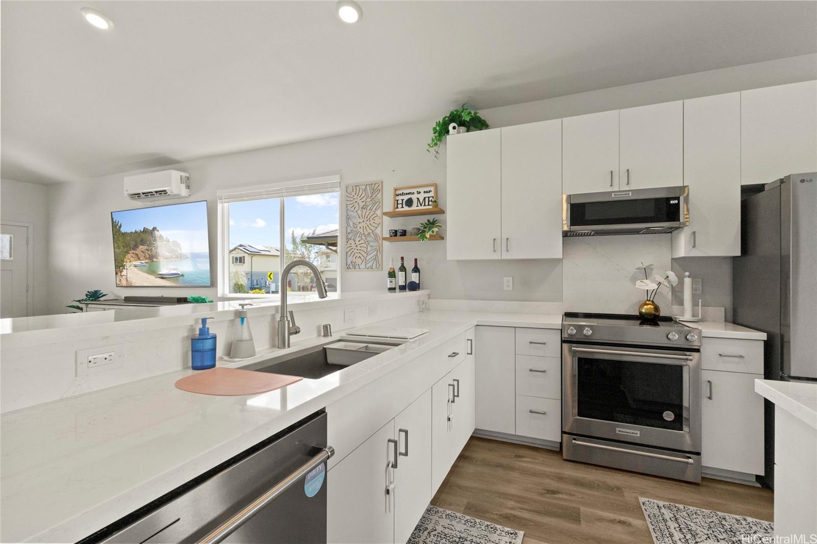 convenience, while soaring vaulted ceilings create an airy open-concept living space. A chef-inspired kitchen with quartz countertops, a large island, luxury vinyl plank flooring, and upgraded KitchenAid appliances make this home shine. Every bedroom includes split AC for year-round comfort, and thoughtful details like Solatube lighting, upstairs linen storage, and a dedicated laundry room elevate daily living. Step outside to your covered lanai, landscaped yard with irrigation, and Urban Garden. Complete with a 2-car garage, Smart Home system, solar water heater, and owned PV Panels.