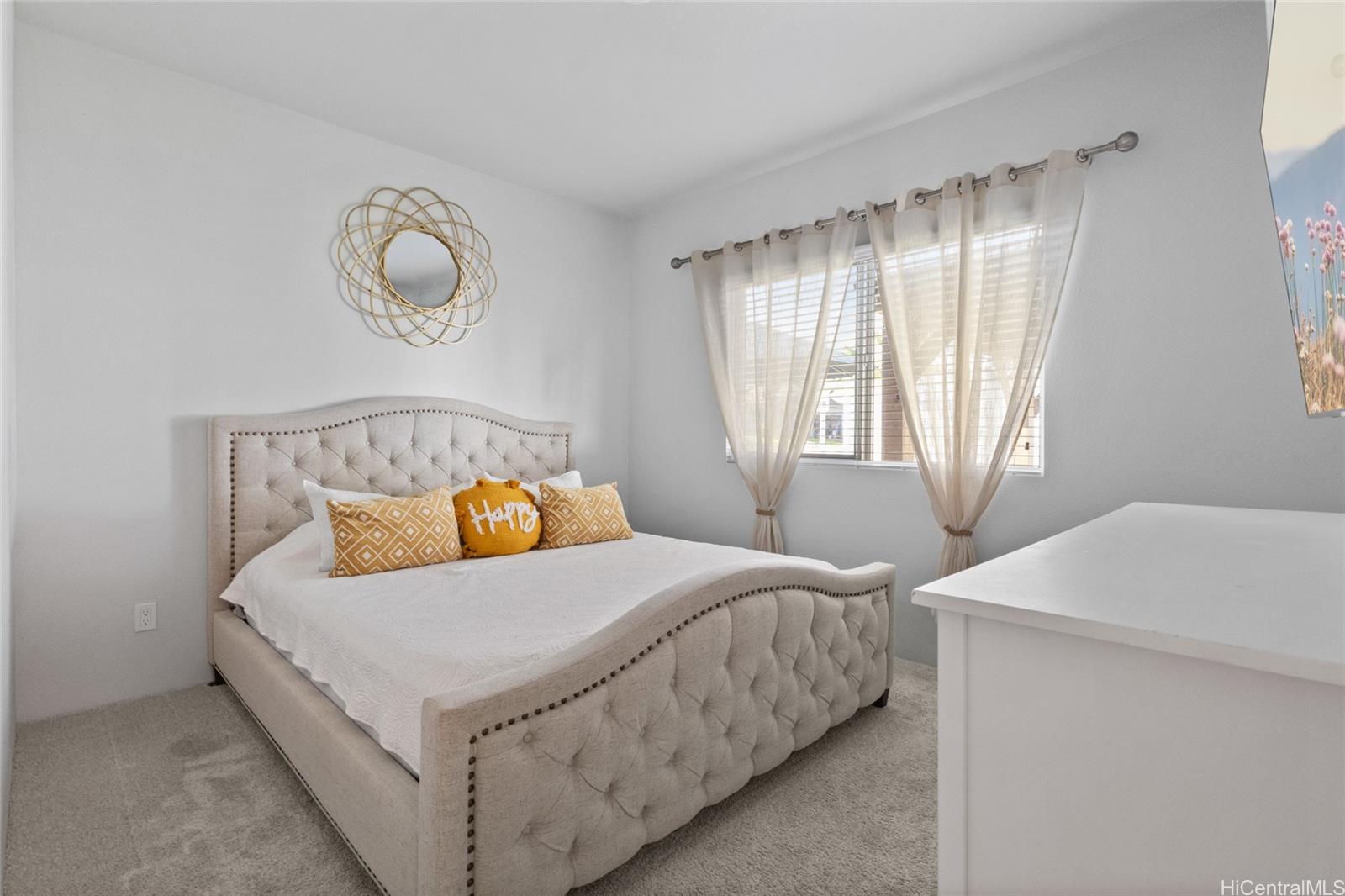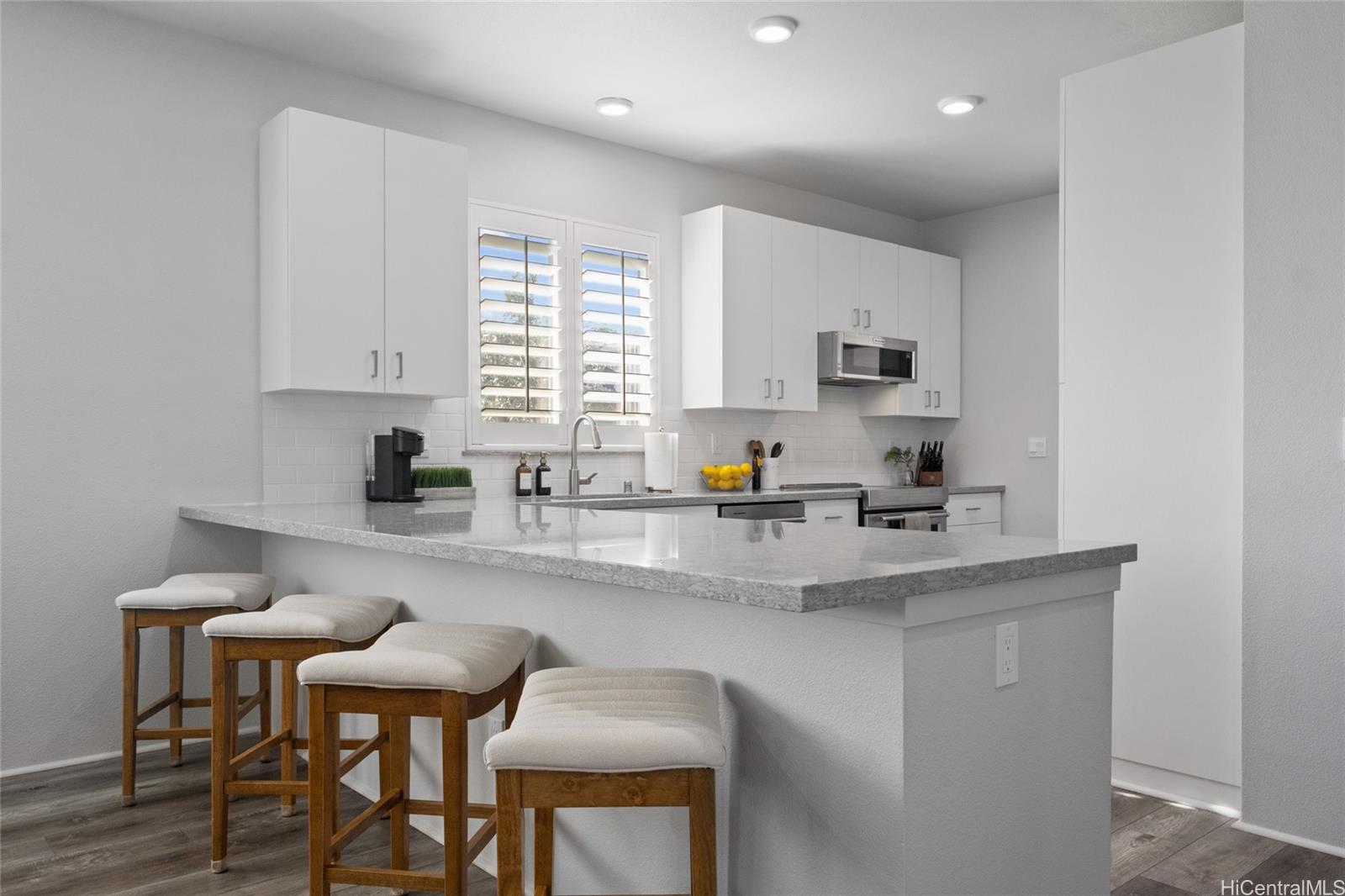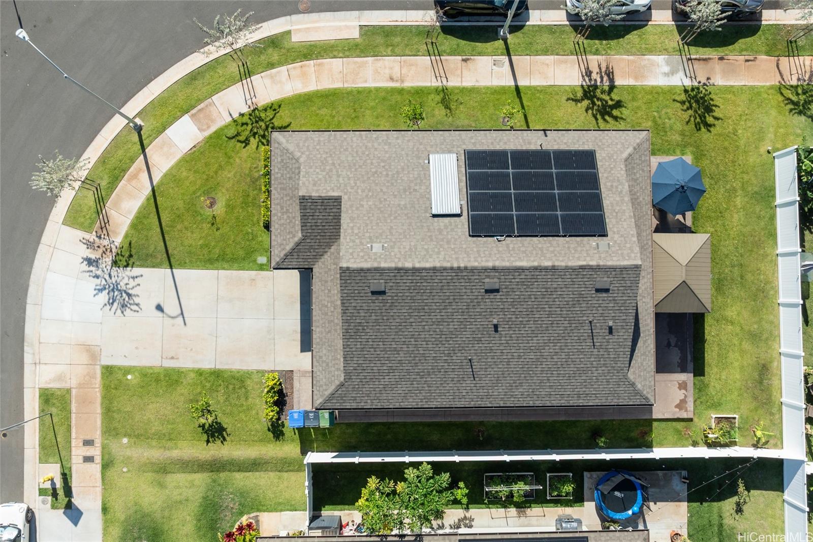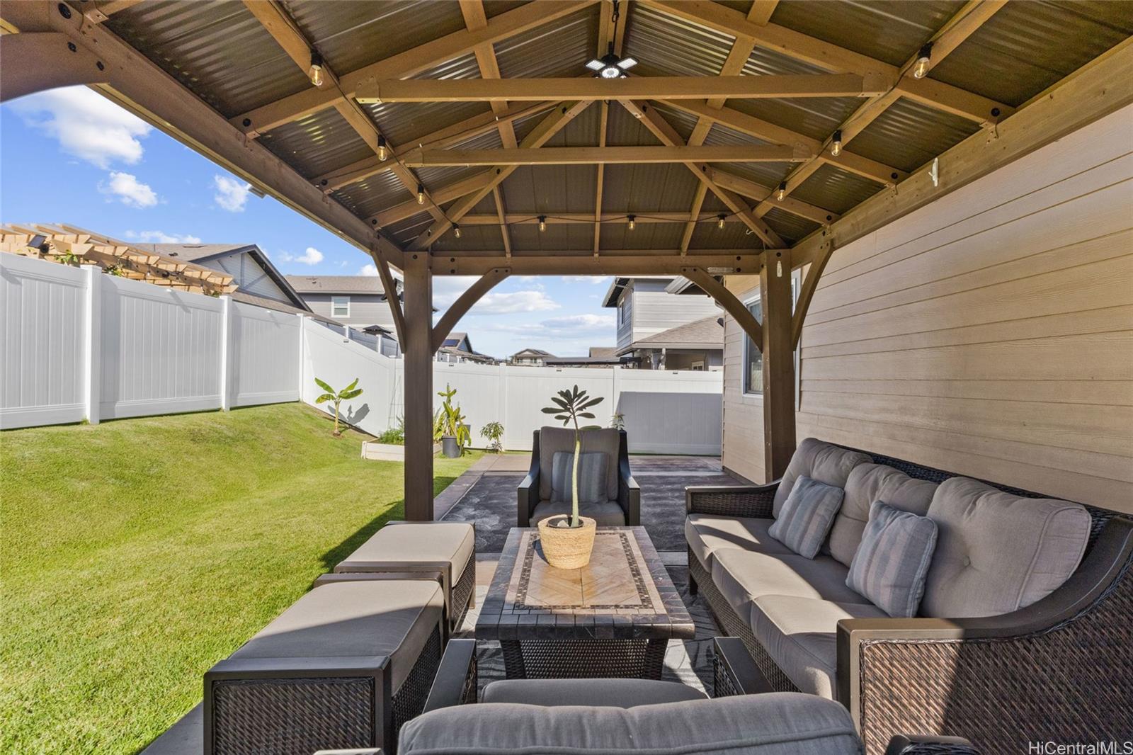 The epitome of luxury is found at this highly upgraded single family home residence that showcases true pride of ownership. Meticulously maintained and situated on a coveted spacious corner lot, the impeccably landscaped grounds and concrete slab additions create stunning curb appeal. Step inside to an open floor plan that features vinyl plank flooring in the main living area, plantation shutters throughout, split A/C units in every room, owned photovoltaic panels, and a modern kitchen with quartz counter tops, stainless steel appliances, and subway tile backsplash. You'll love entertaining on your outdoor patio deck complete with a gazebo, perfect for the ultimate cookout or family gathering. You can also enjoy your morning coffee or relaxing in the evening on your welcoming front porch and don't forget about your extended driveway that can accommodate multiple vehicles and two car garage. Plus, enjoy all of that Hoopili has to offer including multiple parks and playgrounds, community pool, recreational courts, and more. What more can you want? This home truly has it all! Listing by: Refined Real Estate Hawaii LLC (808) 220-8527