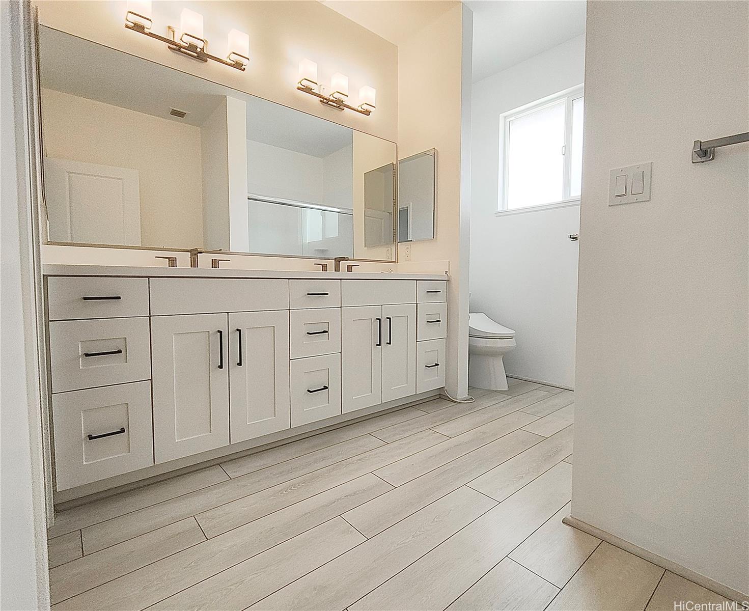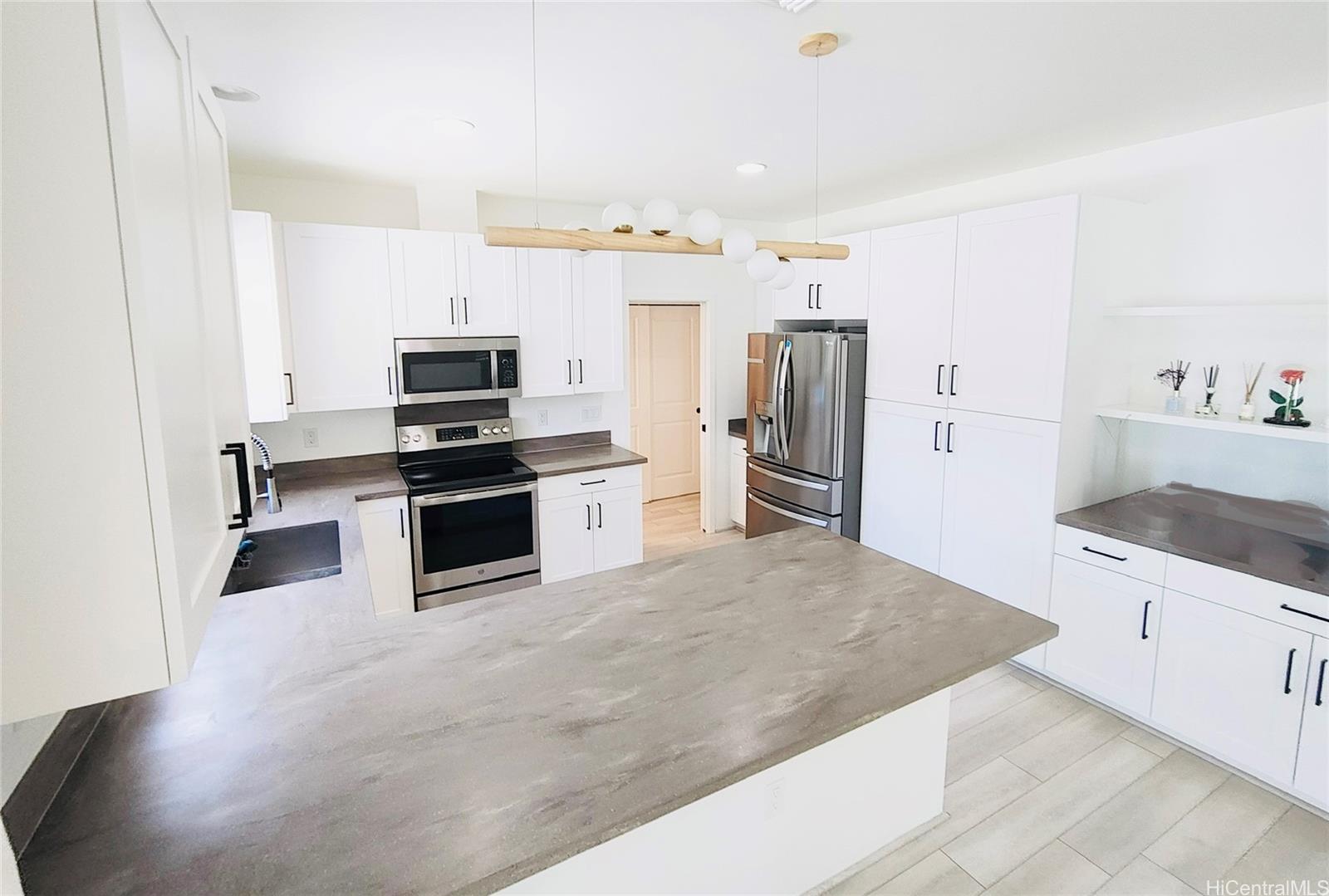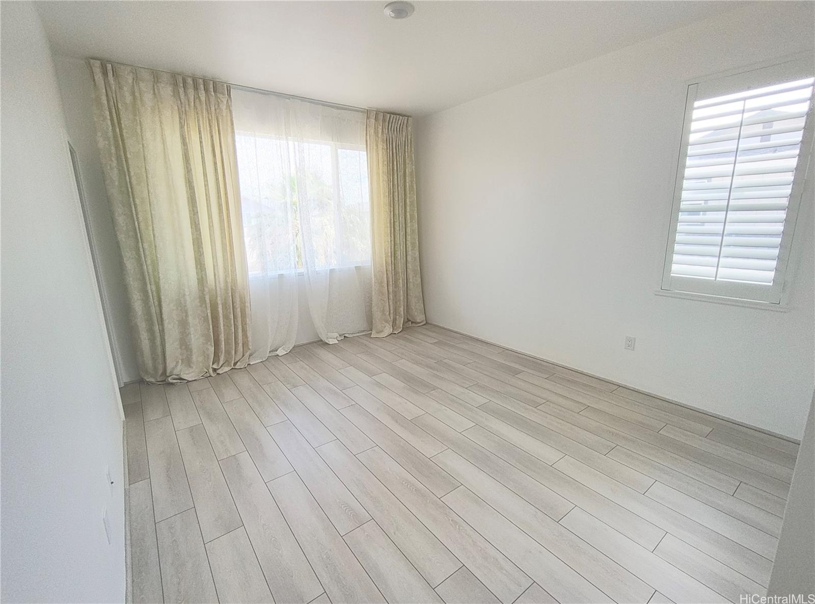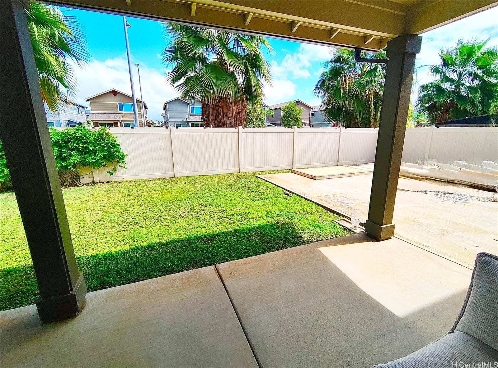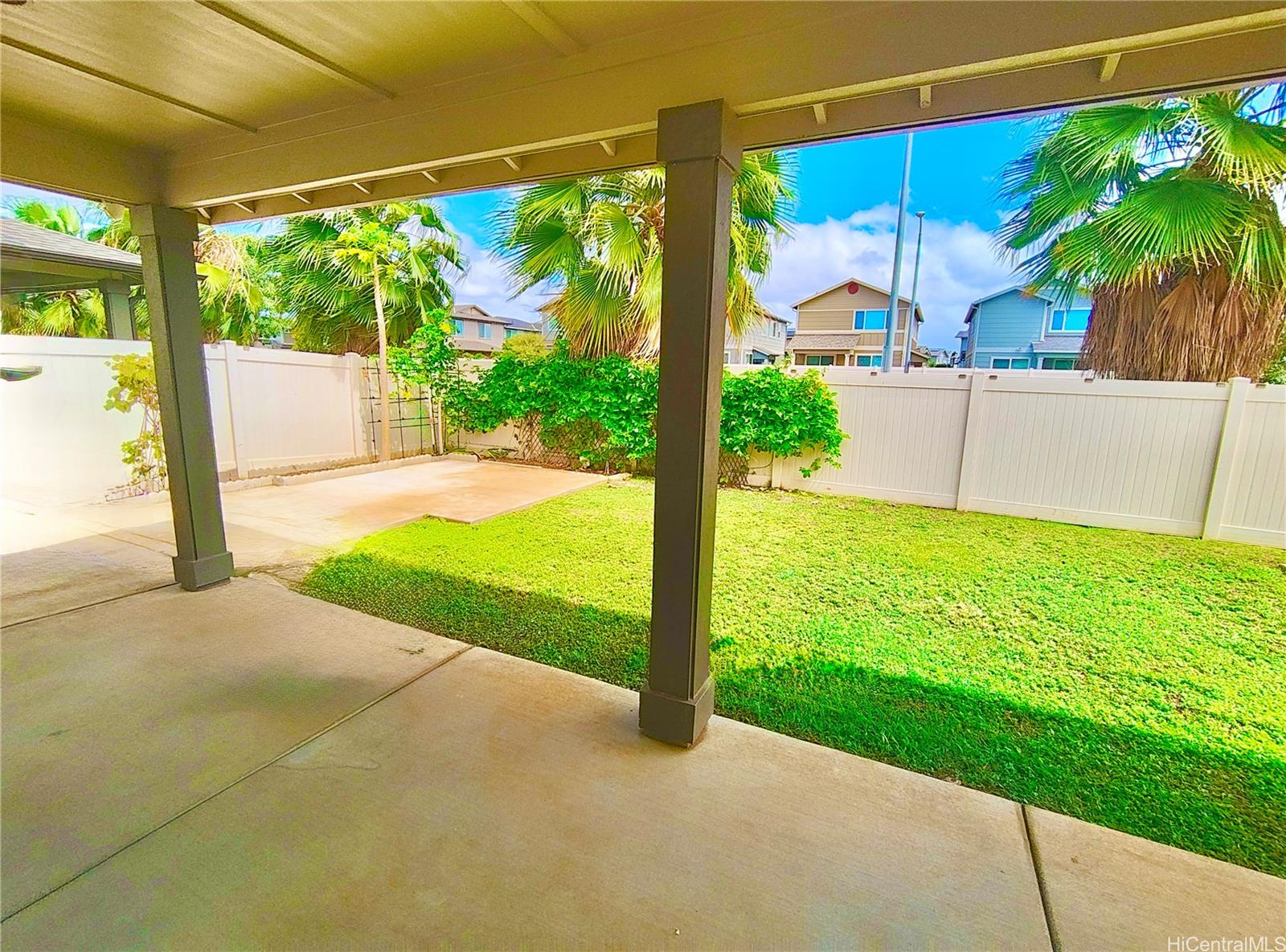 Welcome to Ewa by Gentry – Makamae, where pride of ownership and community spirit shine through every street. This beautiful home blends modern comfort with thoughtful design — featuring 9-foot ceilings, an open floor plan, and a kitchen centered around a large island that brings everyone together. Enjoy indoor-outdoor living with a covered lanai just off the living room and landscaped front and back yards perfect for relaxing or entertaining. The first-floor bedroom and full bath offer convenience for guests or multi-generational living, while the upstairs primary suite provides a peaceful retreat with a walk-in shower, Toto bidet, and organized closet system. Two additional bedrooms are bright, airy, and versatile. Energy-efficient upgrades include a 20 SEER central A/C system, solar water heater, dual-pane windows, and fiber-optic internet. A Halo water filtration system, Leased Photovoltaic system includes the following: (18) panels from Mission Solar Energy LLC, TXI6-370120BB Inverters 1 x SolarEdge Technologies SE6000H-USSN