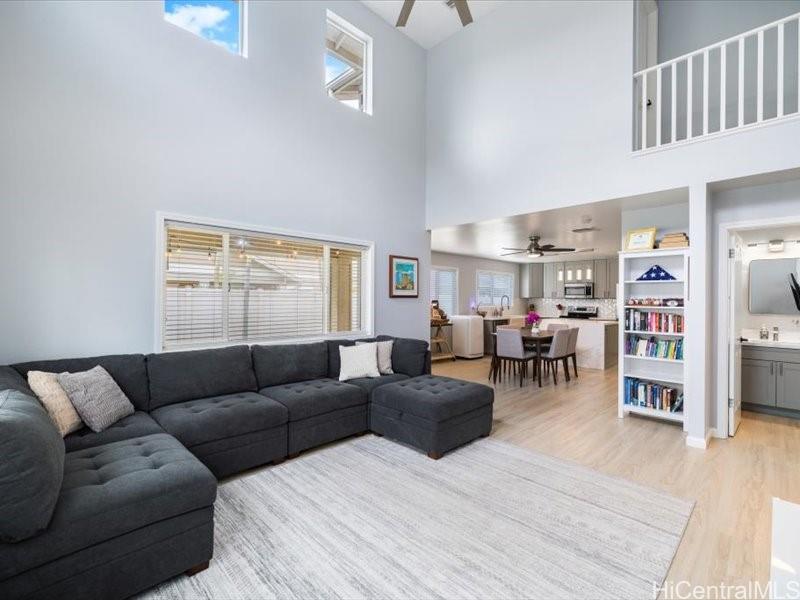 IMMACULATE TURNKEY HOME + VA ASSUMABLE LOAN AT 2.75% + OWNED PV SYSTEM + LOW MONTHLY FEES TO TOP IT ALL OFF!!!. Welcome to 91-307 Hoomalule Place-an elegantly renovated turn-key home where style meets comfort. Soaring high ceilings and abundant natural light create an open, airy feel, while new flooring throughout adds warmth and continuity. The chef’s kitchen is a showpiece, featuring a waterfall island, generous counter space including dedicated coffee bar and custom cabinetry—perfect for both everyday cooking and entertaining. Step outside to a spacious, covered lanai & beautifully maintained yard. A truly inviting space to relax, entertain, or simply enjoy the island breeze. Energy efficiency is built in with an owned PV system featuring 37 panels and 2 batteries, keeping electric bills low. The split AC in the garage adds versatility, making it ideal for a workshop, gym, or hobby space. Rare 2.75%, VA assumable loan @ $4,411 PITI—an incredible opportunity in today’s market. Pair that with the super low $50 HOA and $0 maintenance fees. As a bonus, this home has lots of little easter eggs hidden throughout; little touches that elevate the quality of this home to the next level. Listing by: Real Broker (855) 450-0442