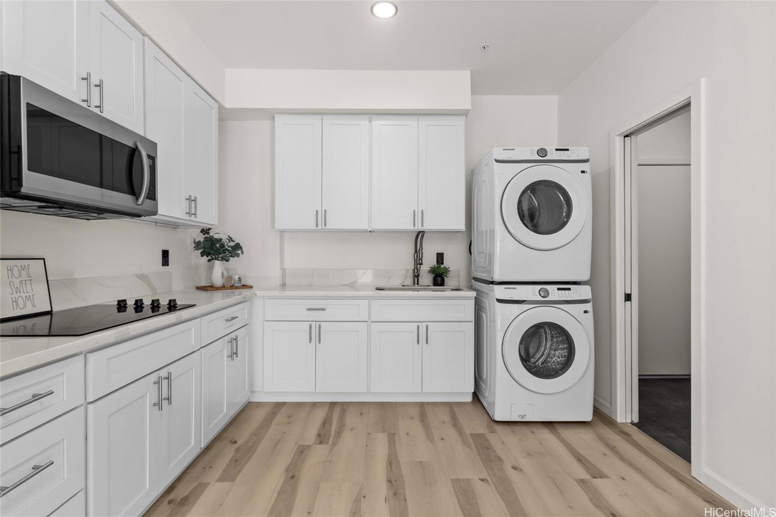 Welcome to Ho'opili & experience modern living in West Oahu’s most dynamic & fastest growing community. Discover this rarely available Kohina FLEX (Live-Work) townhome that boasts the largest 4/4 floor plan w/ an open-concept layout, high ceilings & large dual pane windows. This desirable corner-end unit is immaculate & move-in ready, featuring a well-equipped kitchen w/ island, drop zone, bookshelves & pantry. Sophisticated upgrades throughout showcasing LVP flooring, custom blinds, wall accents, lighting & fixtures. First floor offers 1 bedrm, 1 bath, full-size kitchenette, dedicated W/D & perfect for a home business, multi-gen living or rental opportunity. Prime location w/ spacious partitioned 2-car garage + extended driveway & close to guest stalls & loading zone. Live, work, & thrive at Ho‘opili w/ amenities at your doorstep & Festival Street + shops/business venues just around the corner. Enjoy rec center, pool, party venues, playgrounds & parks for sports, tots, & dogs. Near to Kapolei, Oahu's Second City, w/ an abundance of dining, shopping, entertainment, theaters, schools/universities, golf courses & more + easy access to freeway & rail. FIRST OPEN, 10/26, 2-5PM. Listing by: Coldwell Banker Realty (808) 351-4194