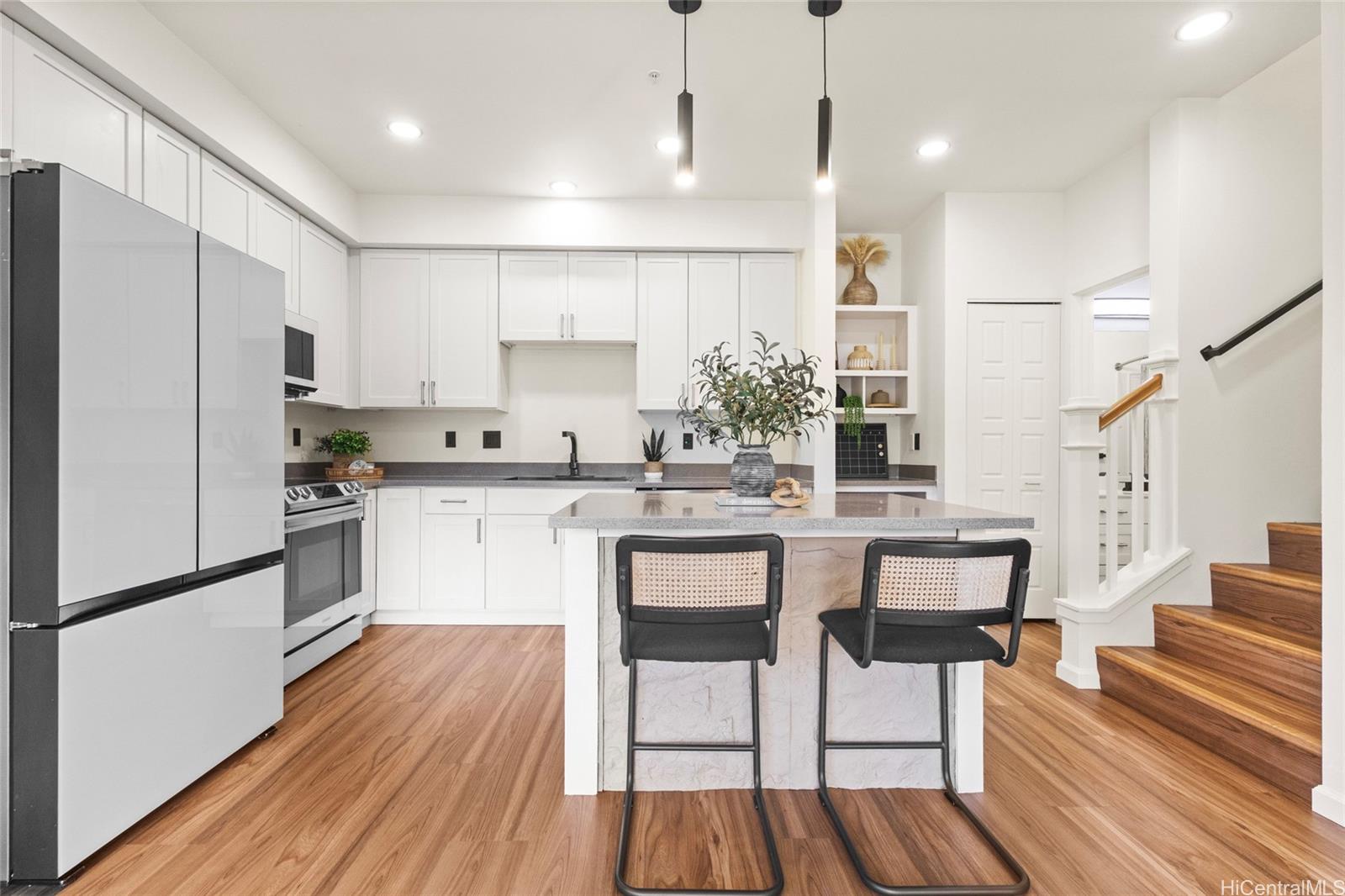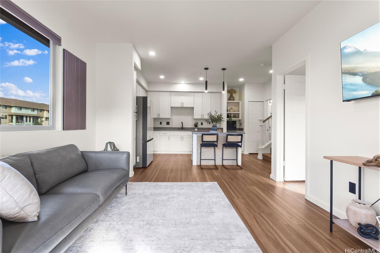 string(1197) "Welcome to Ho'opili & experience modern living in West Oahu’s most dynamic & fastest growing community. Discover this rarely available Kohina FLEX (Live-Work) townhome that boasts the largest 4/4 floor plan w/ an open-concept layout, high ceilings & large dual pane windows. This desirable corner-end unit is immaculate & move-in ready, featuring a well-equipped kitchen w/ island, drop zone, bookshelves & pantry. Sophisticated upgrades throughout showcasing LVP flooring, custom blinds, wall accents, lighting & fixtures. First floor offers 1 bedrm, 1 bath, full-size kitchenette, dedicated W/D & perfect for a home business, multi-gen living or rental opportunity. Prime location w/ spacious partitioned 2-car garage + extended driveway & close to guest stalls & loading zone. Live, work, & thrive at Ho‘opili w/ amenities at your doorstep & Festival Street + shops/business venues just around the corner. Enjoy rec center, pool, party venues, playgrounds & parks for sports, tots, & dogs. Near to Kapolei, Oahu's Second City, w/ an abundance of dining, shopping, entertainment, theaters, schools/universities, golf courses & more + easy access to freeway & rail. FIRST OPEN, 10/26, 2-5PM."