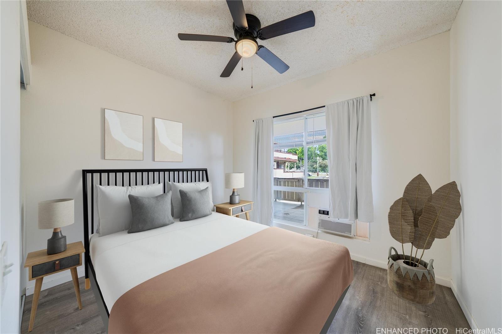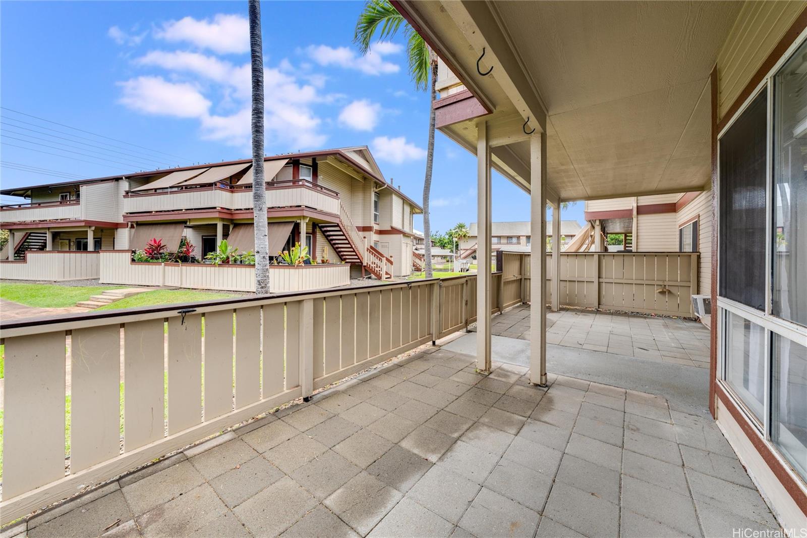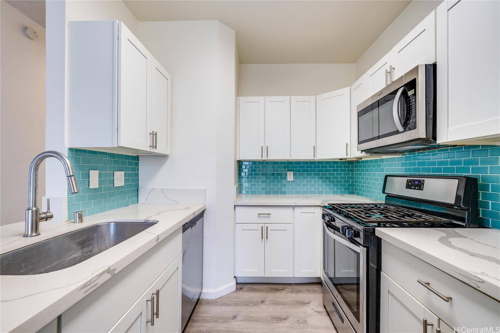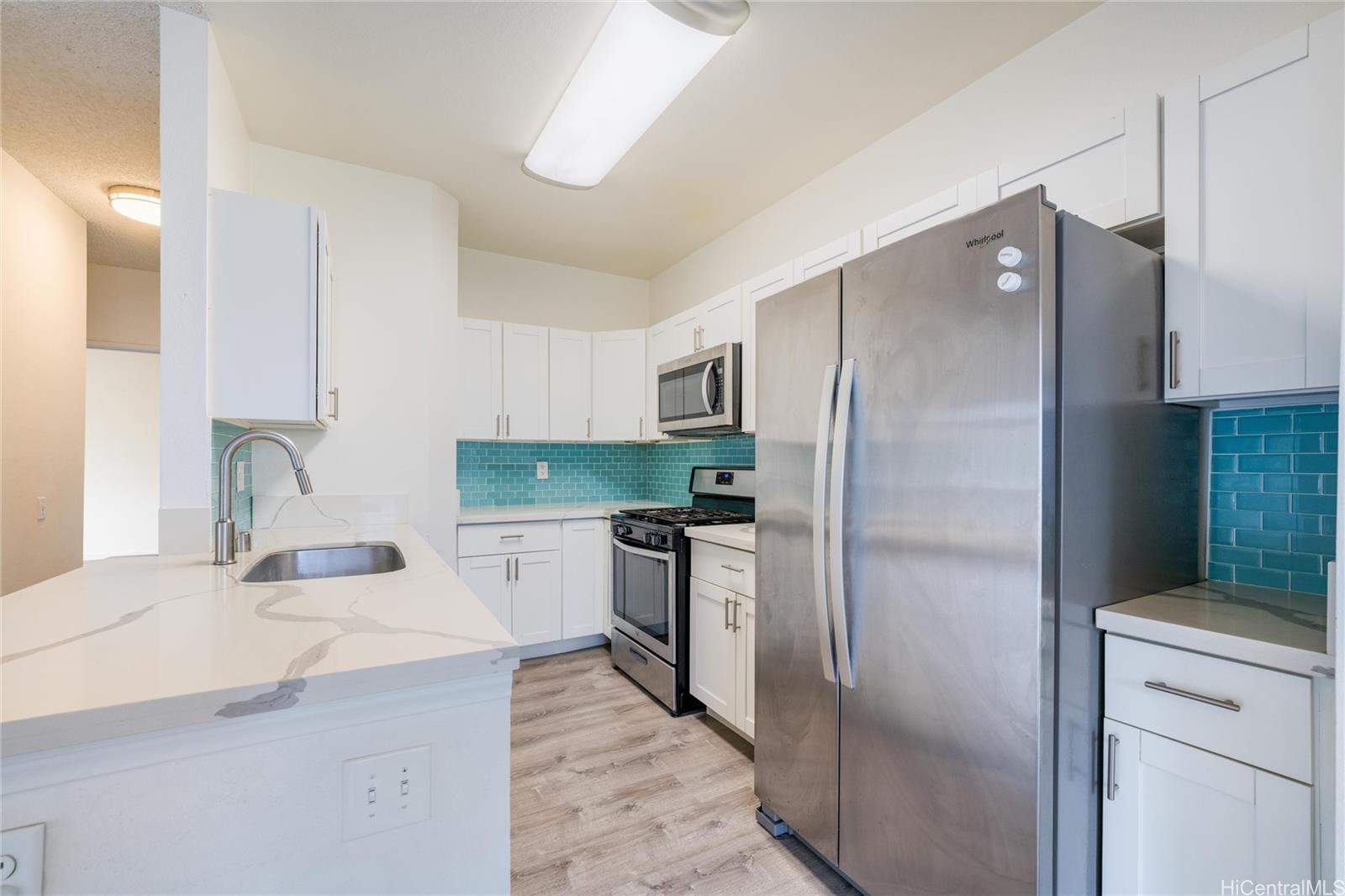 OPTION FOR 2.75% VA ASSUMPTION to qualified buyers! This desirable ground-level unit in the gated Palm Court community is a must-see. Enjoy a spacious, shaded, paved front lanai—perfect for relaxing or entertaining. Inside, the open-concept layout seamlessly connects the kitchen, dining, and living areas. The kitchen features stainless steel appliances and quartz countertops, offering both style and functionality. Palm Court residents enjoy resort-style amenities including a swimming pool, cabanas, and BBQ areas, all within a secure, well-maintained community. Listing by: Hawaii Pacific Realty Group (201) 704-2680