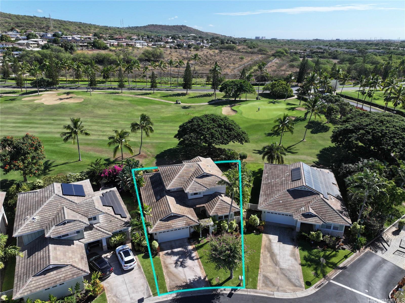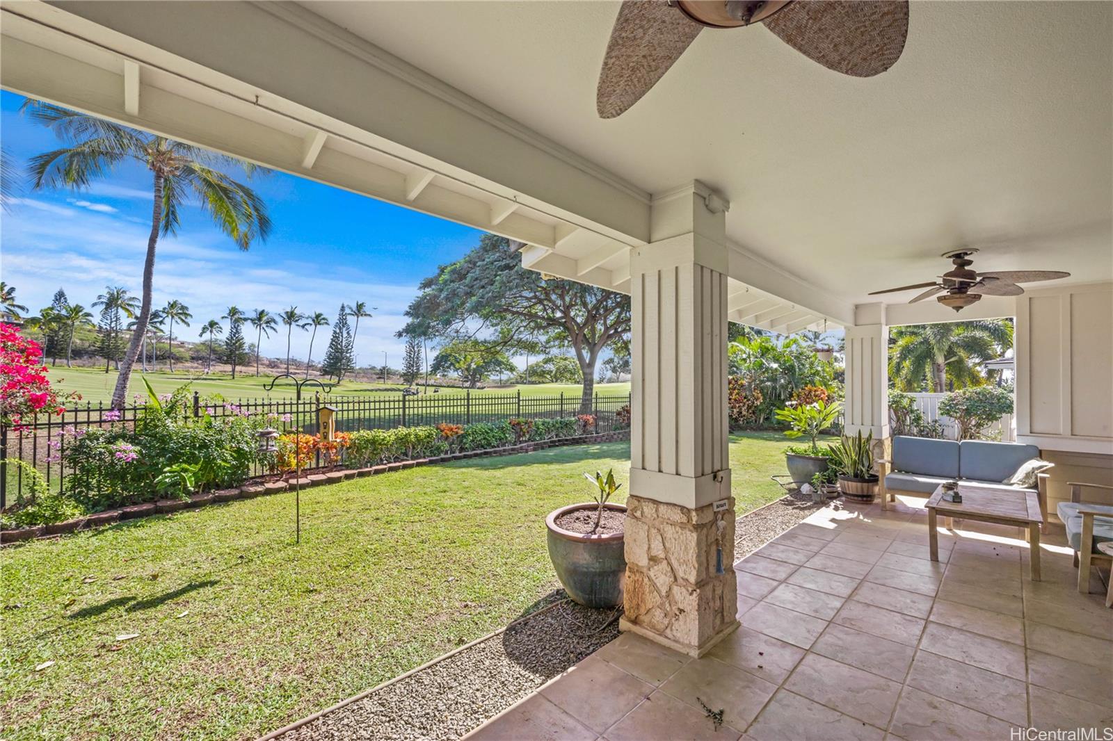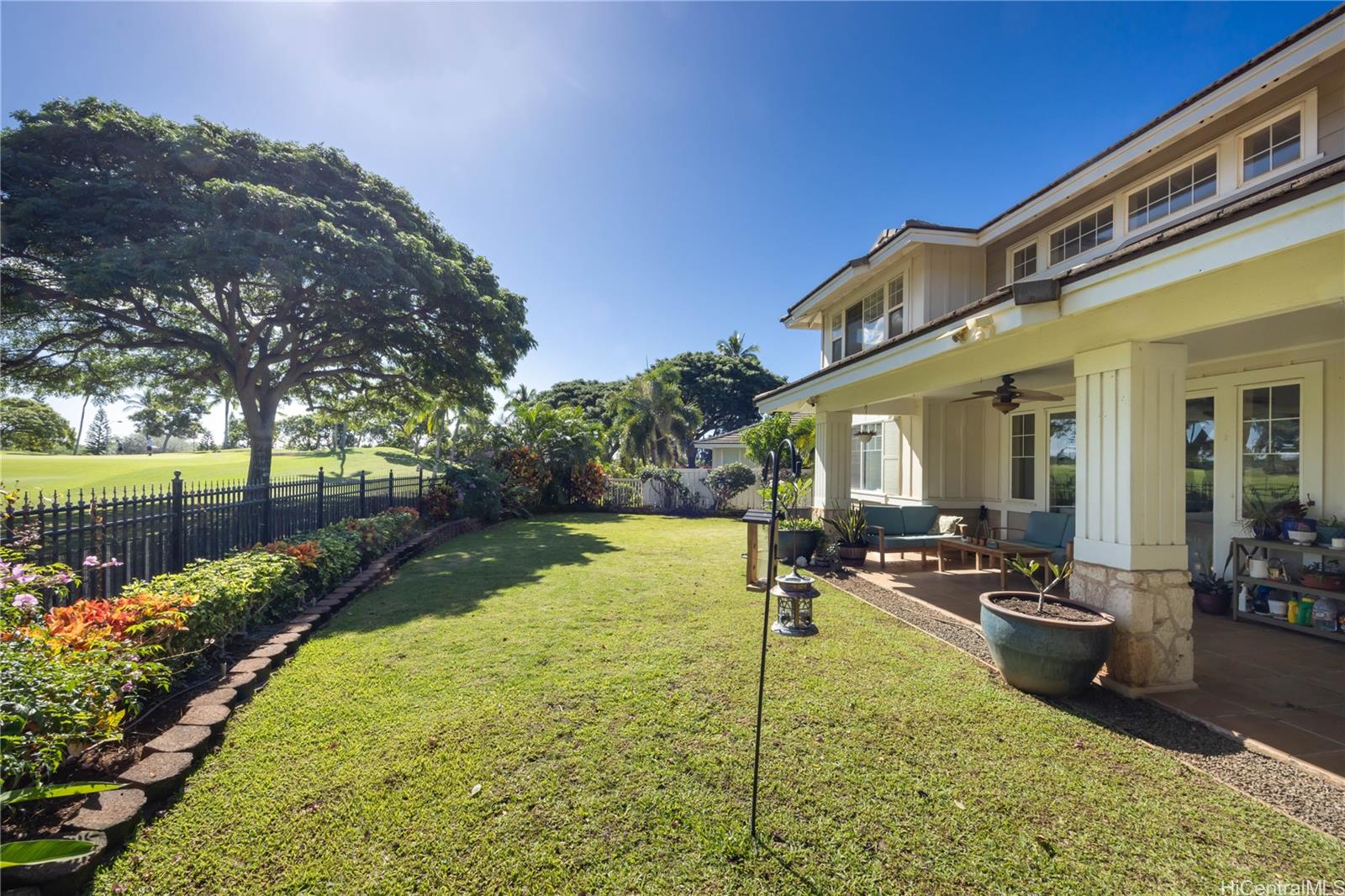 Resort style living at its best with golf course views on the 15th green! The expansive backyard is a tropical paradise completely fenced in for your pets or small children. Custom designer upgrades with acacia wood floors, plantation shutters, crown molding and tiled lanai. Spacious private primary suite on the 2nd floor. The first floor den w/separate entry can be used as a gym, office, or converted into a 4th bedroom. Stainless steel appliances in the kitchen. Living room has vaulted ceilings and windows with lots of natural light. Entertain on your spacious lanai or enjoy a morning sunrise. Drive your golf cart to any of the four lagoons, Aulani Resort and Four Seasons Resort. Perfect as a vacation home or investment! Access to Ko Olina Beach & Sports Club which includes a fitness gym, tennis courts, fitness classes, and much more! Listing by: Berkshire Hathaway HmSvc HI RE (808) 763-9727