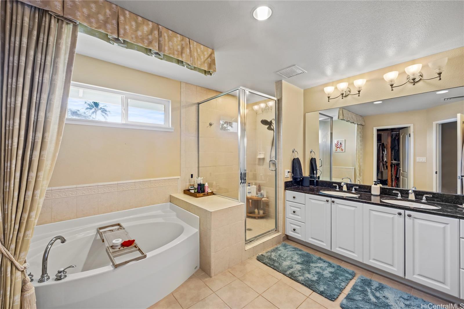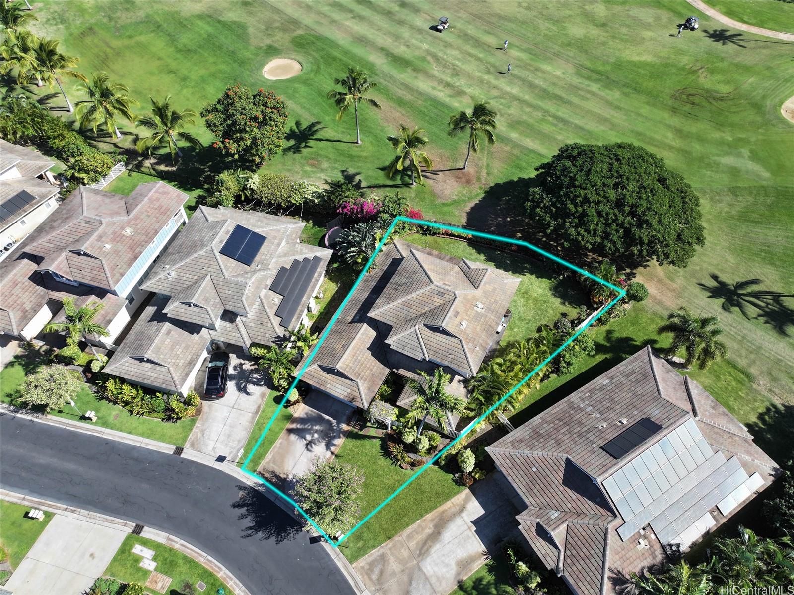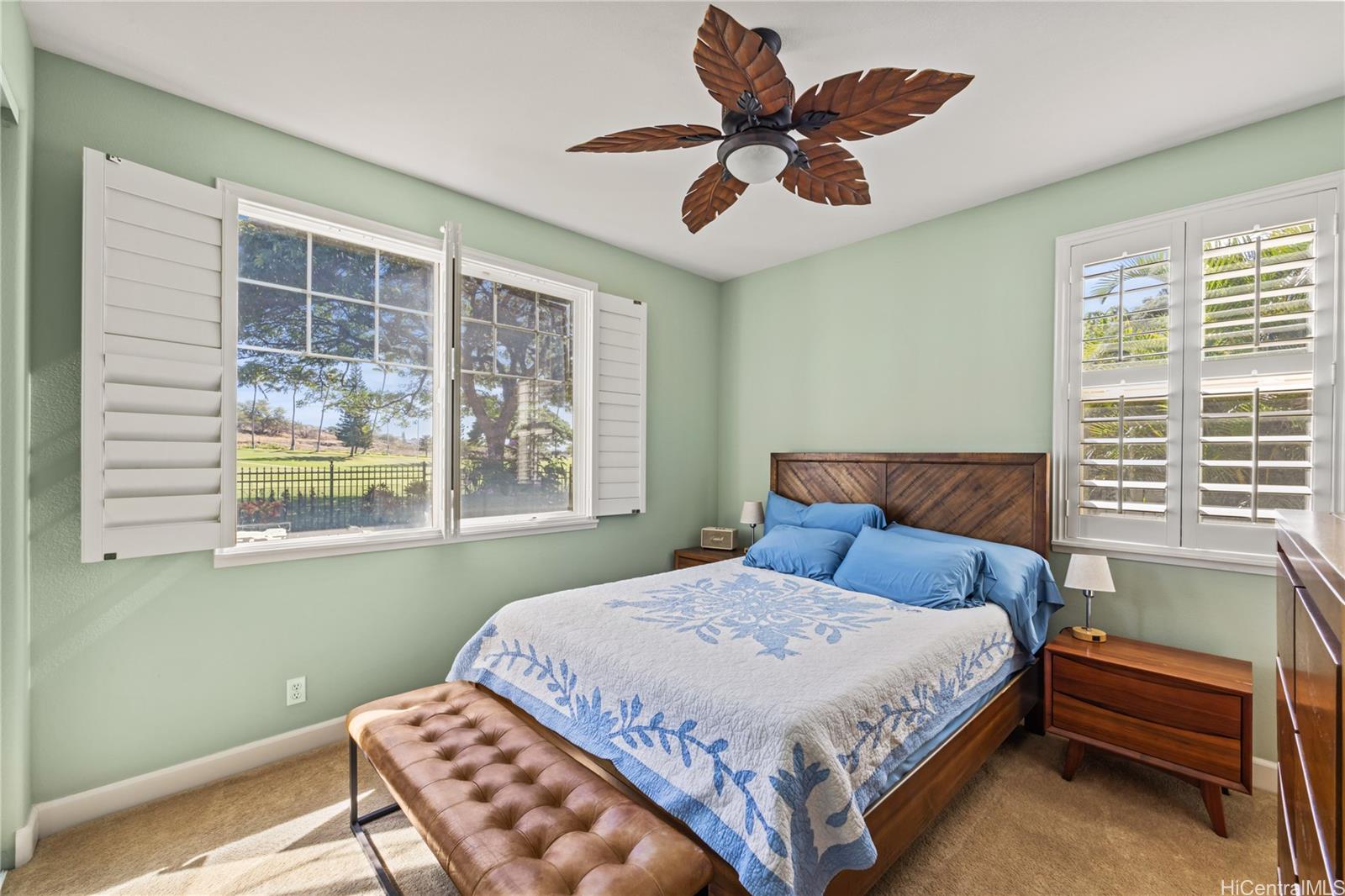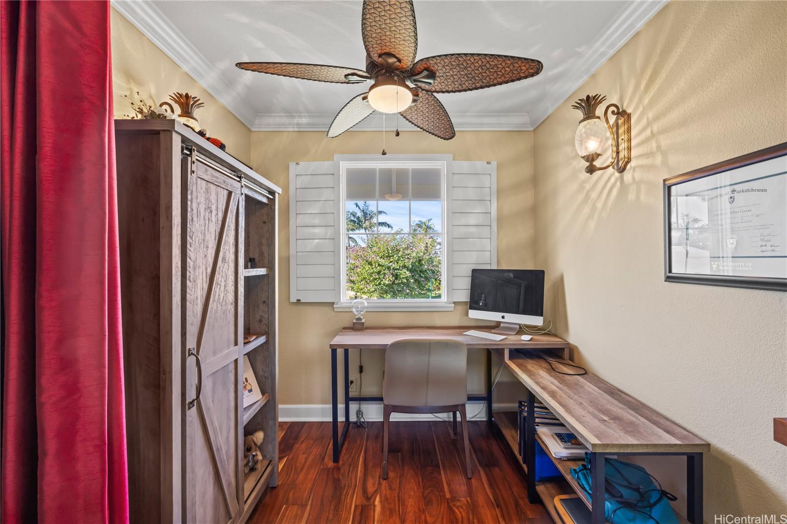 Resort style living at its best with golf course views on the 15th green! The expansive backyard is a tropical paradise completely fenced in for your pets or small children. Custom designer upgrades with acacia wood floors, plantation shutters, crown molding and tiled lanai. Spacious private primary suite on the 2nd floor. The first floor den w/separate entry can be used as a gym, office, or converted into a 4th bedroom. Stainless steel appliances in the kitchen. Living room has vaulted ceilings and windows with lots of natural light. Entertain on your spacious lanai or enjoy a morning sunrise. Drive your golf cart to any of the four lagoons, Aulani Resort and Four Seasons Resort. Perfect as a vacation home or investment! Access to Ko Olina Beach & Sports Club which includes a fitness gym, tennis courts, fitness classes, and much more! Listing by: Berkshire Hathaway HmSvc HI RE (808) 763-9727