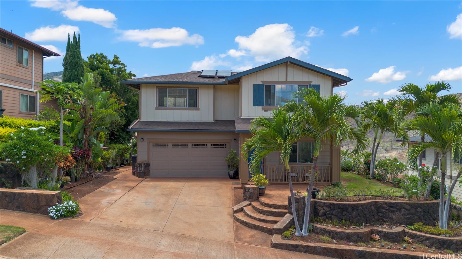string(1196) "Perched on a rarely available RIM LOT, this thoughtfully updated 4-bed, 3-bath home in Wai Kaloi at Makakilo offers breathtaking panoramic views of the Honolulu skyline, Diamond Head, and the ocean. Step inside to a bright, open living space filled with natural light and cool hillside breezes. The layout flows effortlessly into the dining area and modern kitchen, where a covered lanai invites you to unwind and take in the peaceful mountain views, especially lush and vibrant during the winter. The renovated interior blends comfort and style with vinyl plank flooring, fresh paint, recessed lighting, new ceiling fans, plush carpet and more. A 1st floor bedroom and full bath provide a flexible space for guests or a home office. Upstairs, generously sized bedrooms capture more of the stunning views, while the spacious primary suite provides a serene space to recharge. Out back, you'll find a variety of fruit trees, mature plants, an extra large storage space, and a blank canvas to create your dream outdoor oasis. With the Honouliuli Forest Reserve just beyond your backyard, you'll benefit from a sense of privacy with no rear neighbors. Come and experience all this home has to offer!"