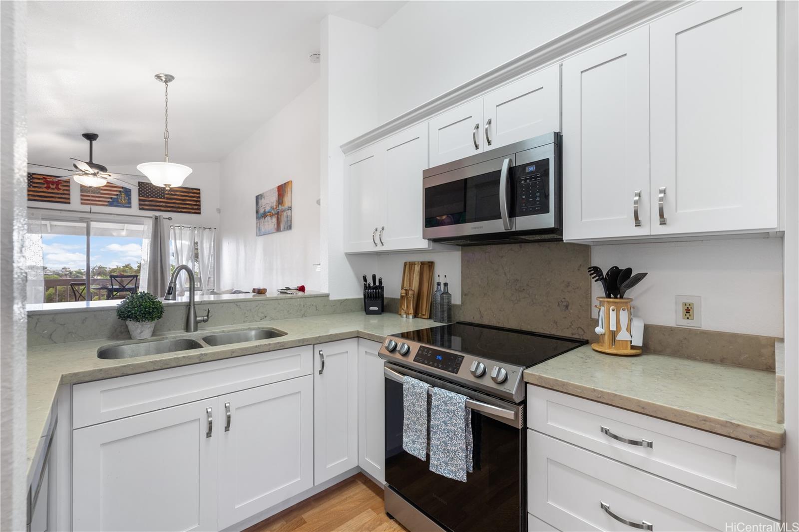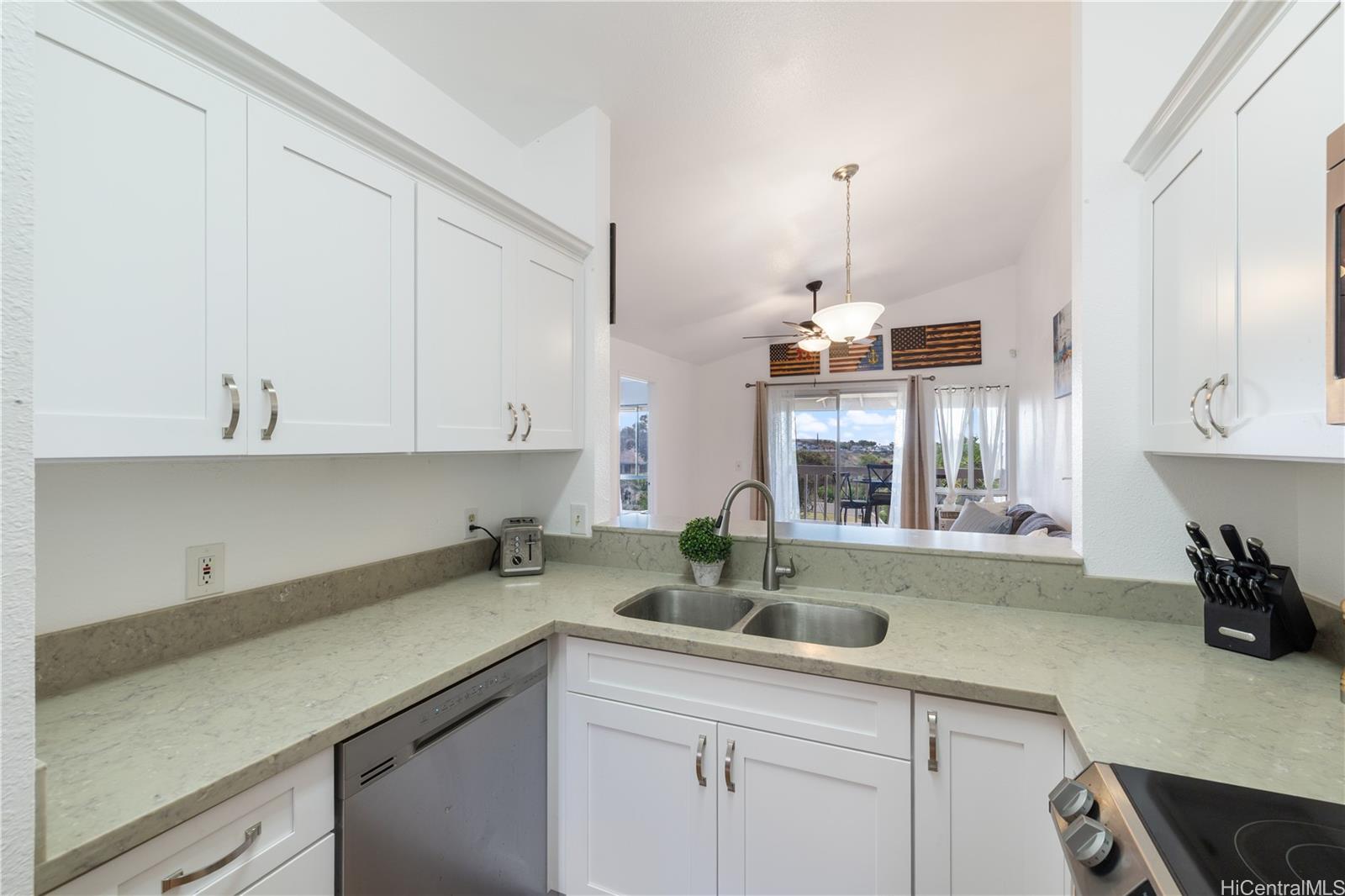 Move-in ready 2-bedroom, 2-bath townhouse with 2 parking stalls at Westview at Makakilo Heights! This well-maintained home features thoughtful upgrades throughout, including a fully renovated kitchen, upgraded primary bedroom windowpane, new lanai sliding door screen, two stylish ceiling fans, and a modern tankless water heater. Enjoy the comfort and privacy of a second-floor unit with a covered lanai offering open greenery views, abundant natural light, and partial ocean views. True move-in convenience without the need for major updates. Plus, the building is Pet-friendly! Conveniently located near schools, shopping, and H-1 freeway access.