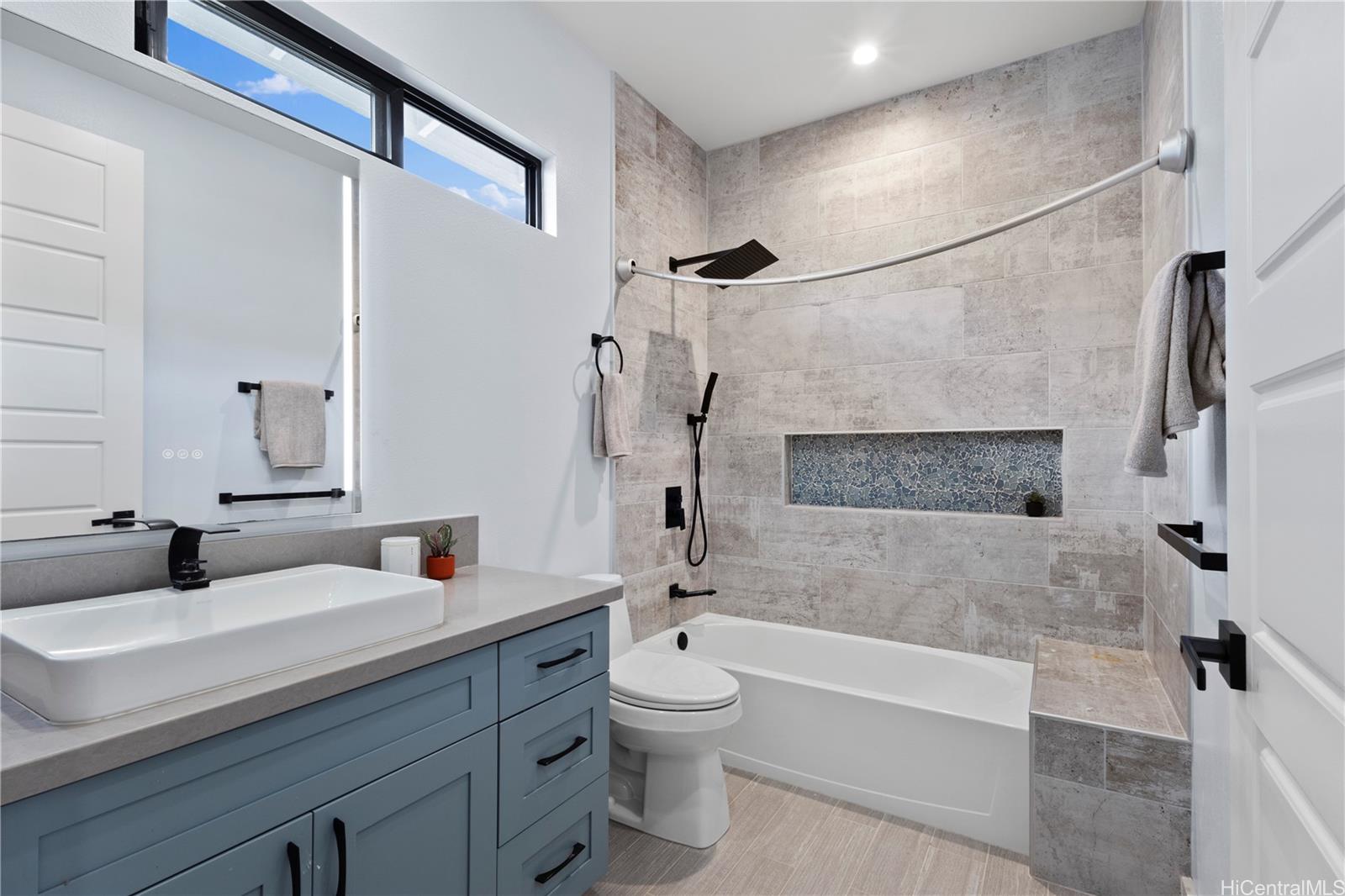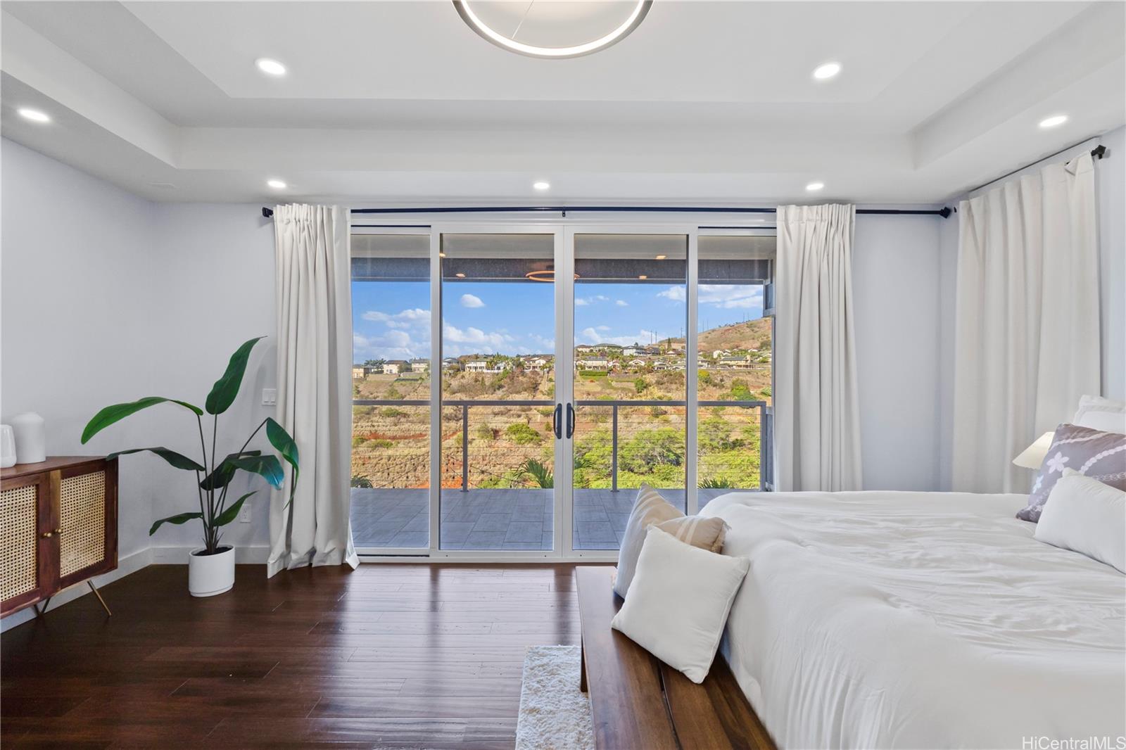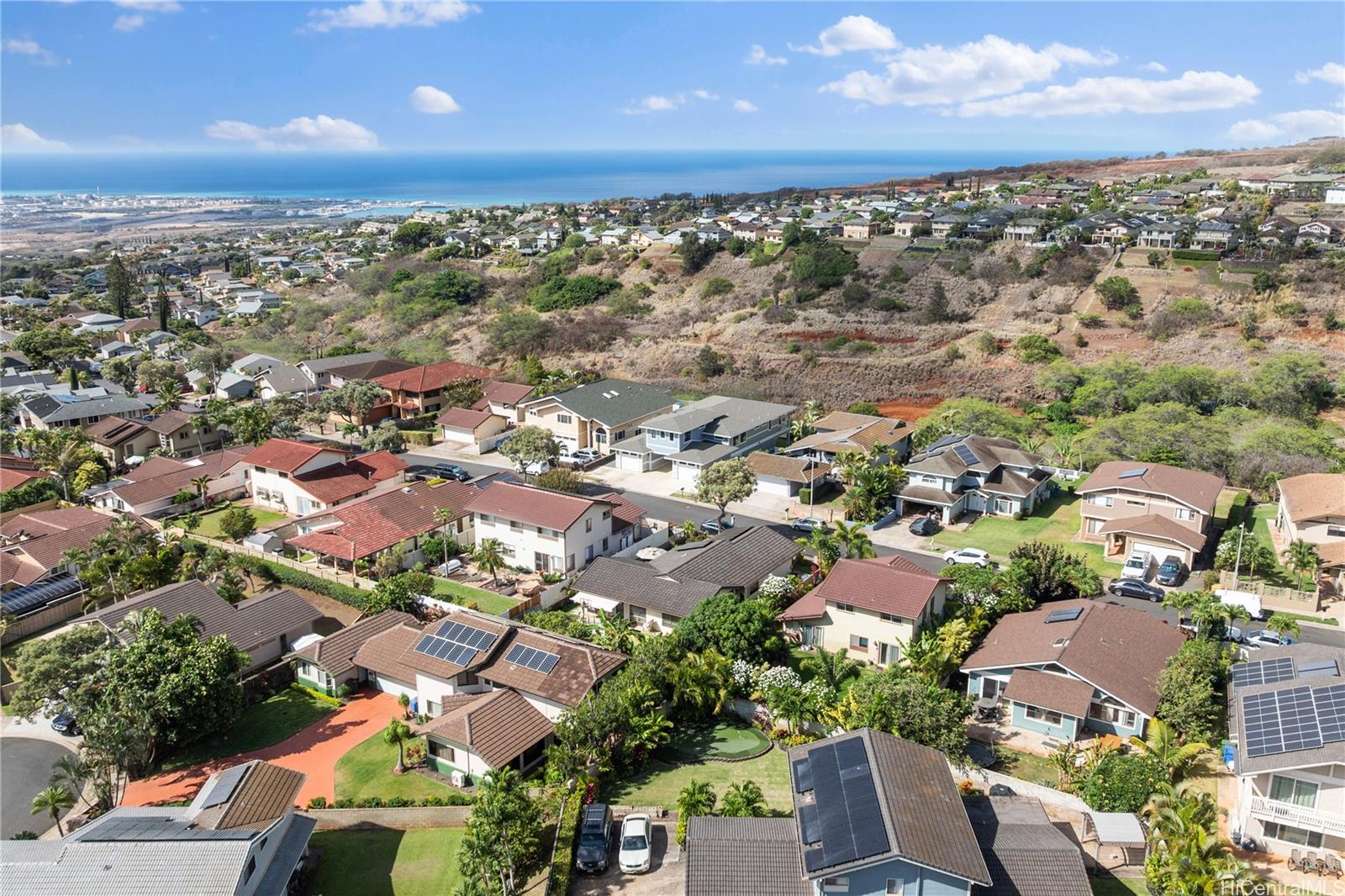 Beautifully built in 2022, this expansive 6BD/6BA Makakilo home sits on a rim lot capturing sweeping city, coastline, mountain, sunrise & sunset views with cool year-round breezes. Open-concept living, dining, and kitchen feature quartz countertops, forced induction range, tile flooring on main level, hardwood upstairs, and 9-ft ceilings throughout.