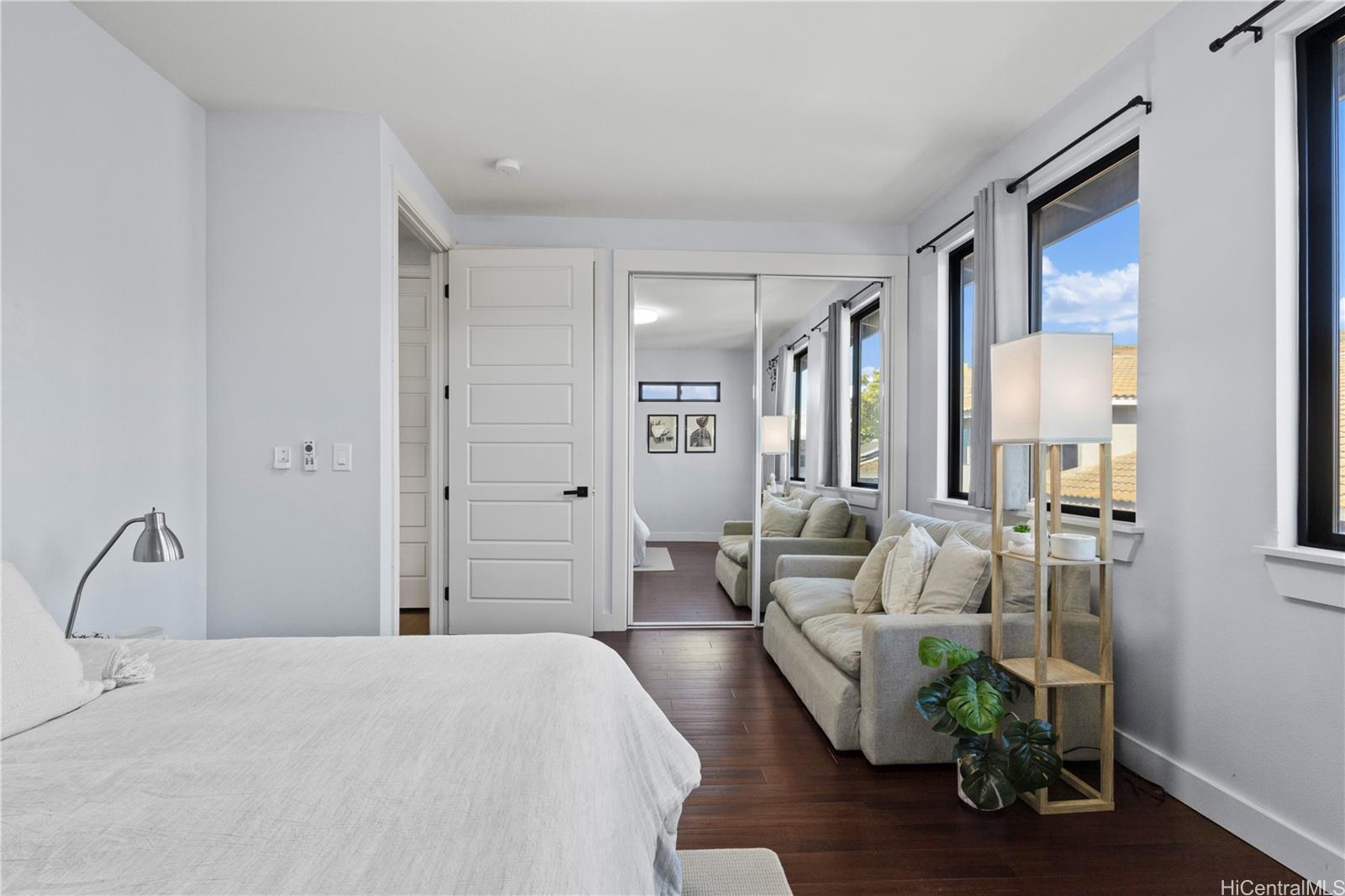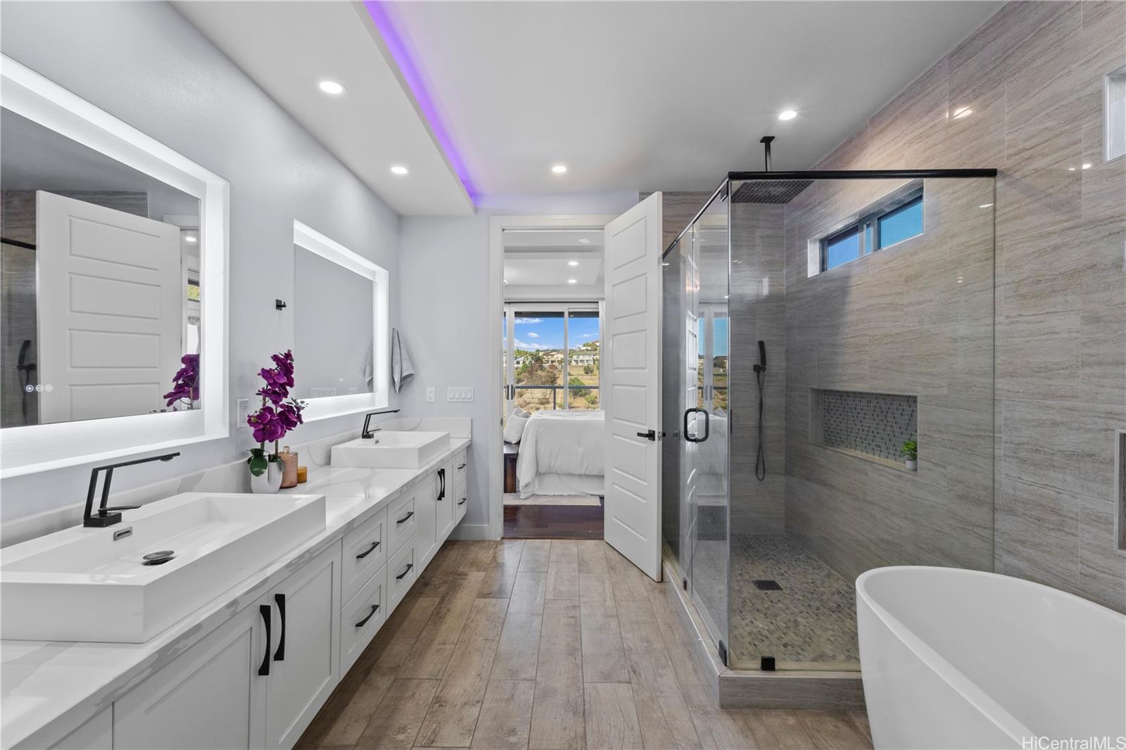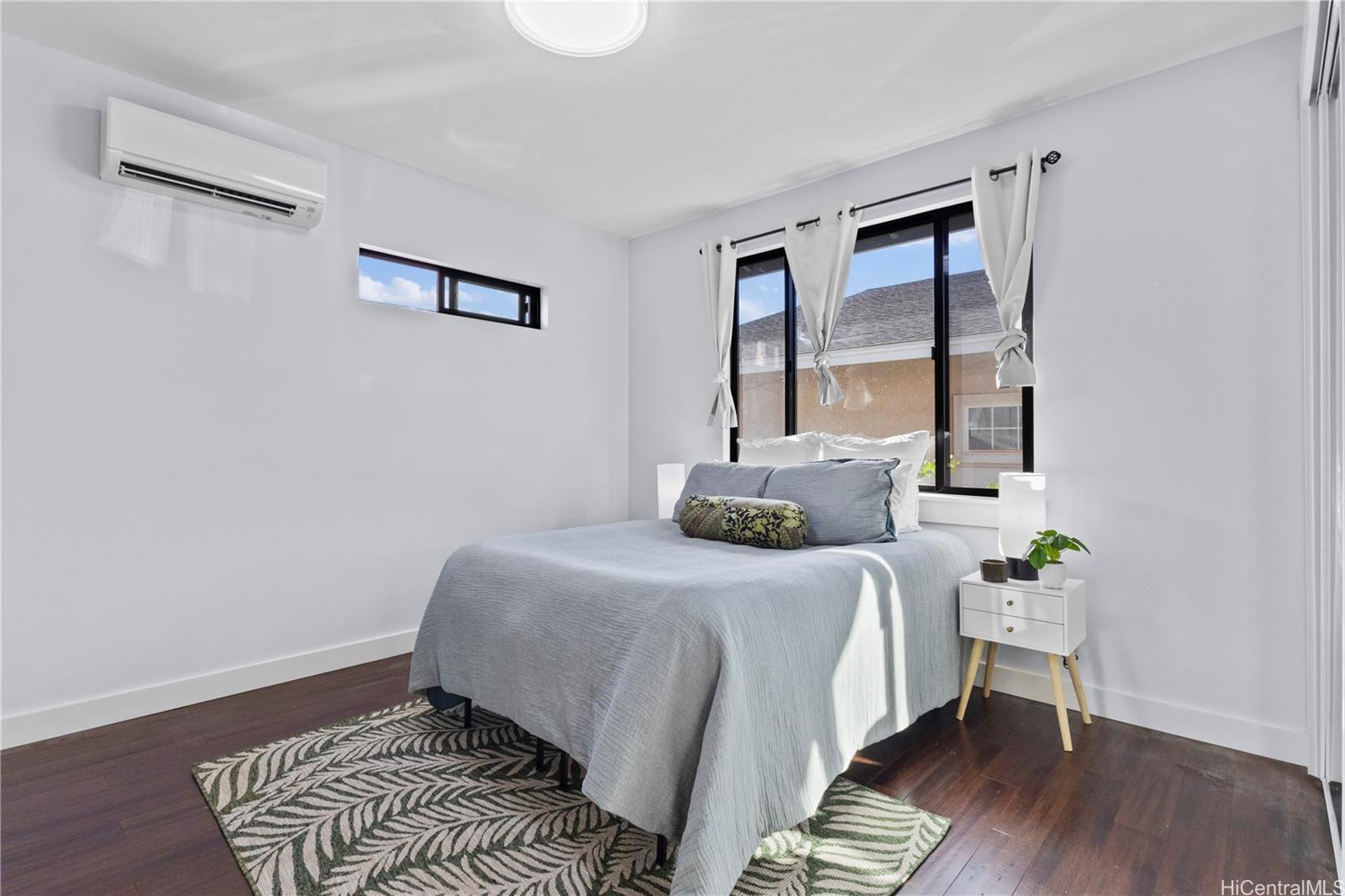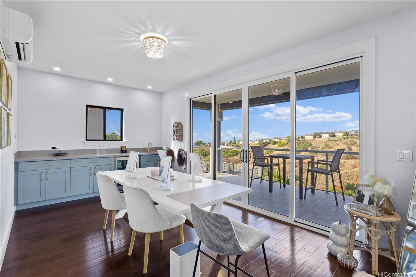 Beautifully built in 2022, this expansive 6BD/6BA Makakilo home sits on a rim lot capturing sweeping city, coastline, mountain, sunrise & sunset views with cool year-round breezes. Open-concept living, dining, and kitchen feature quartz countertops, forced induction range, tile flooring on main level, hardwood upstairs, and 9-ft ceilings throughout.