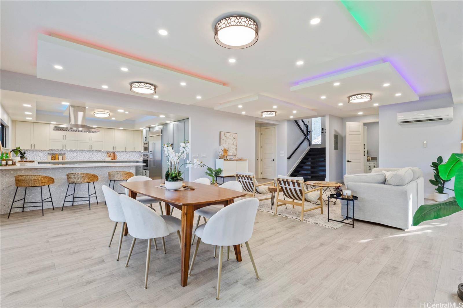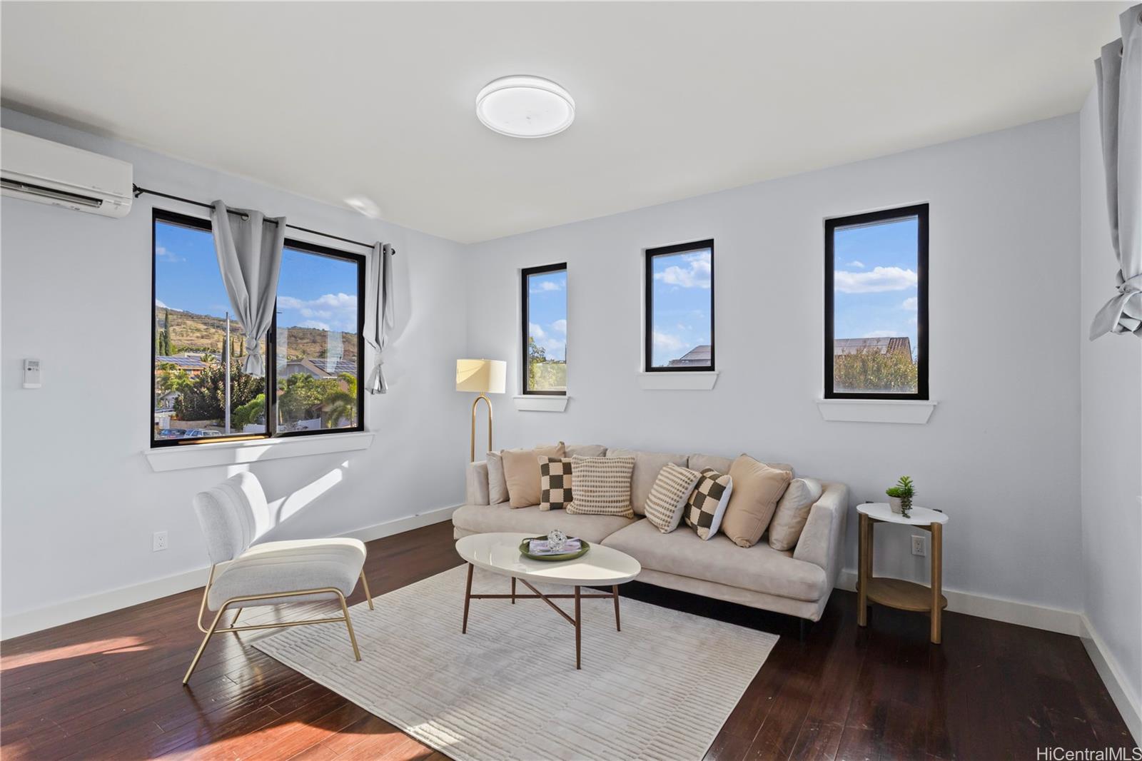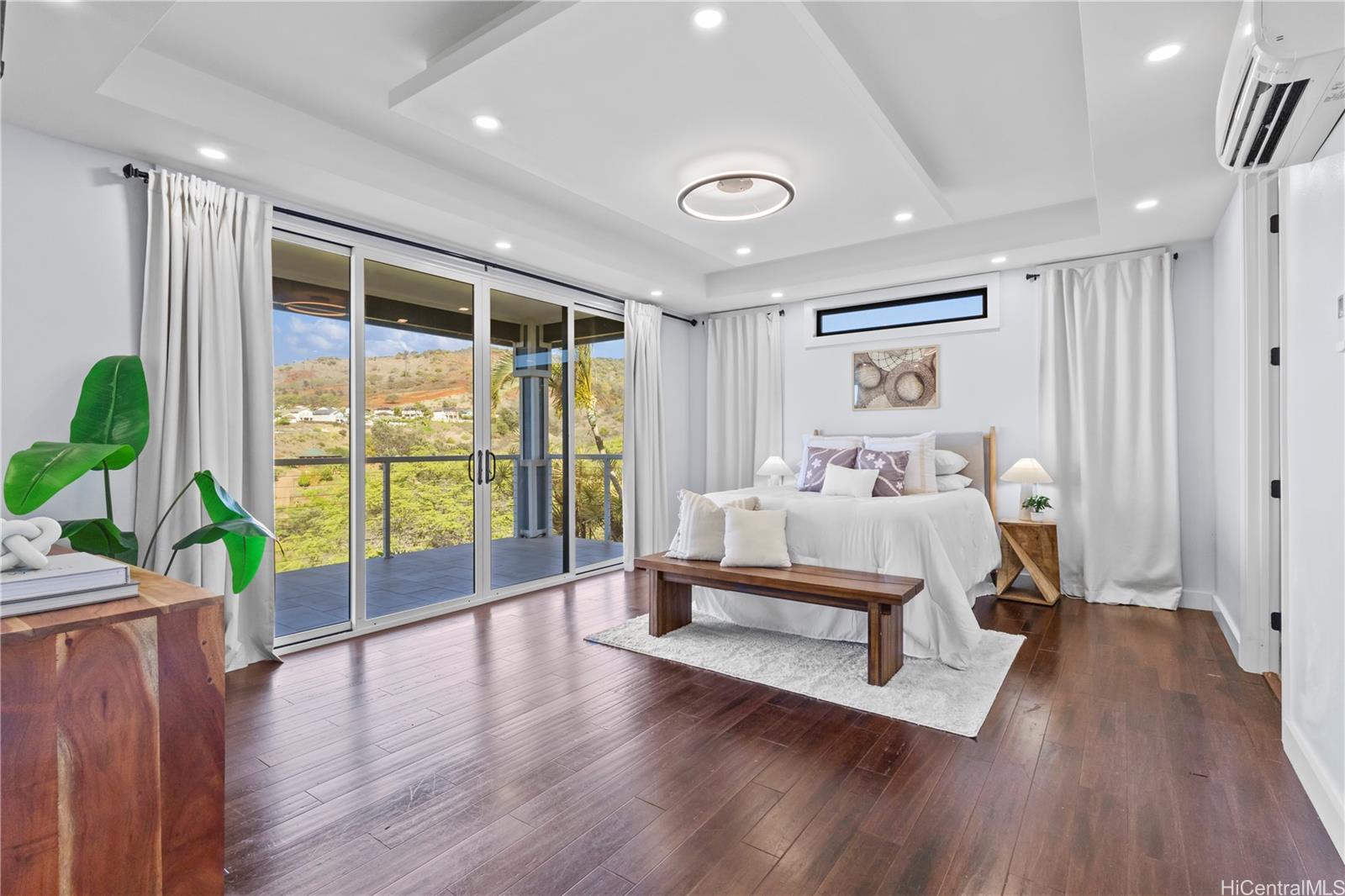 [0] => Beautifully built in 2022, this expansive 6BD/6BA Makakilo home sits on a rim lot capturing sweeping city, coastline, mountain, sunrise & sunset views with cool year-round breezes. Open-concept living, dining, and kitchen feature quartz countertops, forced induction range, tile flooring on main level, hardwood upstairs, and 9-ft ceilings throughout.